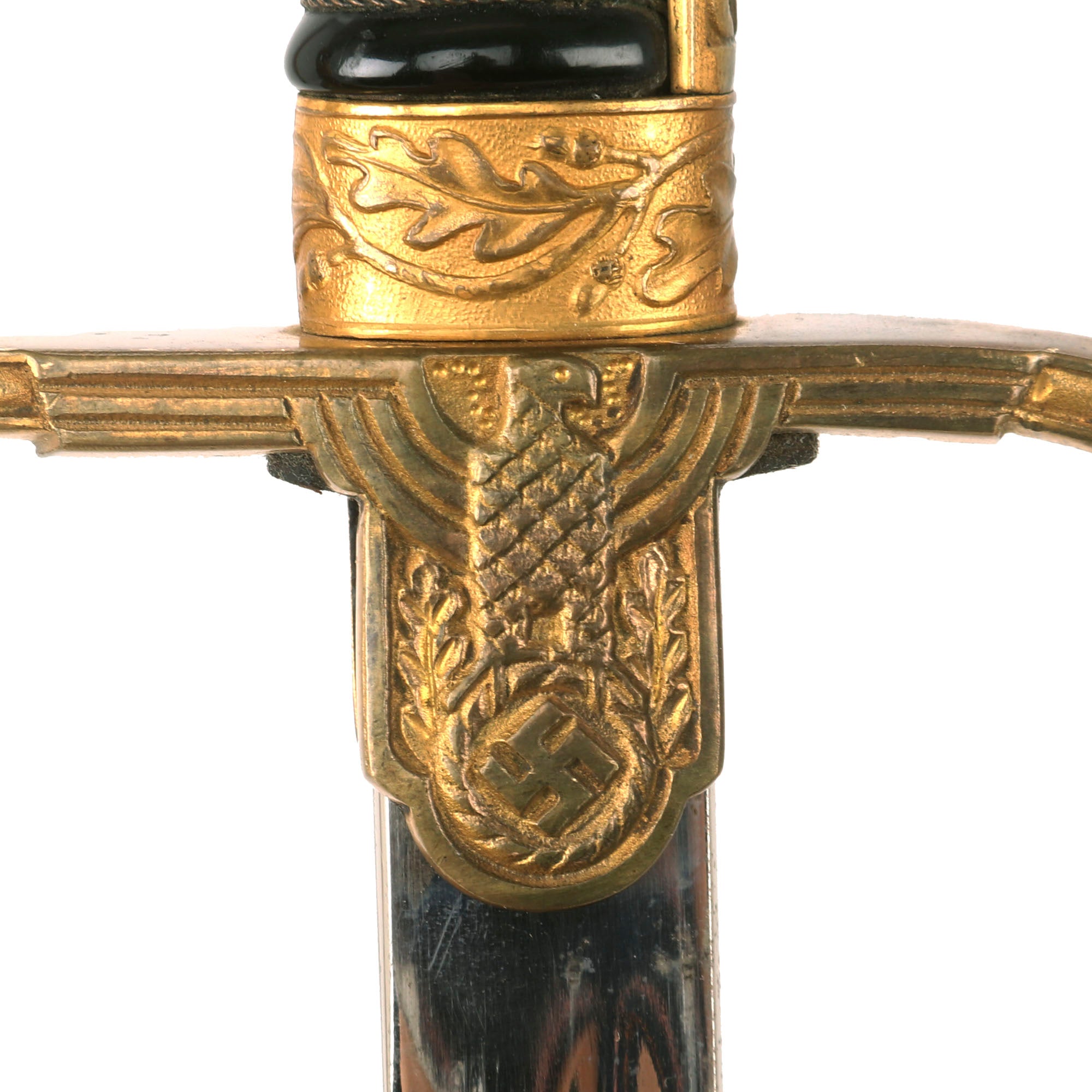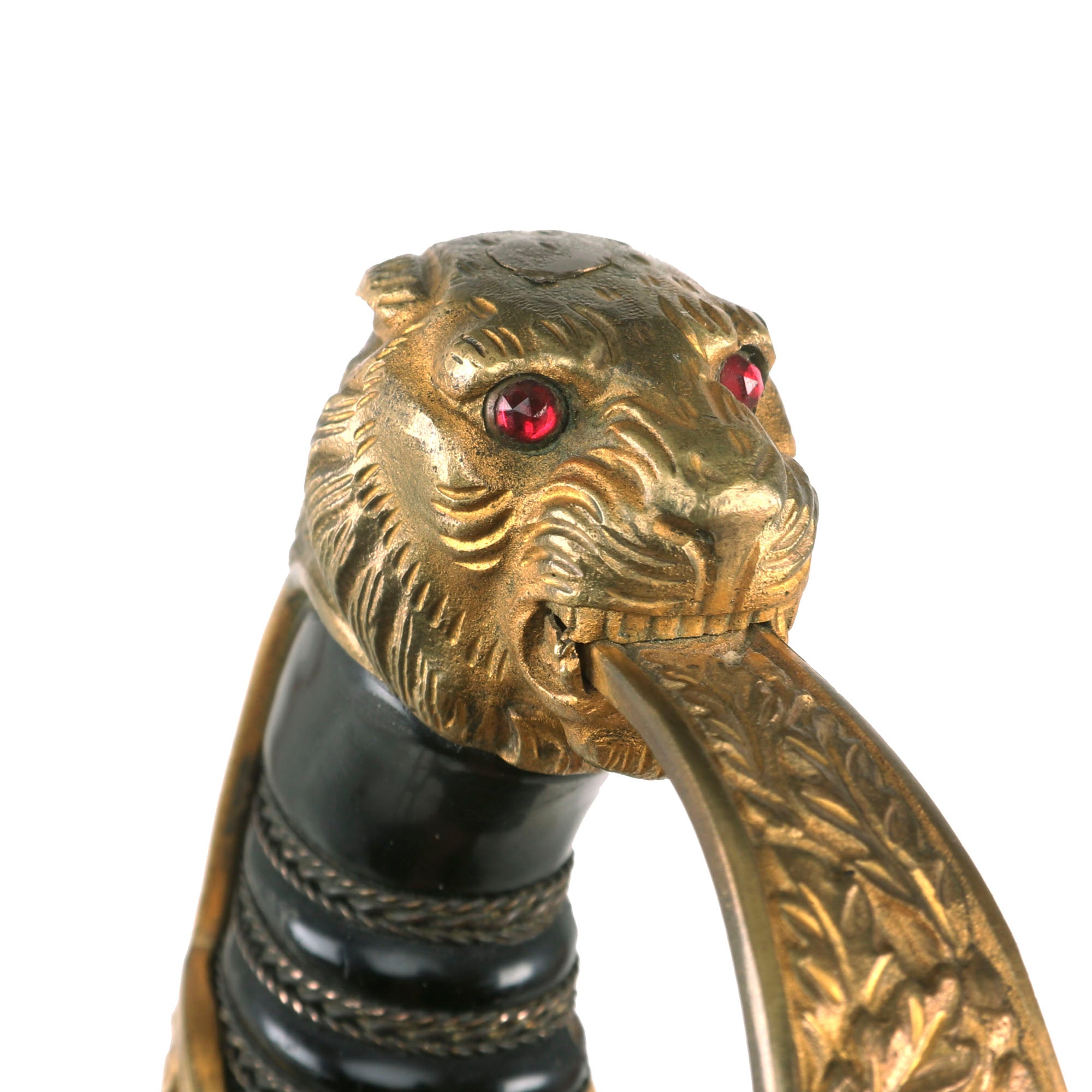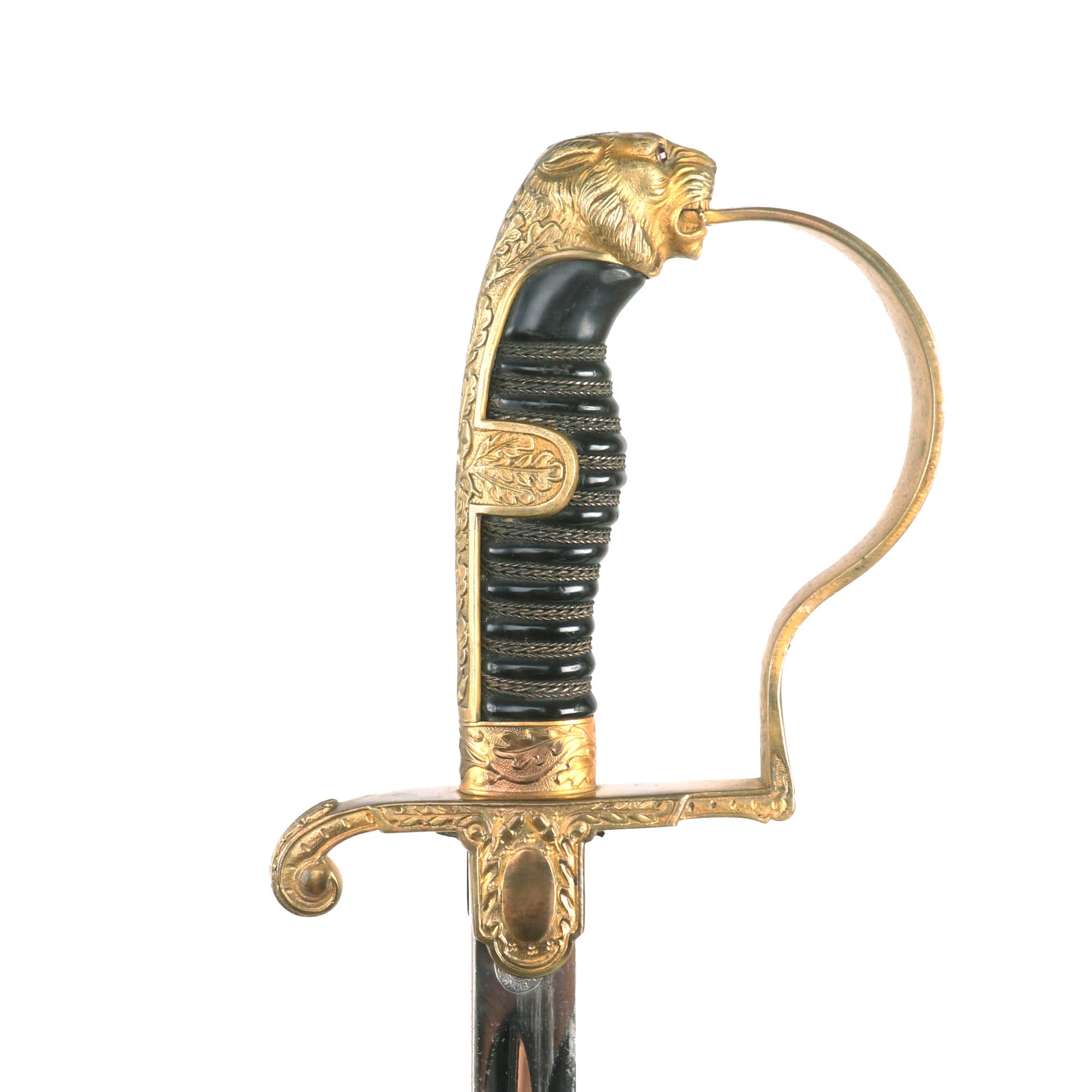 The Lion head is in choice condition, with lots of hand engraving throughout the muzzle, snout, eyes, and mane. The backstrap has elegant raised oak leaves and acorns which extend out to the grip tabs. The "P" guard and ferrule have the same oak leaf motif, and both remain in choice condition. The crossguard extends downward with a curlicue quillon. In the center chappe (rainguard) is an Art Deco style eagle clutching a wreathed mobile swas. The detailing are extraordinary throughout the guard. The reverse chappe has the usual raised plain seal to accept a monogram, but is unmarked.