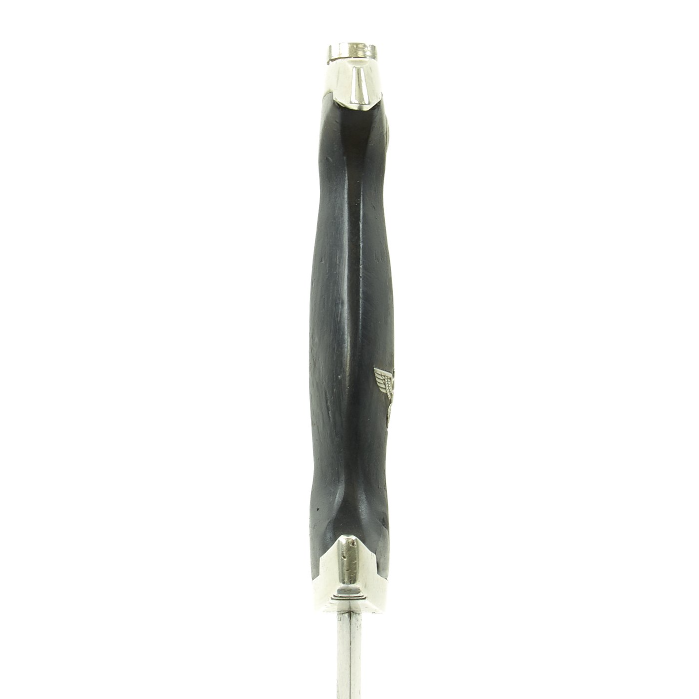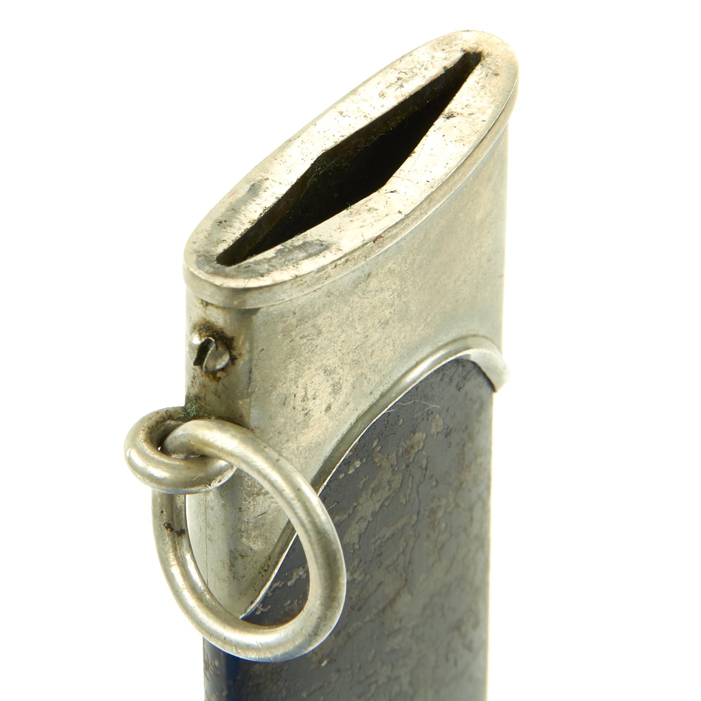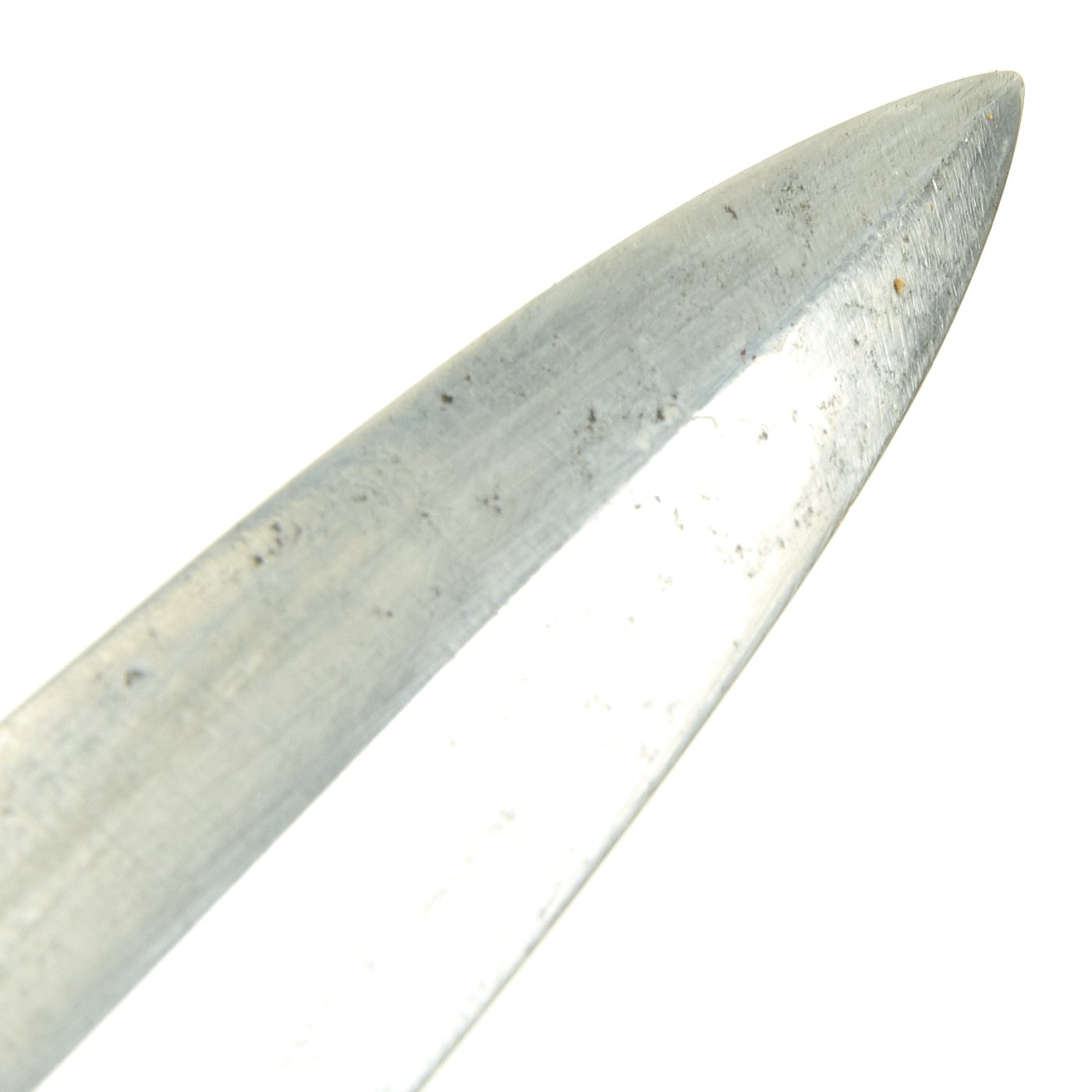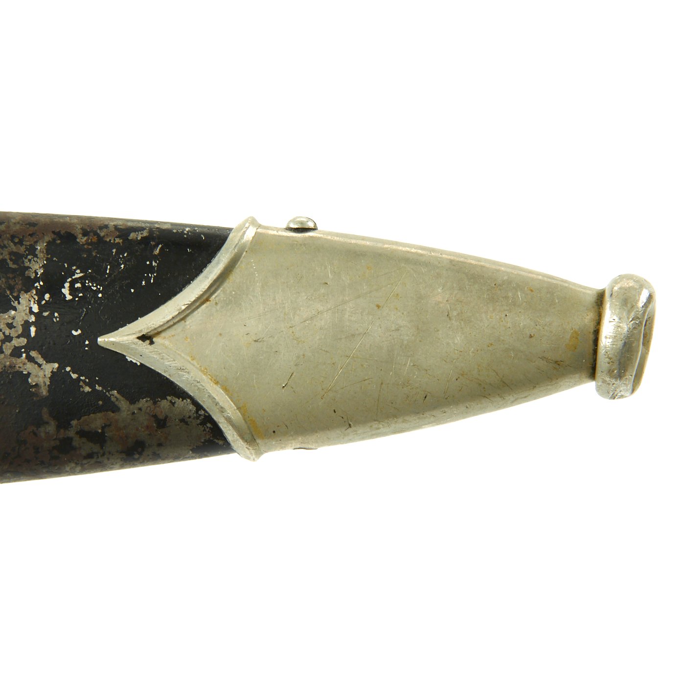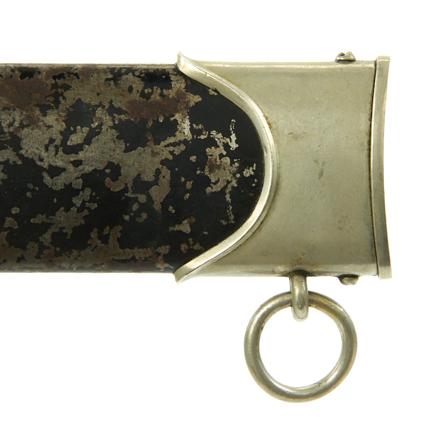 The scabbard shell is a solid example being straight as an arrow with a few small dents. It was originally anodized black steel, but that was at some point long ago painted over with black enamel, which is now chipped away in areas, showing the remains of the original anodized finish. The matching solid nickel silver scabbard mounts are in good condition. The lower ball has been crushed in and is split, due to the weaker nickel alloy used in early models (later ones used steel).