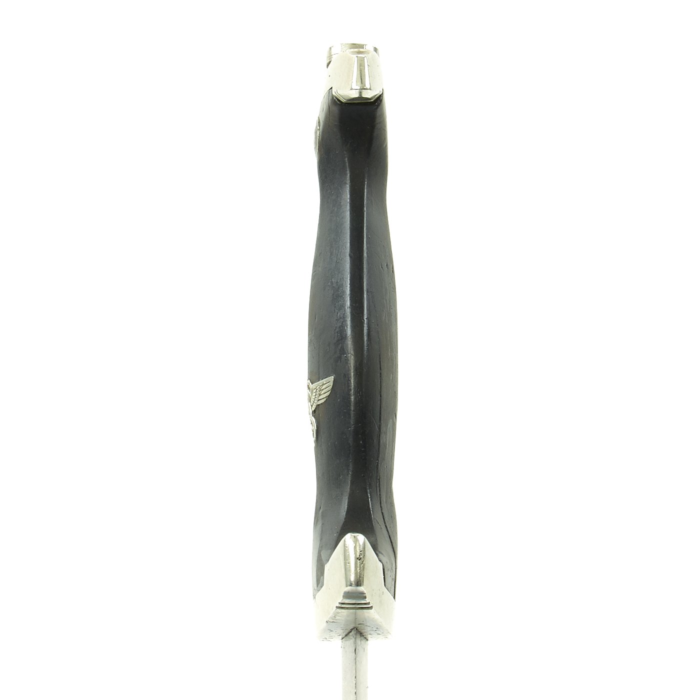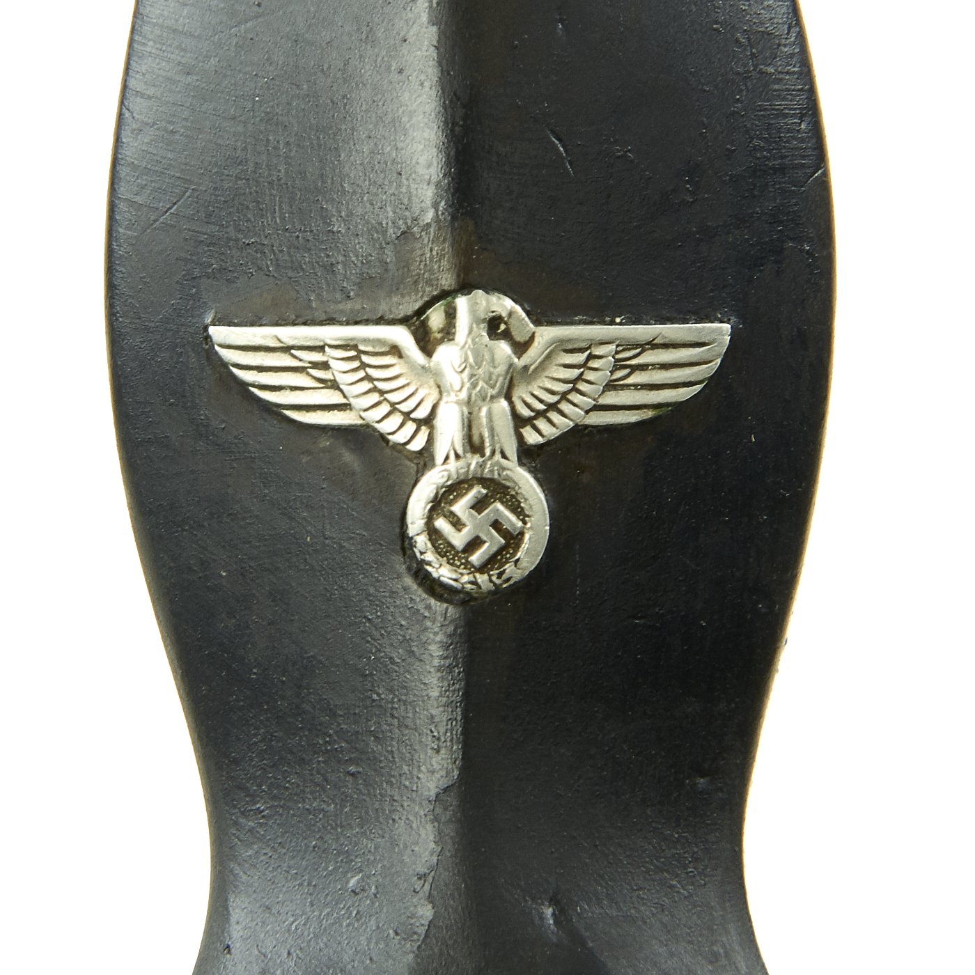 The ebony grip is a nice example showing in good shape, though there are some areas which were cracked/chipped and later repaired. We do not know if this was done at arsenal, but it is most likely post war. The treatment to stain the wood black unfortunately over time makes the wood very brittle, so cracks and chunks missing is common. The symbol button is positioned at about 7:00 o'clock, as it should be. The silvered SS symbol and double circles around them have a nice matching patina with the nickel still intact, with a little verdigris. There is however some chipping in the enamel. The nickel grip eagle is the "high-necked" type with the beak pointing slightly up. It remains in crisp condition, showing little wear to the bird's head, breast and wing feathering and to the talons, wreath or swas.