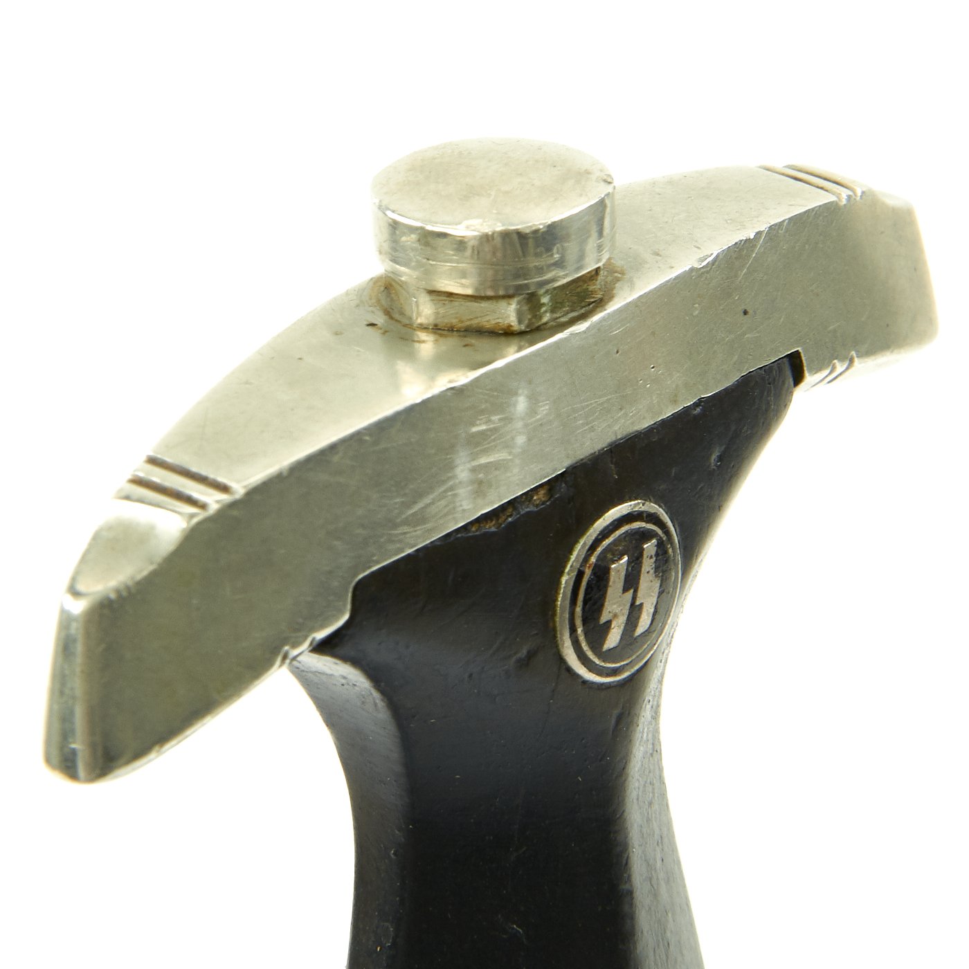 The SS Dagger was equipped with nickel crossguards with an ebony wood grip. The black grip contained a National eagle with swas insignia recessed in the center area and an SS sigrunne button inset at the top. On early examples the scabbard shell surface was factory blackened using a metal bluing process. The scabbard had nickel mounts. The SS blade was a polished type containing the SS motto, Meine Ehre Heisst Treue (My Honor is Loyalty). Early examples bore one of three district stampings on the lower reverse crossguard of I, II, or III. Early examples were mostly hand-fit. Production of later examples was more standardized, using cheaper, nickel-plated fittings with black painted scabbard shells. They could be held with a standard belt hanger, or a much rarer vertical hanger.