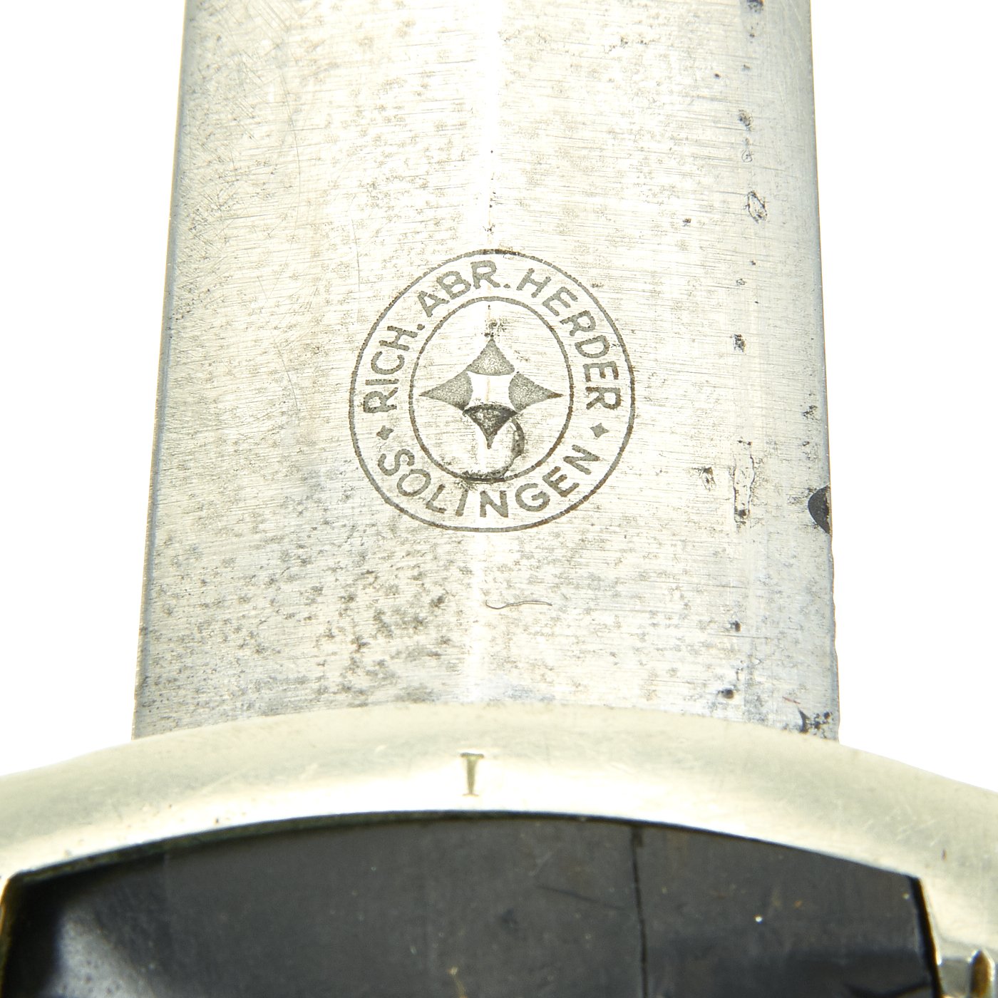The Herder name is well known in Solingen, and this branch originally registered in 1884 as a steelware maker. As time went on they specialized in Drop Forging, and supplied blade blanks to Erfurt Arsenal and other companies. During the Third Reich period, they continued to make their own edged weapons, as well as supply blades to smaller makers. The "oval" style trademark was specifically used on the blades of early SS and SA daggers made during the Third Reich, per J. Anthony Carter's work GERMAN KNIFE AND SWORD MAKERS.