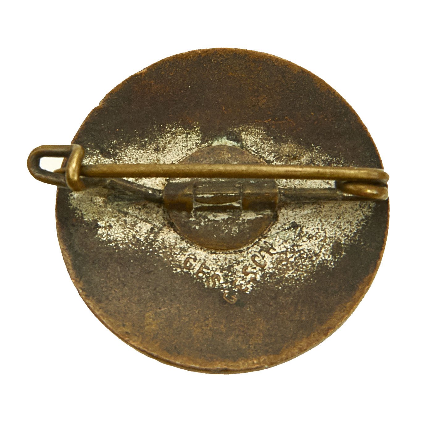 This example is a standard issue membership badge, awarded to all personnel on acceptance as an official party member. It is a 24mm diameter, die struck brass alloy NSDAP membership badge with multi-colored enamel work. The badge features a translucent red, circular outer border with embossed silvered script, NATIONAL-SOZIALSTISCHE-D.A.P., encompassing a white enamel field with canted black enamel Swas (swas). In very good condition, the plating is however completely worn away on the front, with some remaining on the back. Overall very good condition enamel with some chipping around the edge, and the back has a very nice "safety pin" style attachment, which would work on any type of clothing.