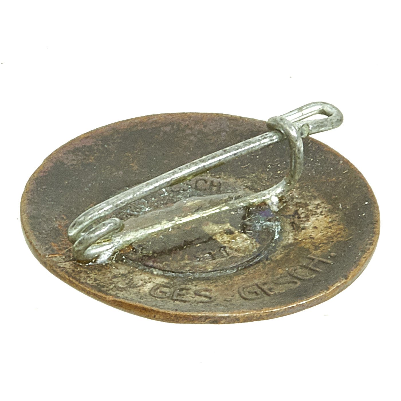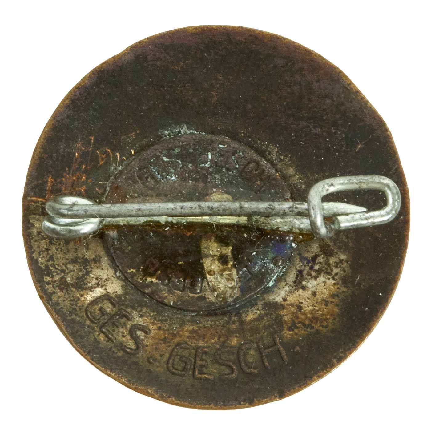 The "GES. GESCH." is short for Gesetzlich Geschützt (Protected By Law), indicating that the pin was a trademarked design. There is however no maker mark or contract number, so this was made sometime pre-1934, or possibly just as the system was being enacted.