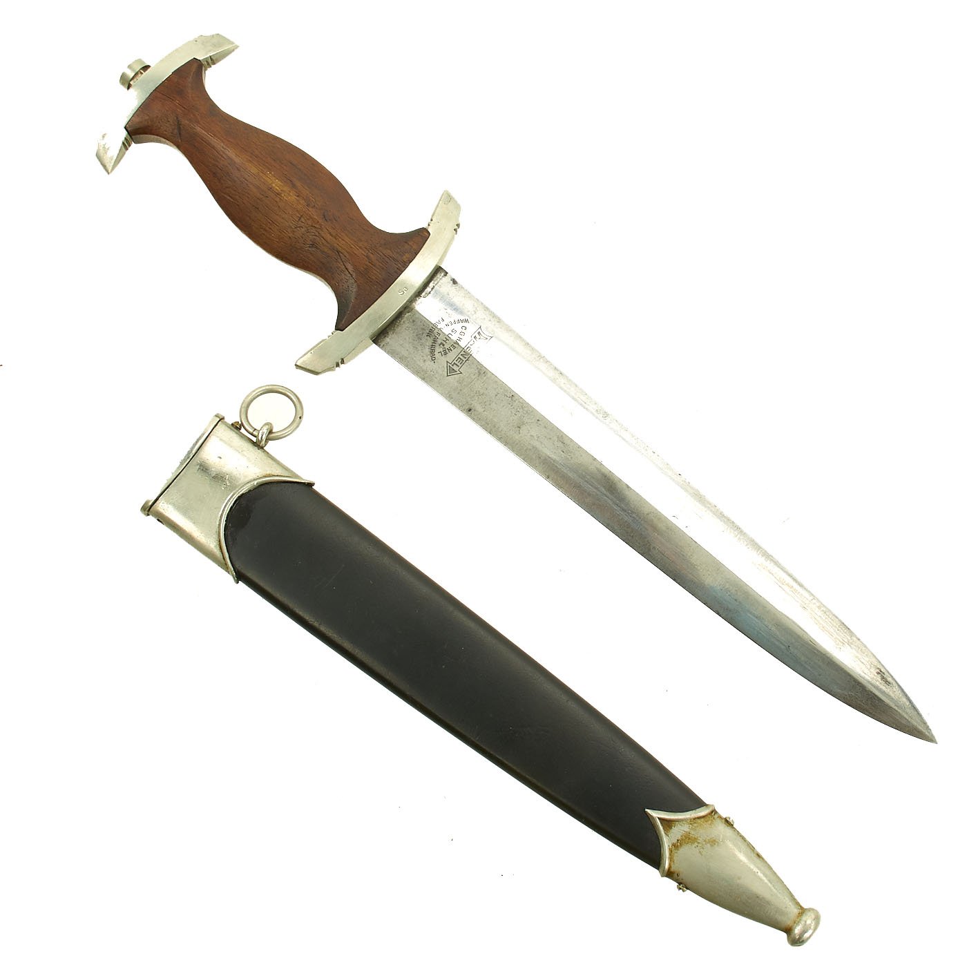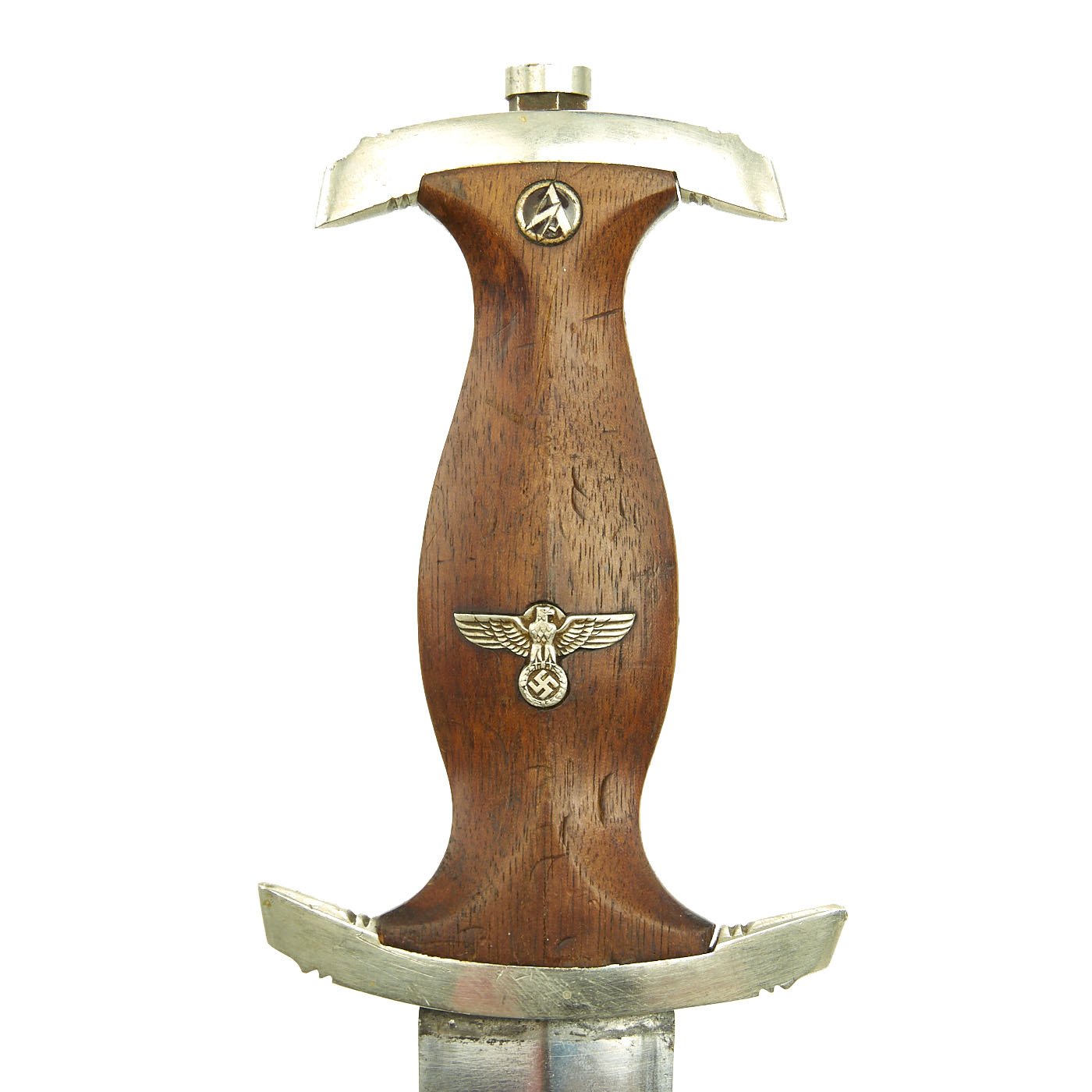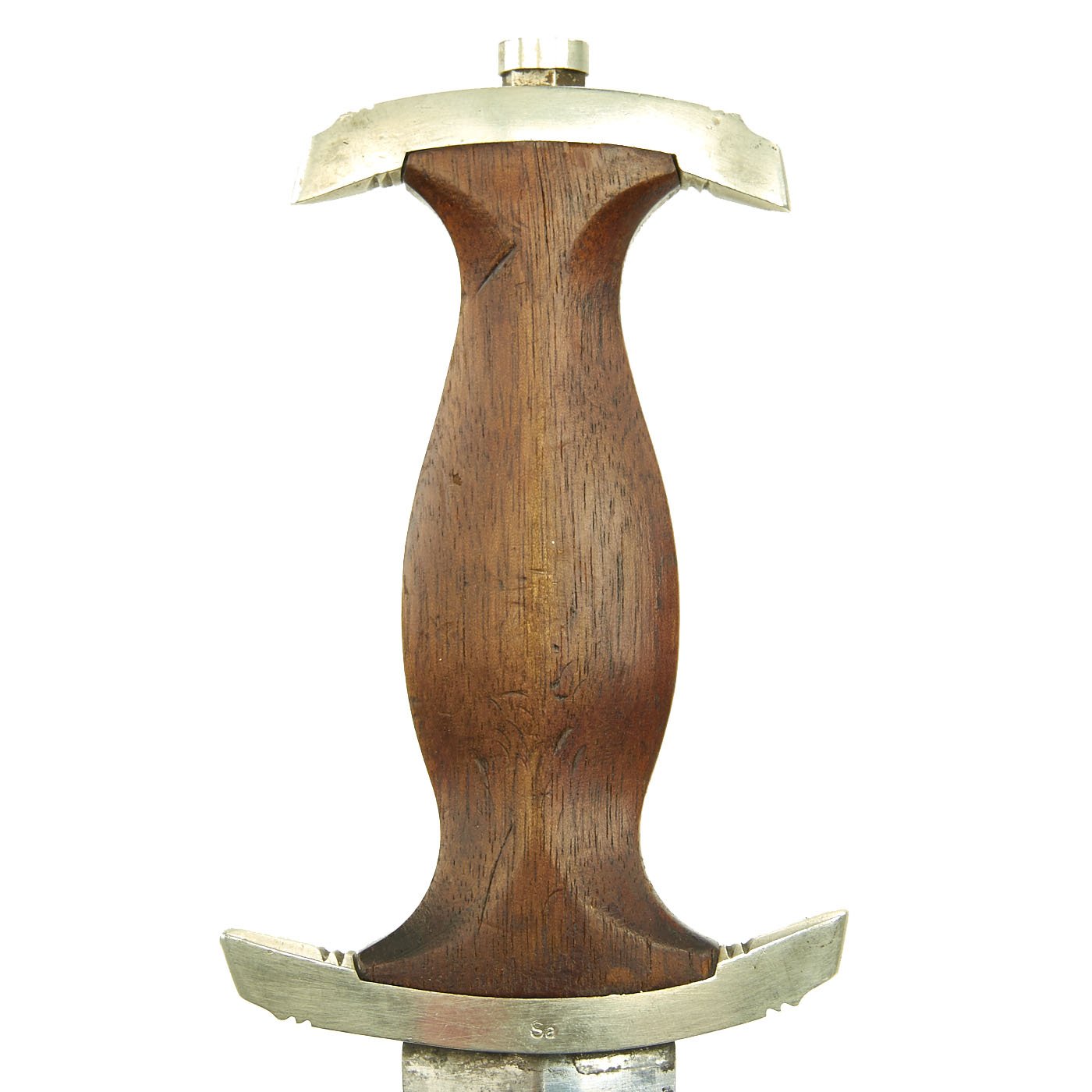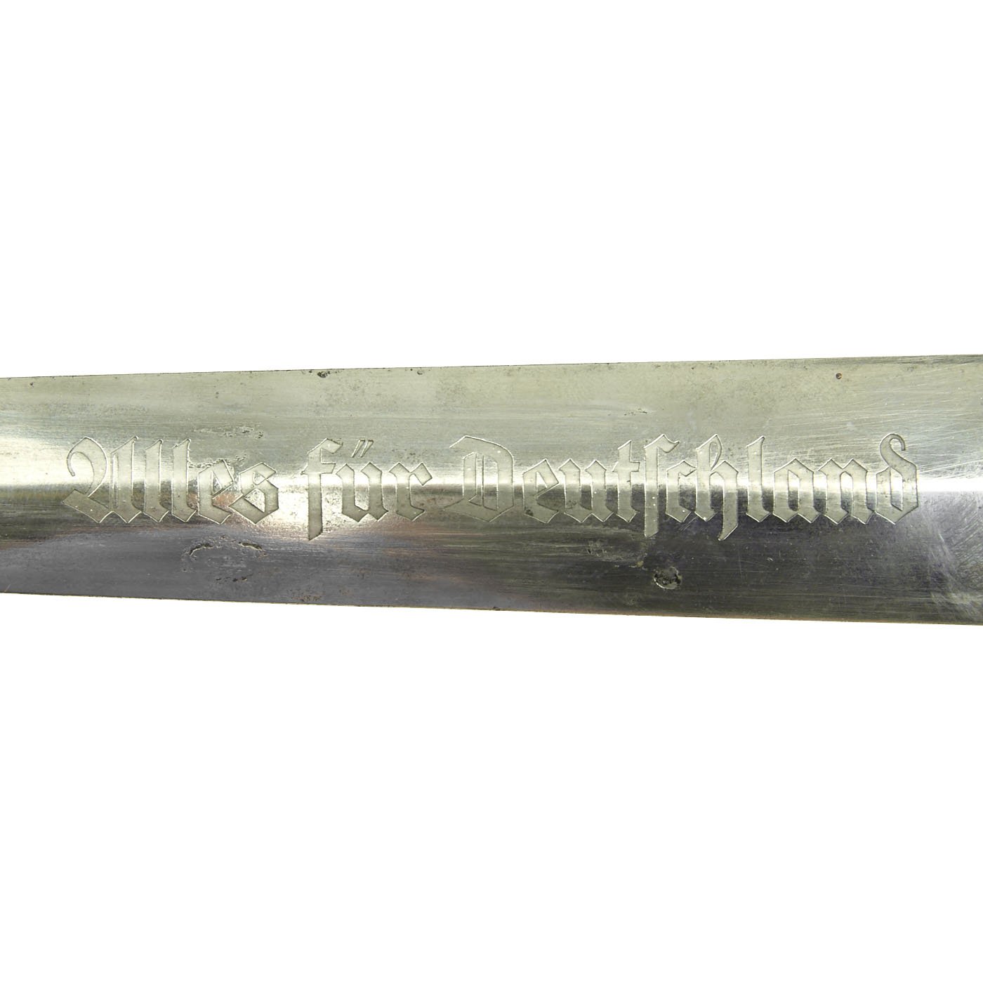 The blade was etched with the SA motto, Alles für Deutschland. Examples produced prior to 1935 were stamped with the German sector of the SA group on reverse lower crossguard. Later examples underwent standardization through the RZM ministry. These pieces were produced of cheaper plated zinc-base fittings and scabbards were simply painted brown.