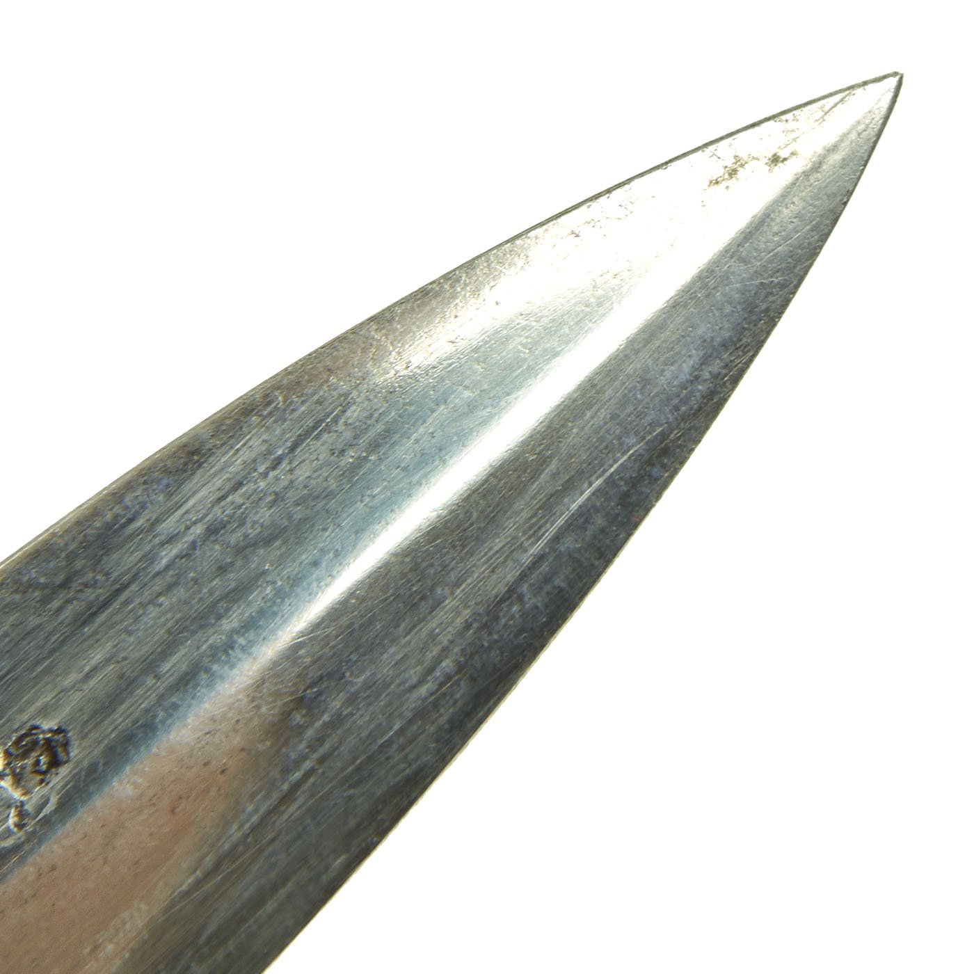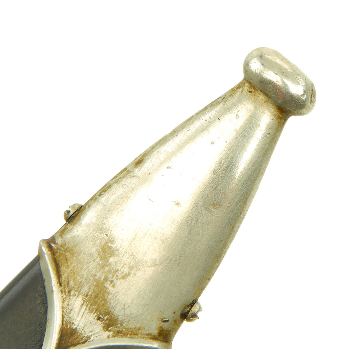 The brown hardwood grip is in very good condition with no cracks or chips. The solid nickel-silver eagle is crisp with a perfect fit. The SA roundel also has a perfect fit and retains most of its enamel, though it is stained around the edges. The pommel and cross guard are fine solid nickel silver examples, and the pommel nut shows no signs of being "messed with". The lower reverse guard is Gruppe/Gau marked Sa, for Sachsen (Saxony), corresponding to the historical Kingdom of Saxony, with Dresden as the major city. This feature was only seen on daggers produced 1935 and prior.