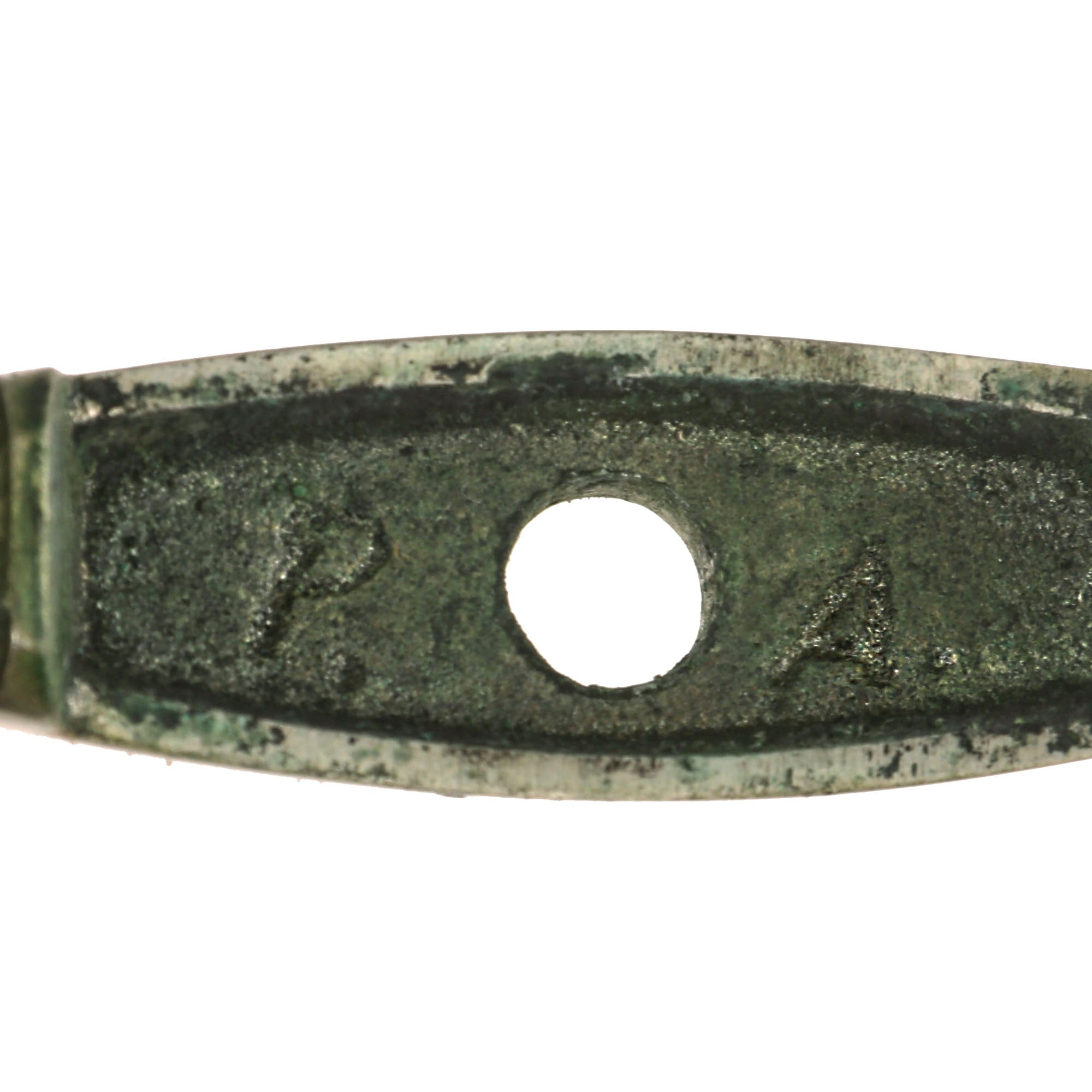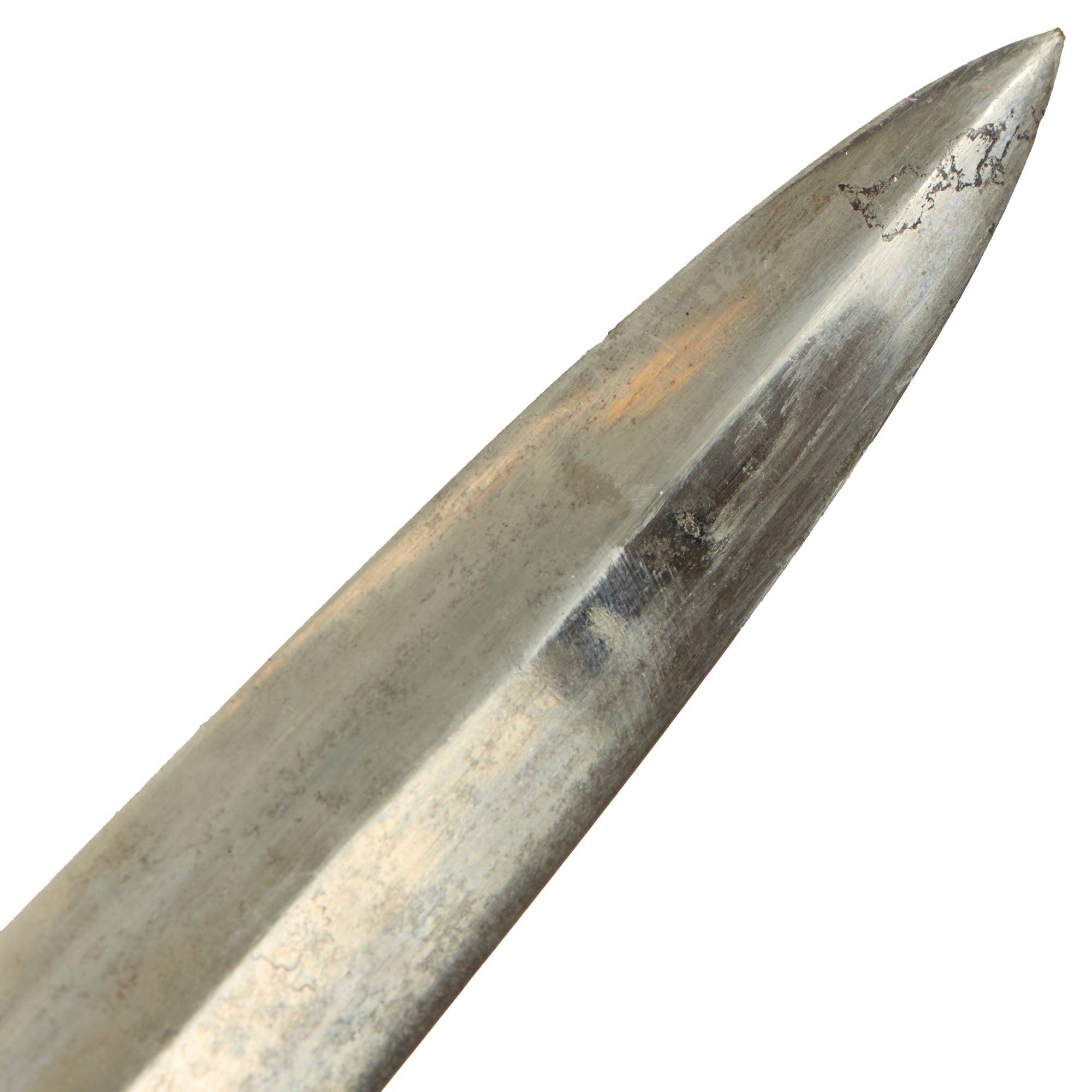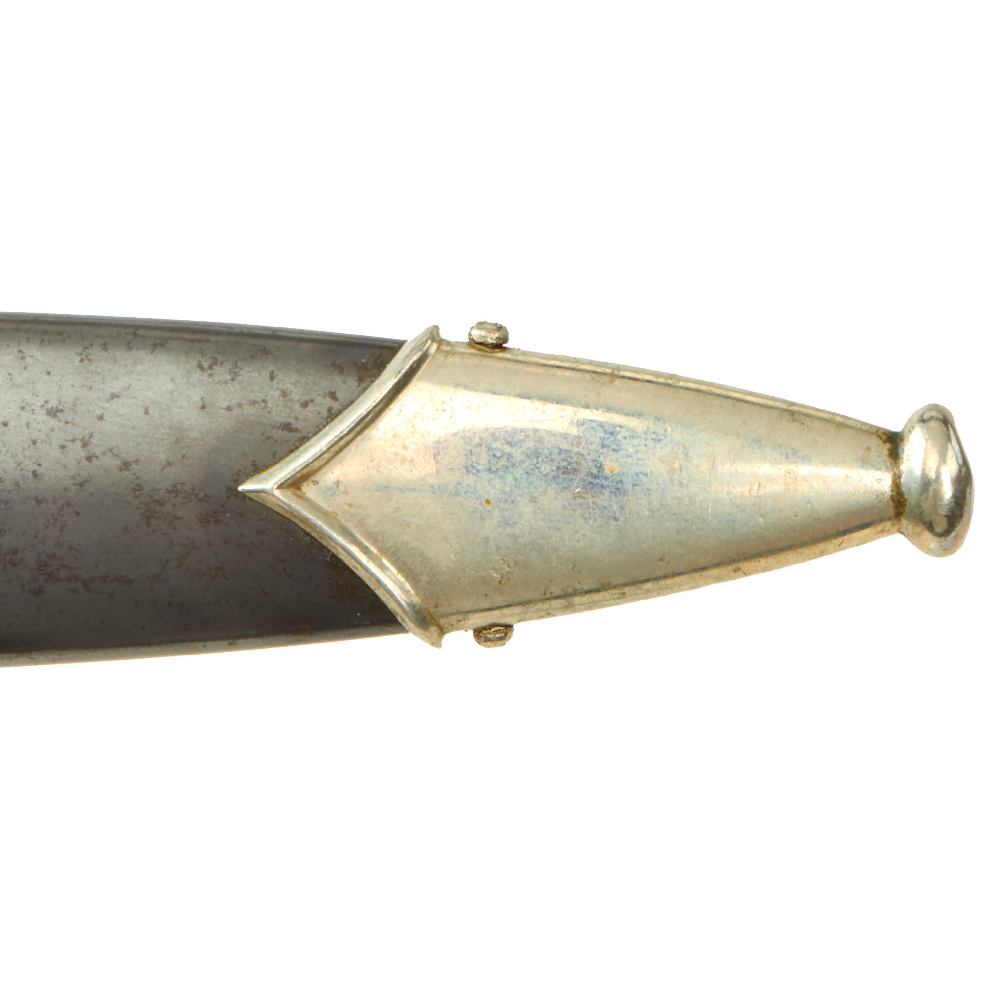 The scabbard shell is a solid example, with a straight steel shell showing little to no denting or other damage. The shell originally had a black "anodized" blued finish, which was then lacquered to protect it. This example has had most of the lacquer wear away, however the anodized finish is still very well retained overall. There are scattered small spots of oxidation, but nothing more. The matching solid nickel silver scabbard mounts are in good condition, with a lightly oxidized patina. The lower ball is a bit dented in, common with the softer nickel alloy. All four dome headed screws are still present and in good shape.