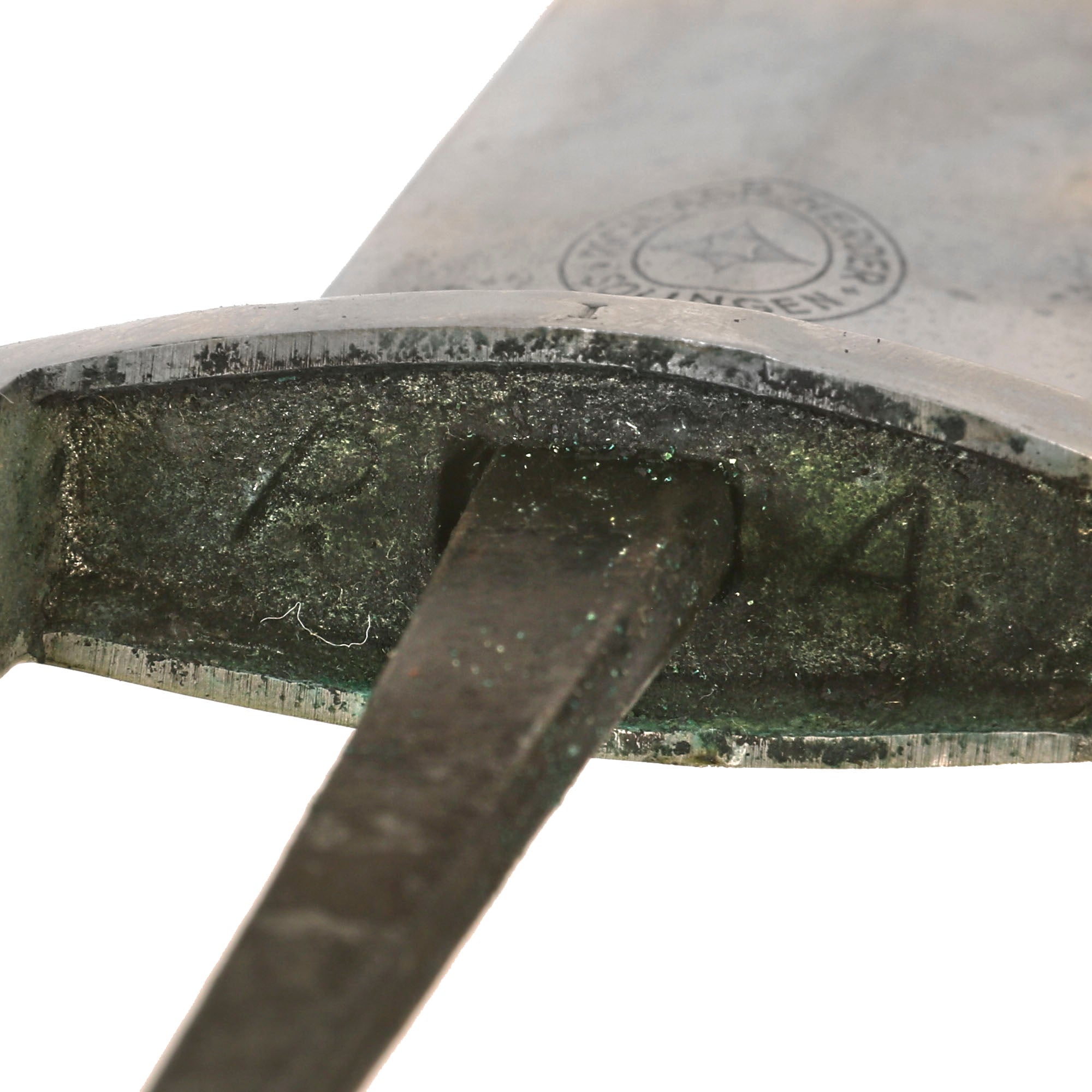 The reverse of the blade, like the front, has been cleaned and polished, and the cross grain is really only apparent on the last inch or so closest to the cross guard, where the maker logo is. Sighting down this side of the blade however shows clear variations in the surface level, starting 2 1/2 inches from the tip to just above the logo. We believe this is because it was originally issued with the inscription "In Herzlicher Freundschaft Ernst Röhm" (In heartfelt friendship Ernst Röhm) on the back. It was then returned to the factory or retailer, where the entire rear of the blade was re-ground, removing the all of the etched signature, which required removing a bit more of the blade where the signature took up more space.