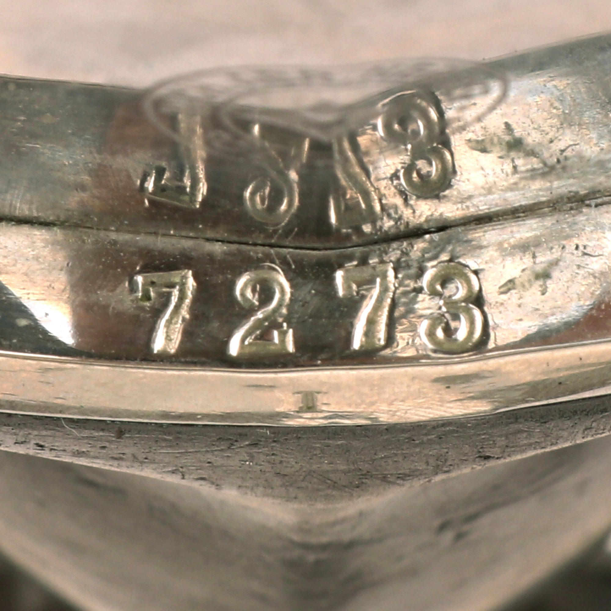 The crossguards of this dagger and tang nut are in good condition throughout, and are of the earliest solid nickel silver construction. They have smooth surfaces, good crisp edges and precise accent grooves. They show just a bit of oxidation, which gives them a "warm" look, opposed to the cold "blue" look of chrome plating. The cross guard is marked with a Roman numeral I on the side, for the third SS district. There is also the number 7273 marked on the rear top of the guard, the serial number of the SS Mann who it was issued to, a great opportunity for further research! There is no lifting of the finish, showing these are indeed solid nickel silver. Per a customer request, we checked the inside of the guards, and both are marked P. A. on the inside, as with other examples we have handled from Herder.