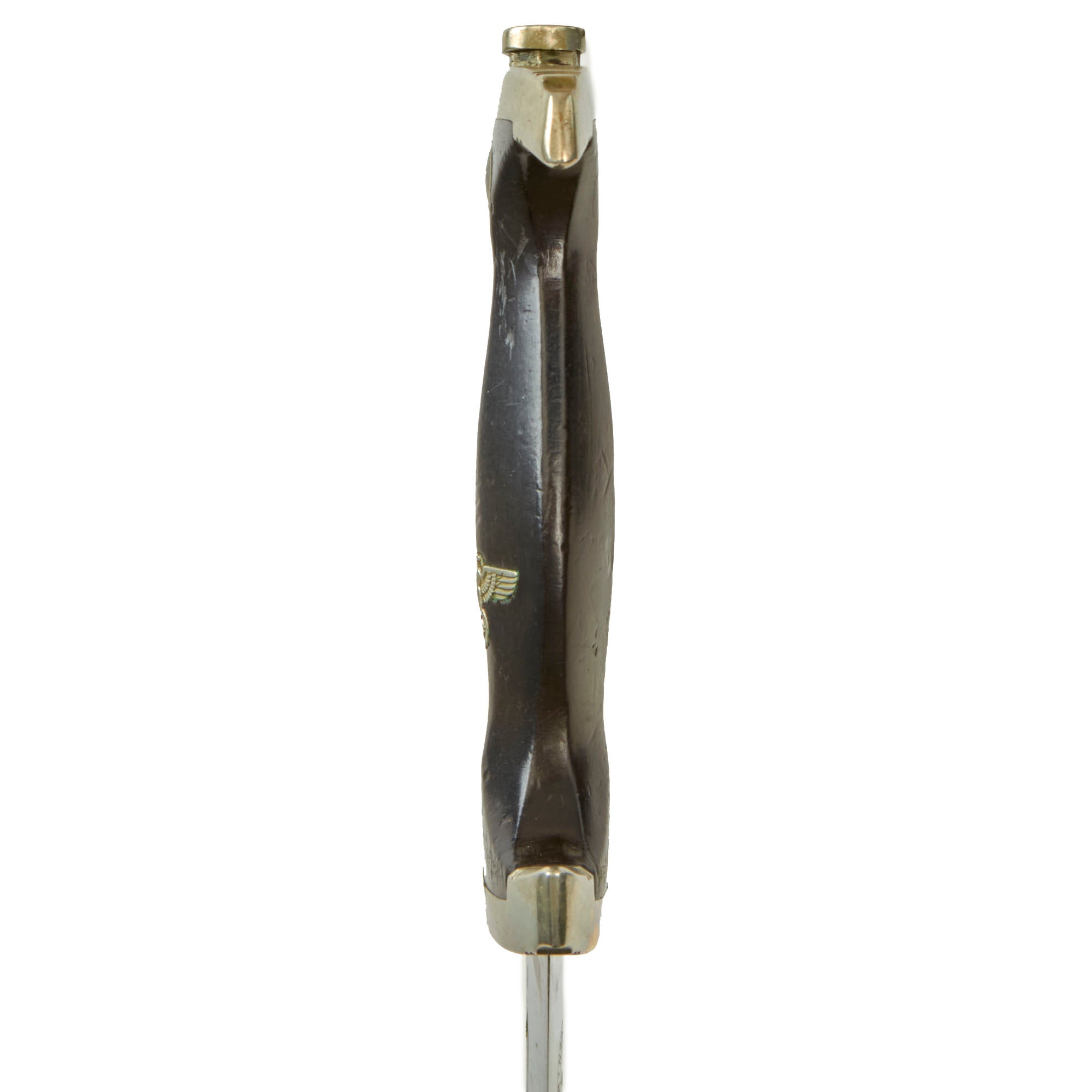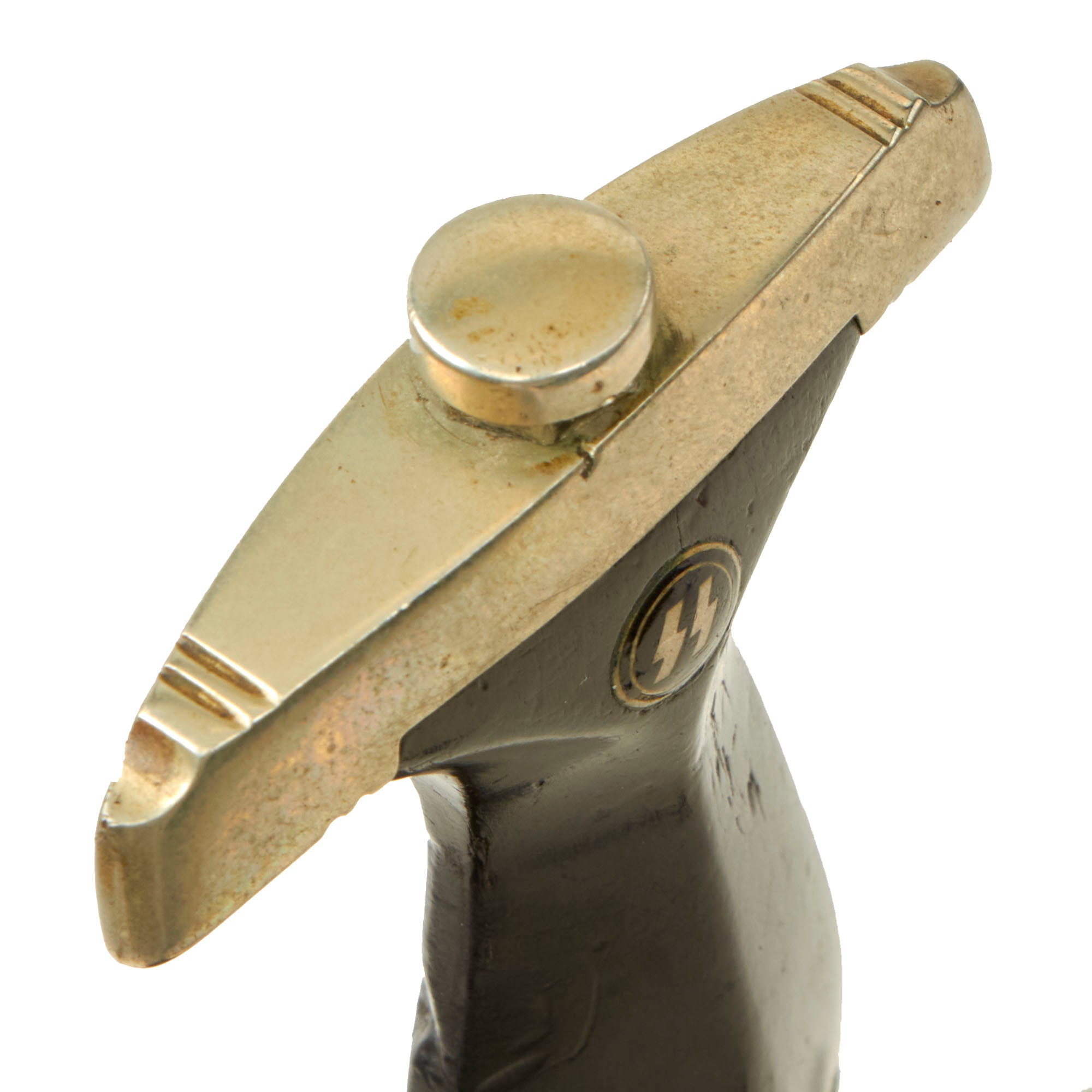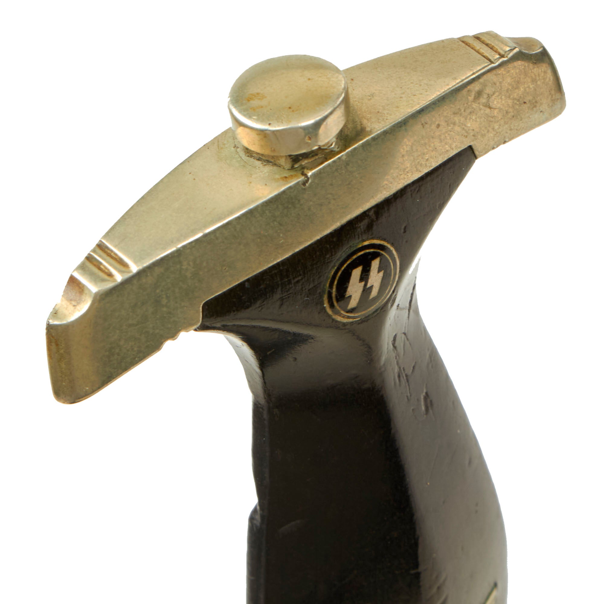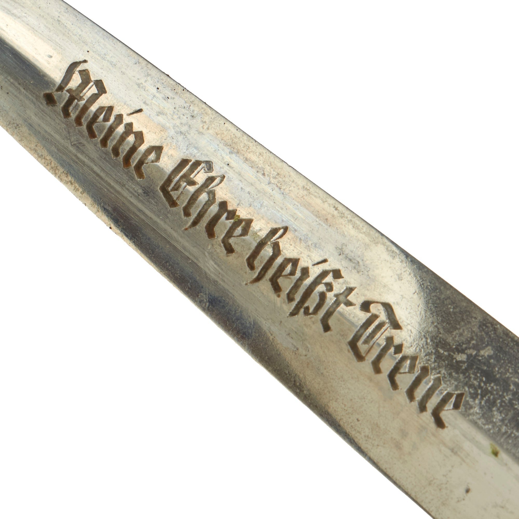 Other than the inscription, these pieces were identical to the standard M1933 SS dagger. After the Röhm purge in mid 1934, the inscription was ordered to be removed, and failure to comply would be considered treason. Some were simply ground in the field by whatever means were available. Many other examples, as we suspect this is one of, were returned to the factory or retailer for grinding and refinishing. Often, this would remove the maker logo as well, however the logo on this example is still partly present. Examples will occasionally be encountered with remnants of the original inscription remaining on the blade, but mostly none will remain. Some blades exist with an intact inscription, exhibiting only the removal of the Röhm signature. Very, very rarely is an example seen with a full, untouched inscription, as the holder would have surely risked a charge of treason.