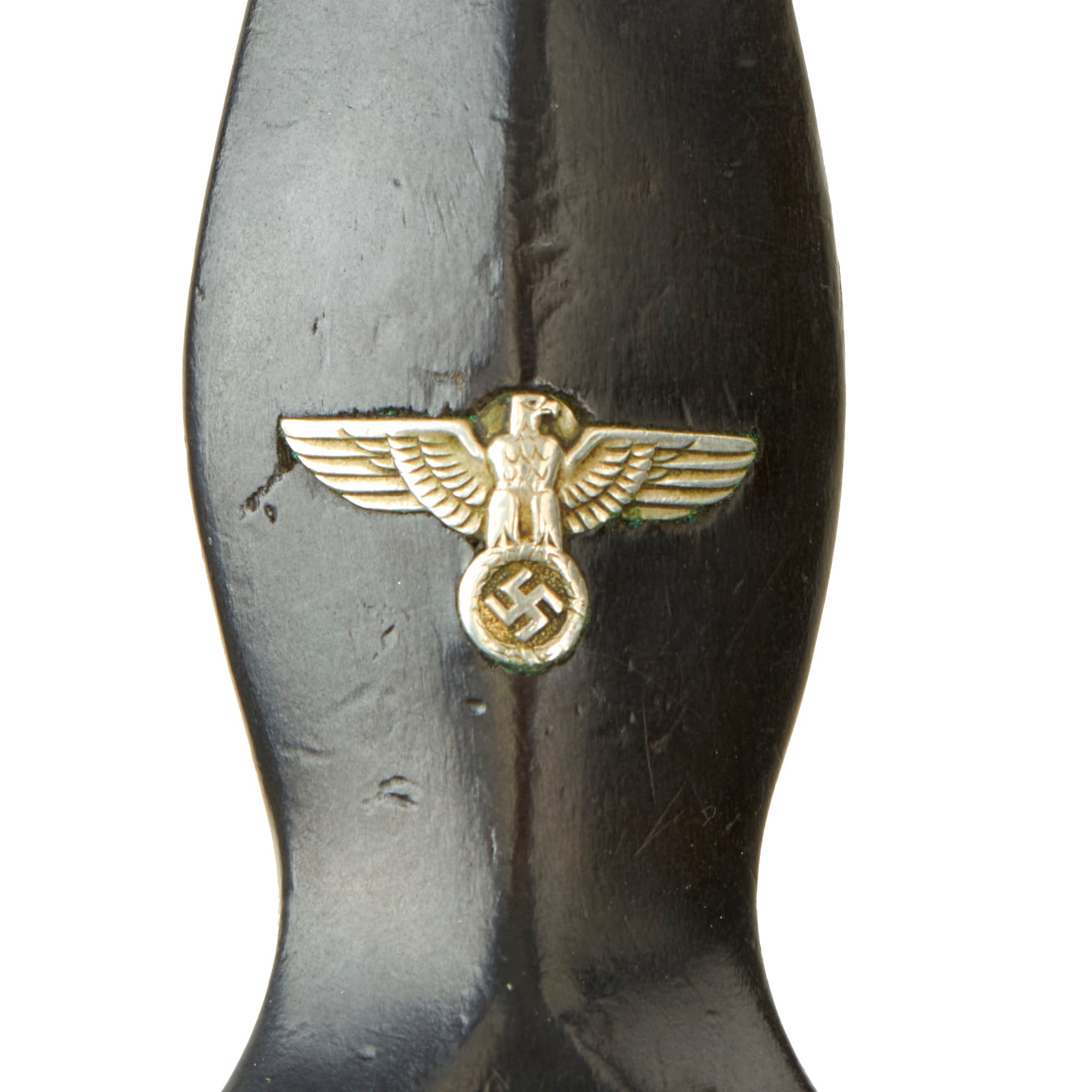The ebony grip is a nice example showing in very good shape, showing wear consistent with service, but no major chunks missing. There are some hairline cracks on both sides near the pommel guard, and also pressure denting on the wood, with a small gouge on the side, which has been smoothed out. The ebony wood is unfortunately brittle, and the treatment used to give it a uniform look exacerbates this. The color is very good, and wood grain can be seen. The symbol button is positioned at about 7:00 o'clock, as it should be. The silvered SS symbol and double circles around them have a nice matching patina with the nickel still intact, with a little verdigris and complete enamel. The nickel grip eagle is the "high-necked" type with the beak pointing slightly up. It remains in crisp condition, showing little wear to the bird's head, breast and wing feathering and to the talons, wreath or swas.