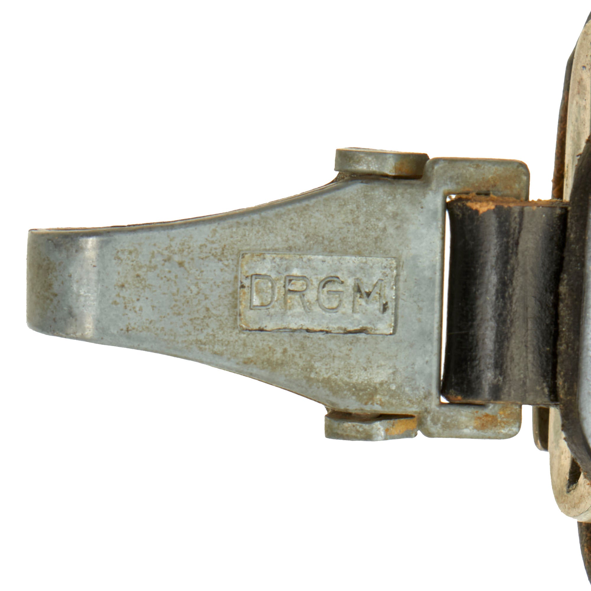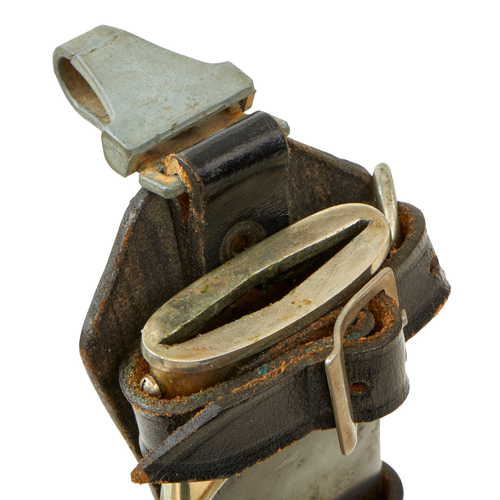 The scabbard is held securely in the extremely rare leather vertical hanger, topped with a zinc alloy hanger clip. The leather is in very good condition, showing just a bit of finish wear on the securing strap, which features a plated steel buckle. There is no maker marking we can see, just DRGM on the back of the clip, indicating that it is a design protected by German patent law. These are extremely rare in any condition, but especially when they are fully intact.