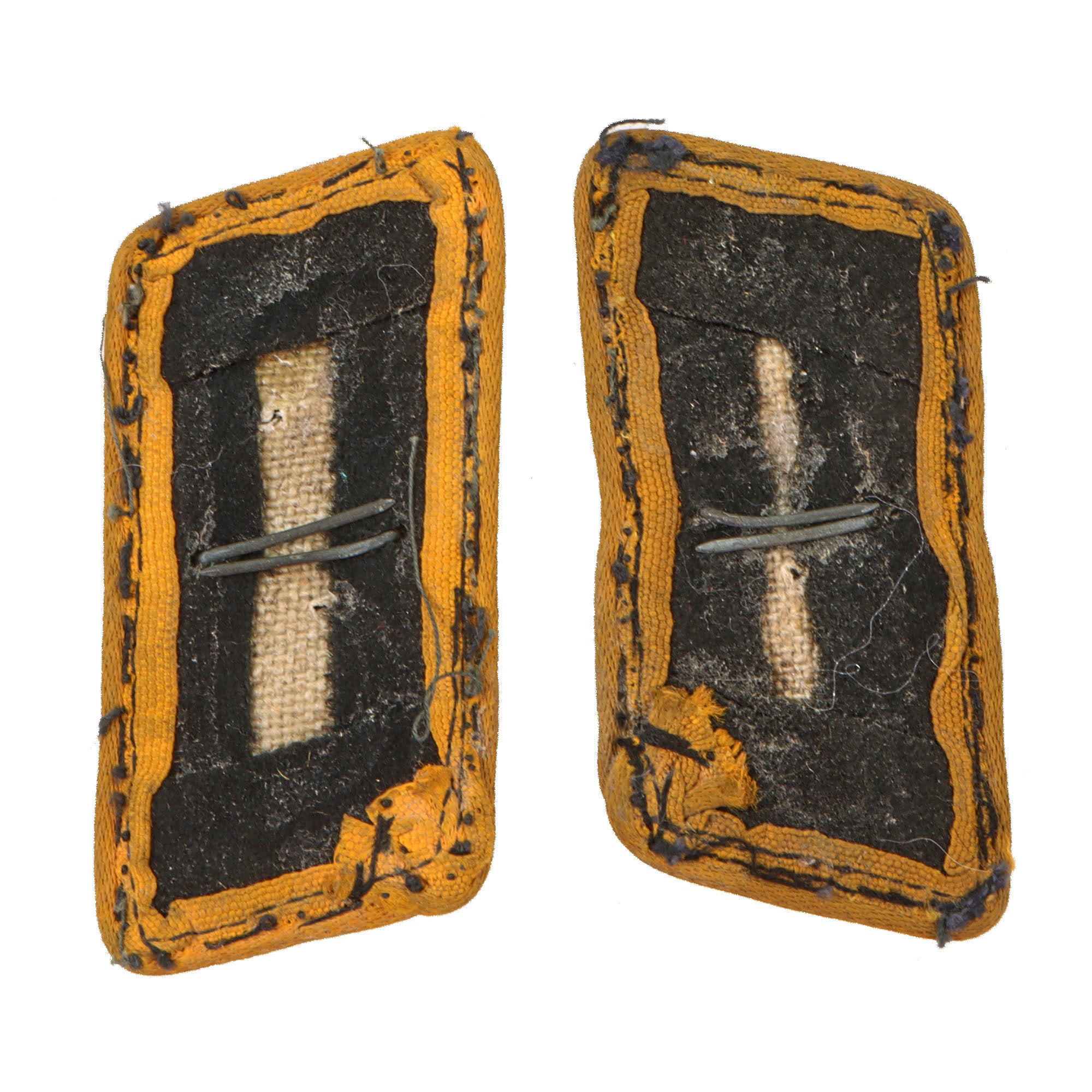 Here we have a very nice service used right and left pair of German WWII Panzer EM/NCO Kragenspiegelen (Collar Tab), cut off from a Panzer uniform. These are the early pattern, featuring a black wool body with an internal buckram stiffener, and Goldgelb (Golden-Yellow) piping around the edges, the Waffenfarbe (corps color) for Panzer Aufklärungs (Armored Reconnaissance). In the middle of the tabs are great "Danziger" style Totenkopf (Death's Head) insignia, which looks to be made from zinc, probably with plated brass securing claws. We had considered that these might have been "Signals" tabs, but looking under the edge of the piping on the back shows that it is definitely gold yellow.