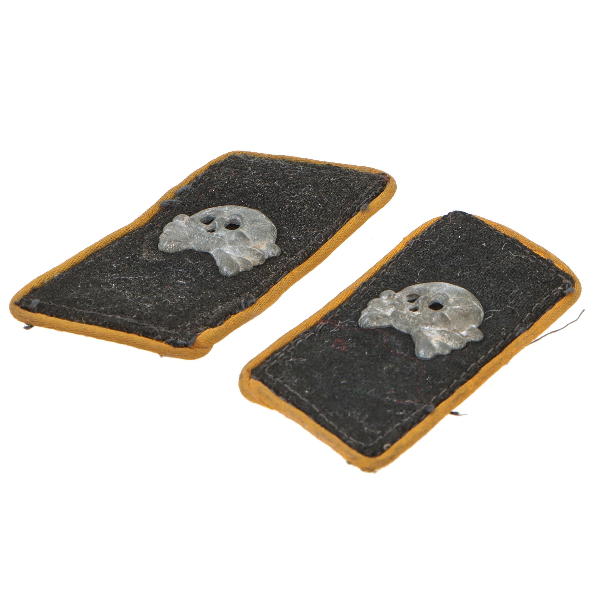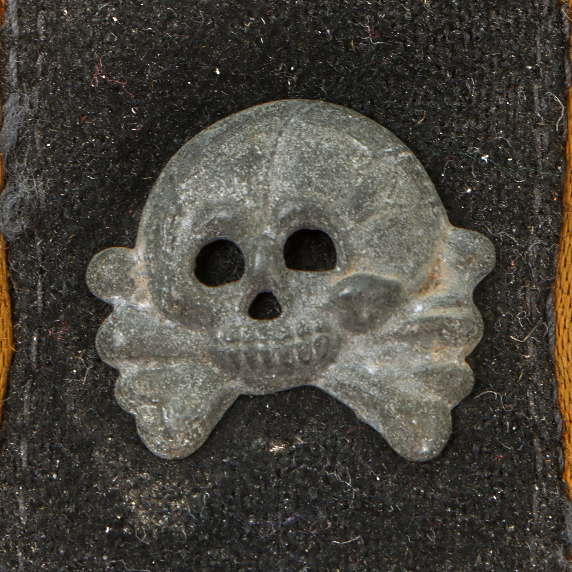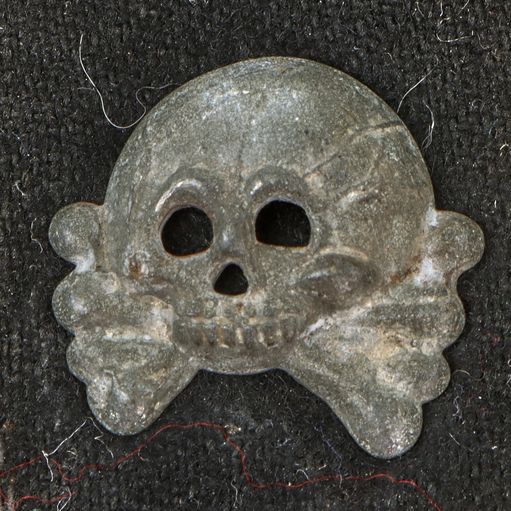 Original Item: Only One Available. In November 1934 the Germans introduced the black Panzer wrap tunic for the newly formed armored units and it was worn through-out the war with minor modifications in 1936 and 1942. Along with the new black Panzer wrap tunic the Germans also introduced the unique Panzer collar tabs which utilized the old Prussian "Danziger" style skull and crossbones. The skulls and crossbones were worn through-out the war with minor manufacturing variations.
