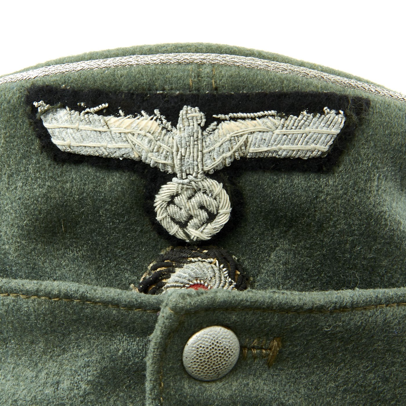 This fine early war example of a German Heer Army field cap however still conforms to the original Bergmütze pattern. It has a double thickness lined "skirt" with loops, and also has a nice leather sweatband inside. It is definitely for an officer, as it has the silver piping around the wide top. The Heer Reichsadler (National Eagle) and Tri-color cockade are made of hand-embroidered bullion, so this is definitely an early upmarket version. It is made of the correct feldgrau (Field gray) wool, and really looks great.