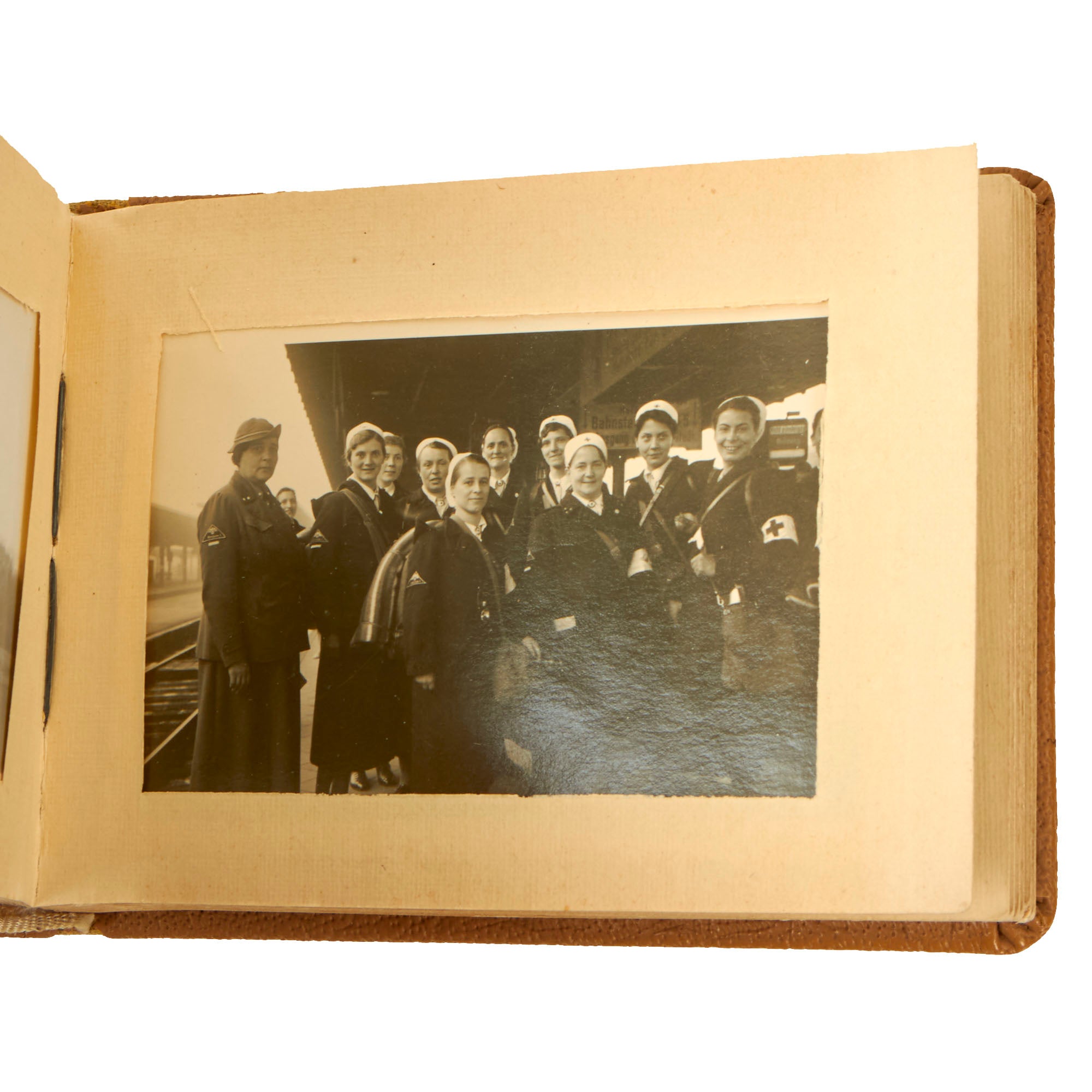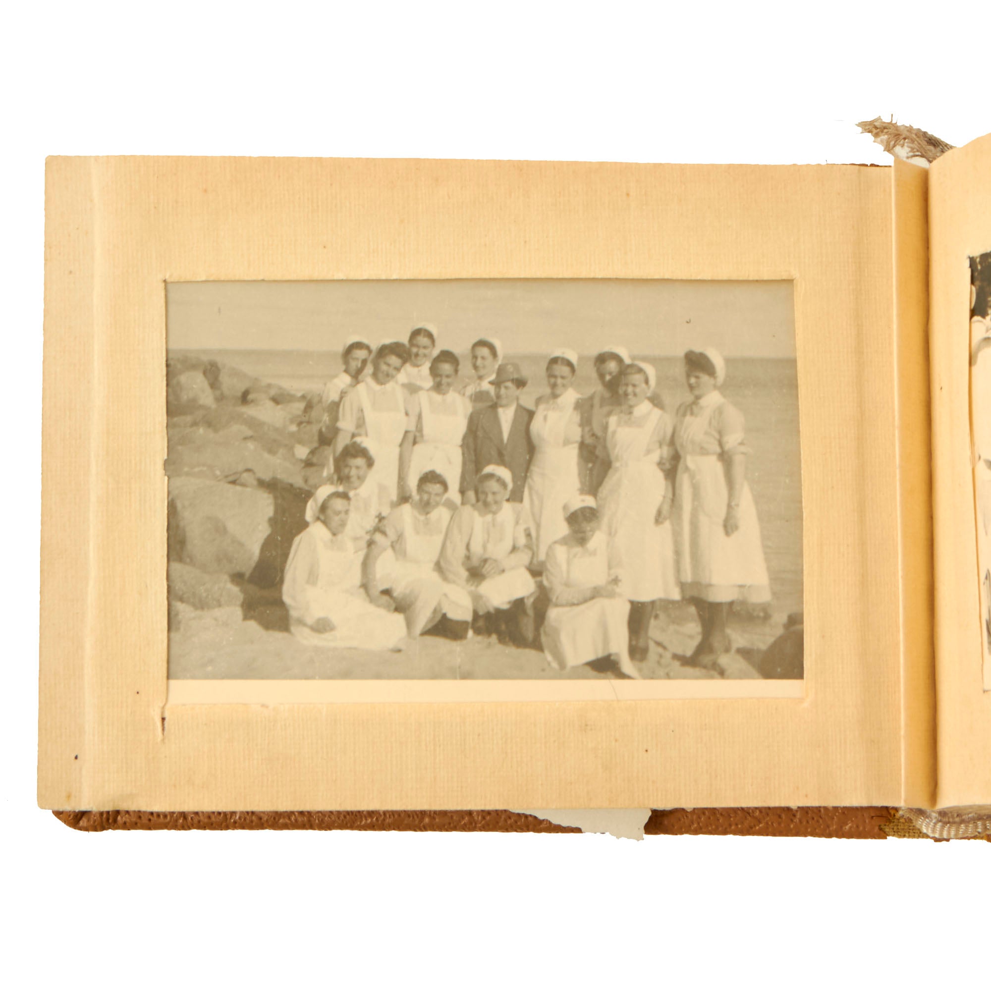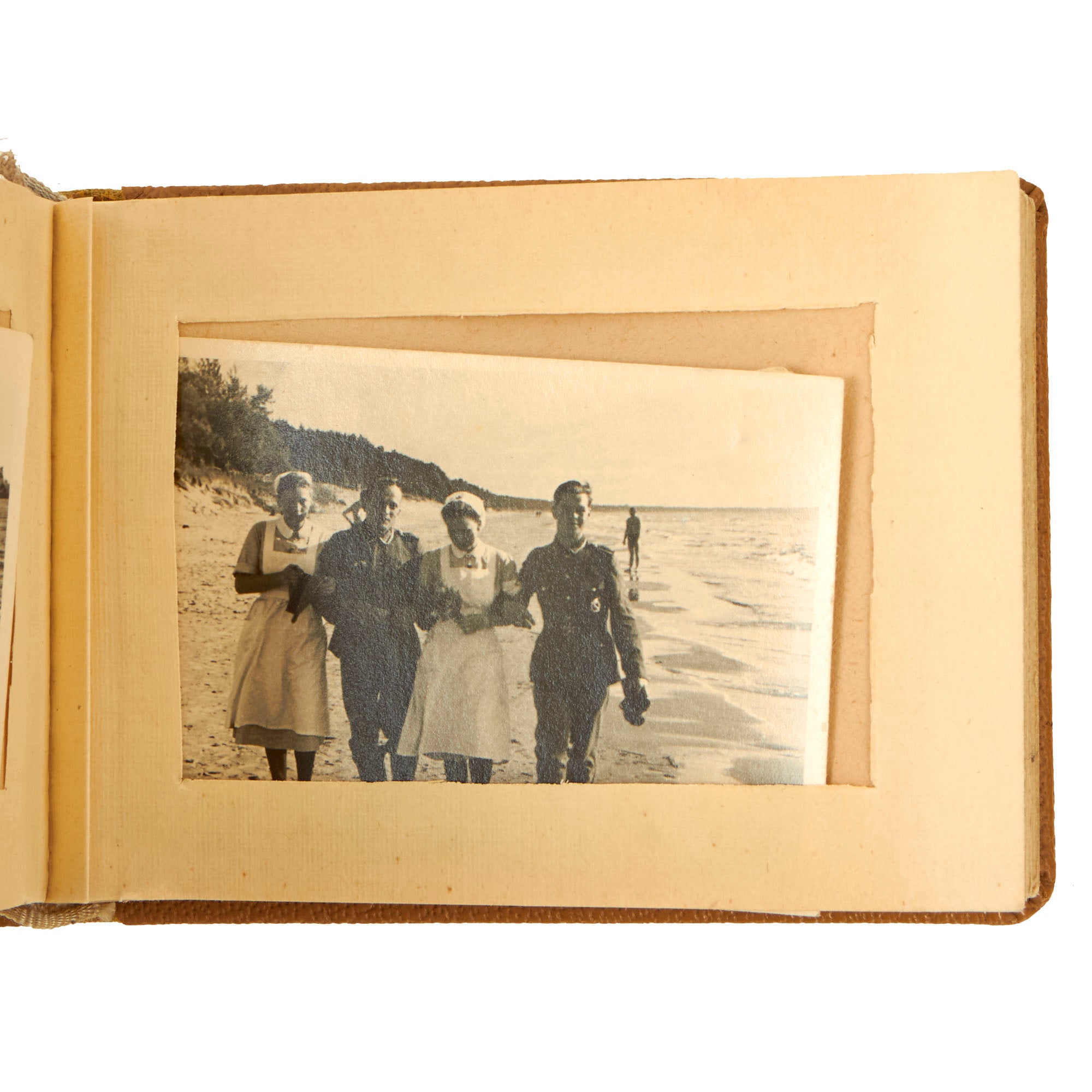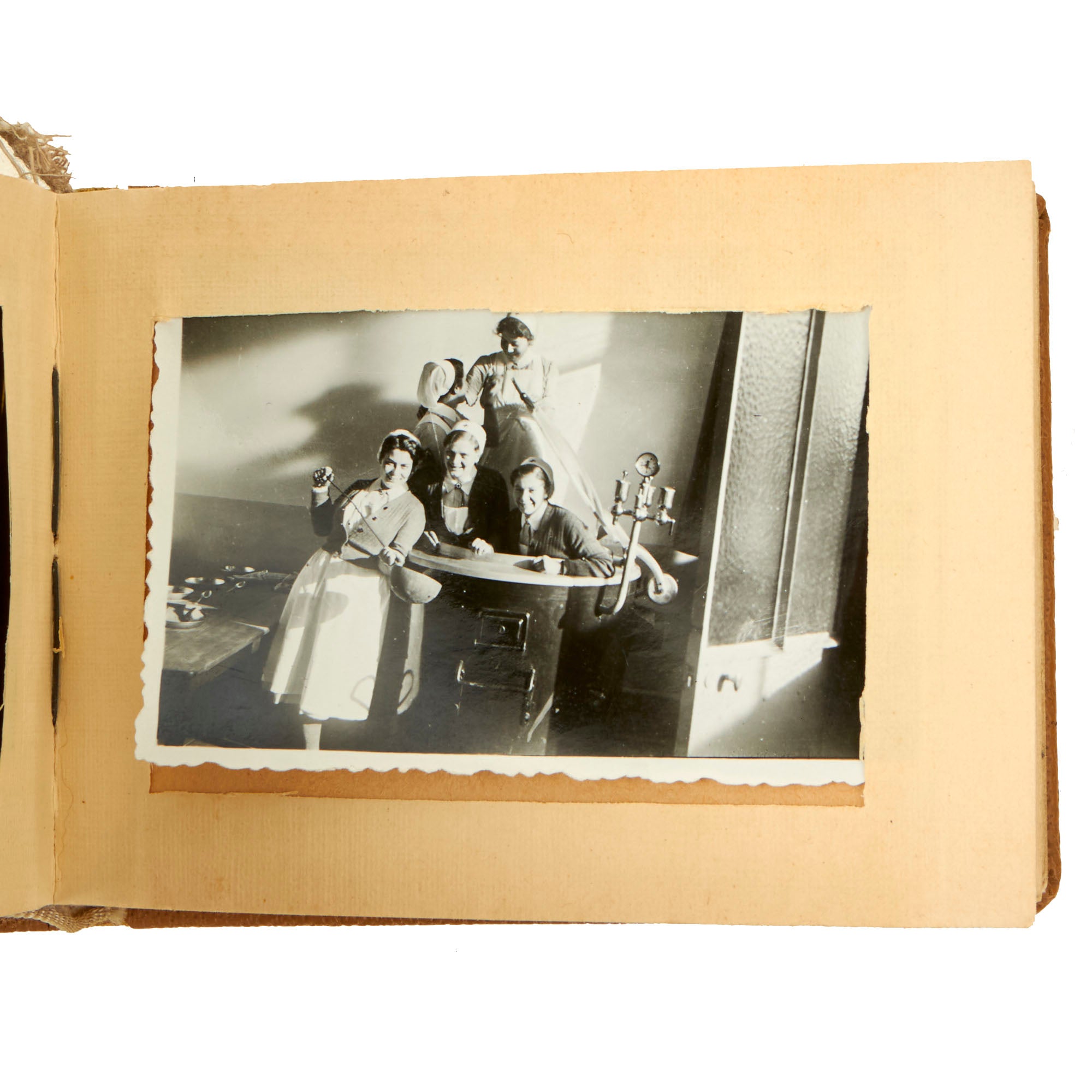 This is a great German Red Cross Helper’s photo album, with an attached DRK Helper Pin maker-marked on the back by Ernst L. Müller. The photo album measures 3½ x 4½ x 1¼”. It is signed on the interior cover, and dated 1940. There are many photos of nurses, soldiers with nurses, and in some photos the nurses have blood-covered smocks. Some photos of wounded soldiers, some in a snowy environment and some near the water. A great assortment, but the photos aren’t pasted in and are just held in the small page slots. A small but full album with some great photos. There’s also a donkey in one photo.