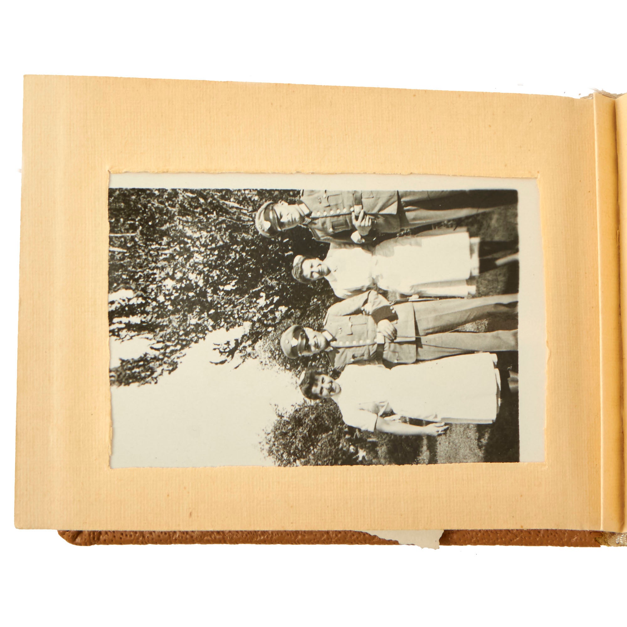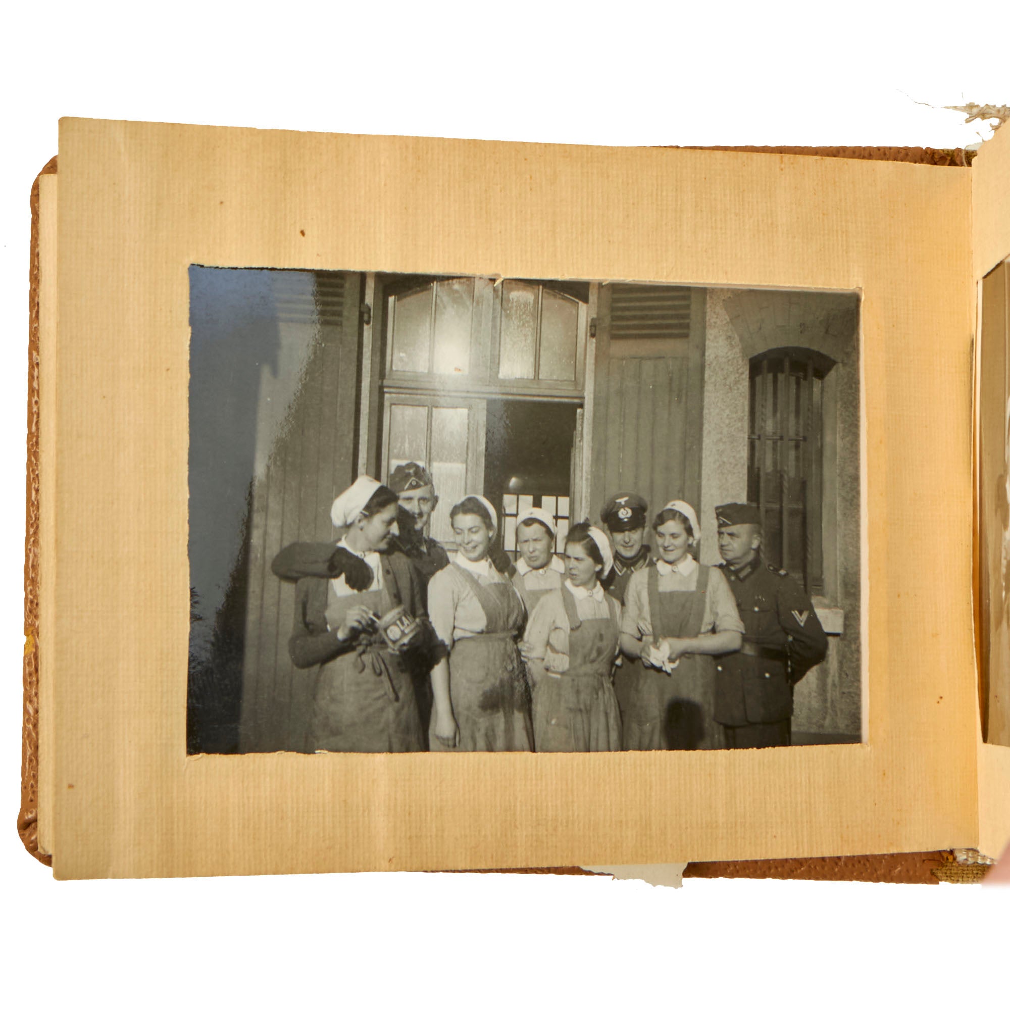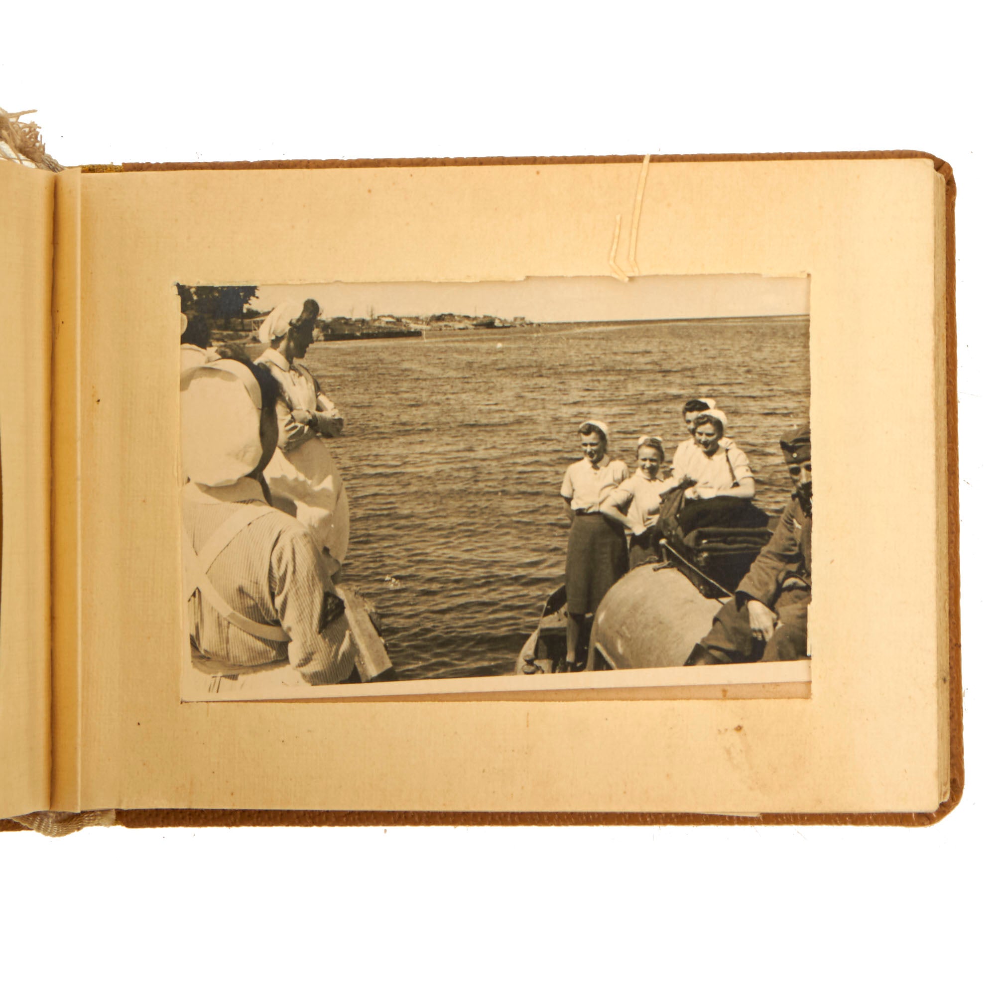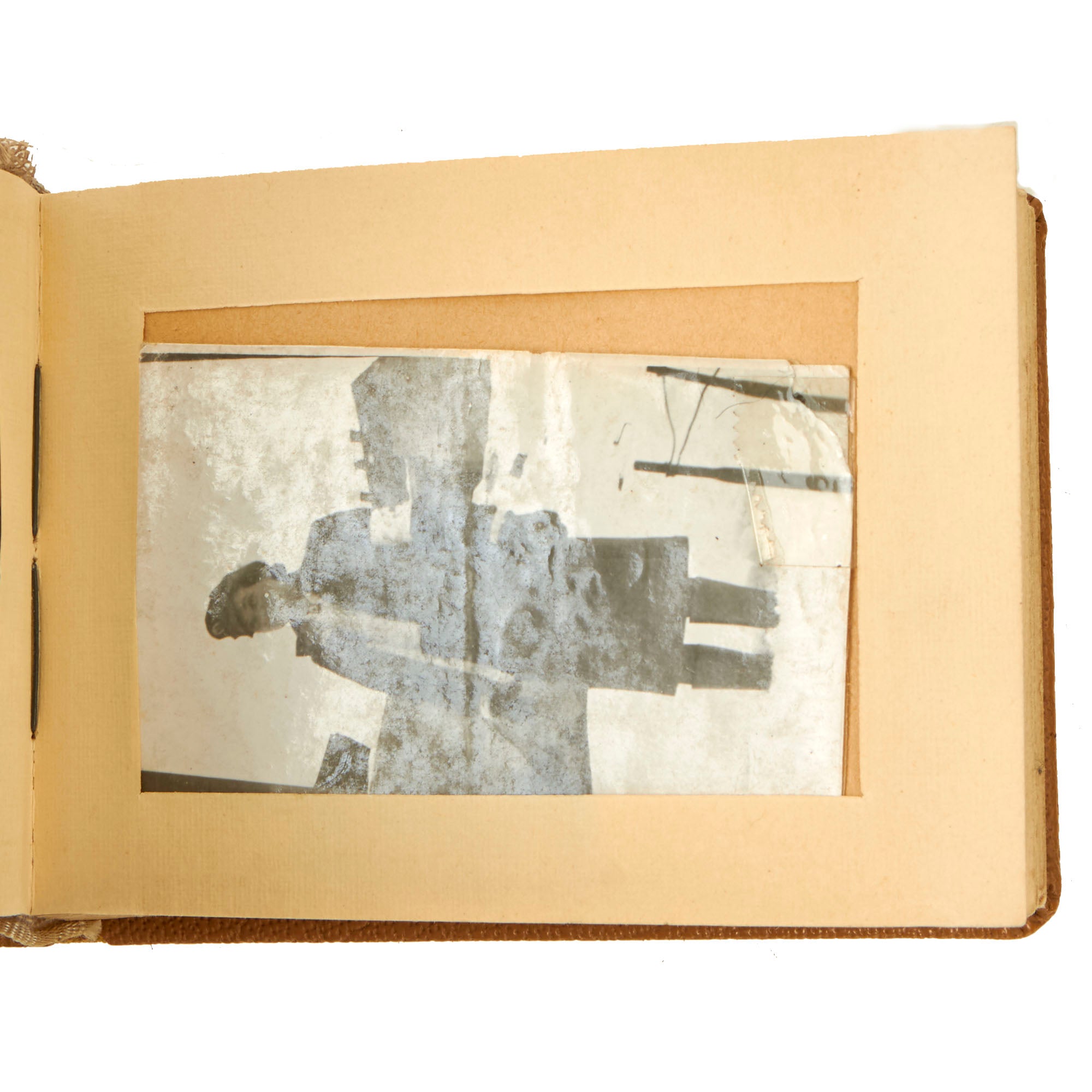 This is a great German Red Cross Helper’s photo album, with an attached DRK Helper Pin maker-marked on the back by Ernst L. Müller. The photo album measures 3½ x 4½ x 1¼”. It is signed on the interior cover, and dated 1940. There are many photos of nurses, soldiers with nurses, and in some photos the nurses have blood-covered smocks. Some photos of wounded soldiers, some in a snowy environment and some near the water. A great assortment, but the photos aren’t pasted in and are just held in the small page slots. A small but full album with some great photos. There’s also a donkey in one photo.