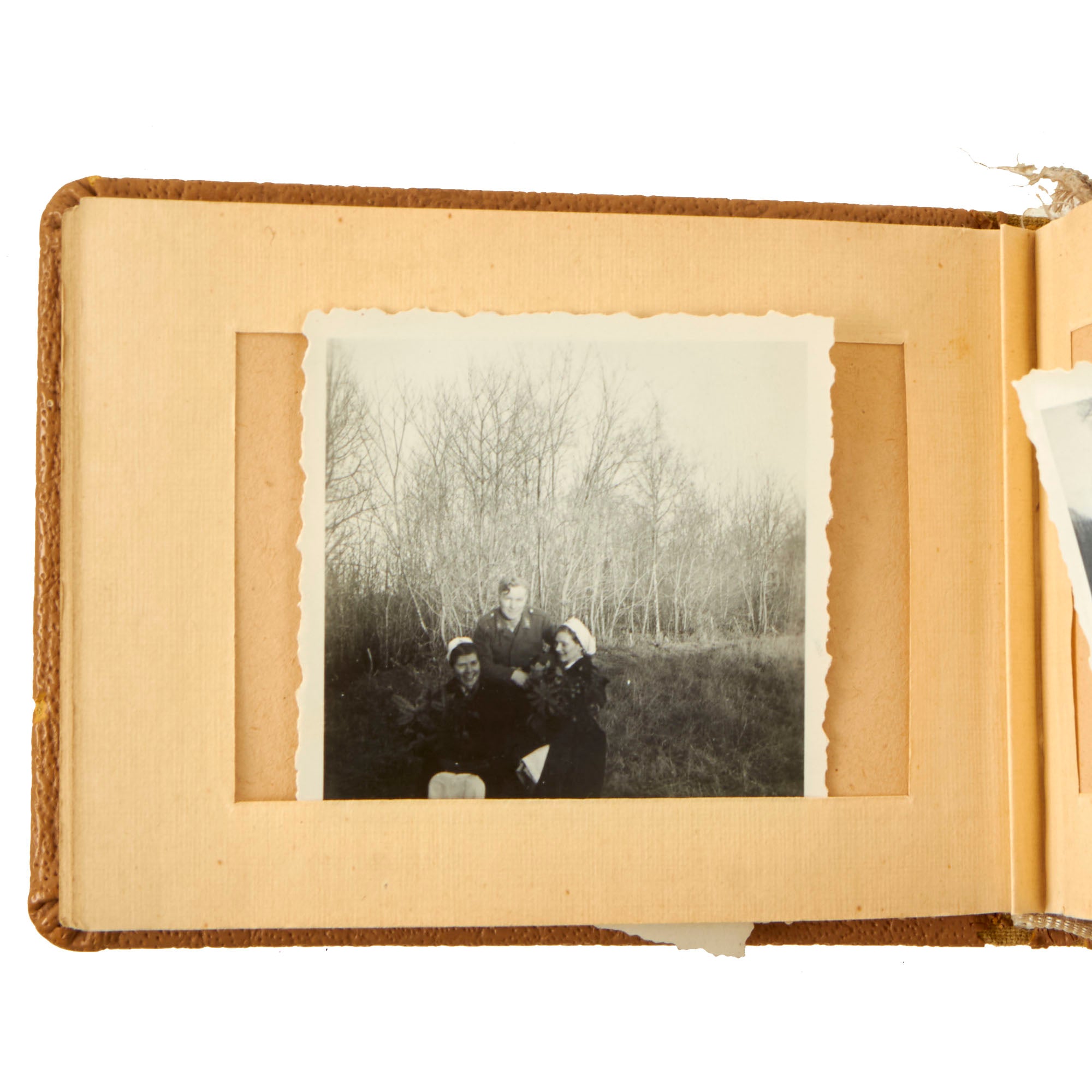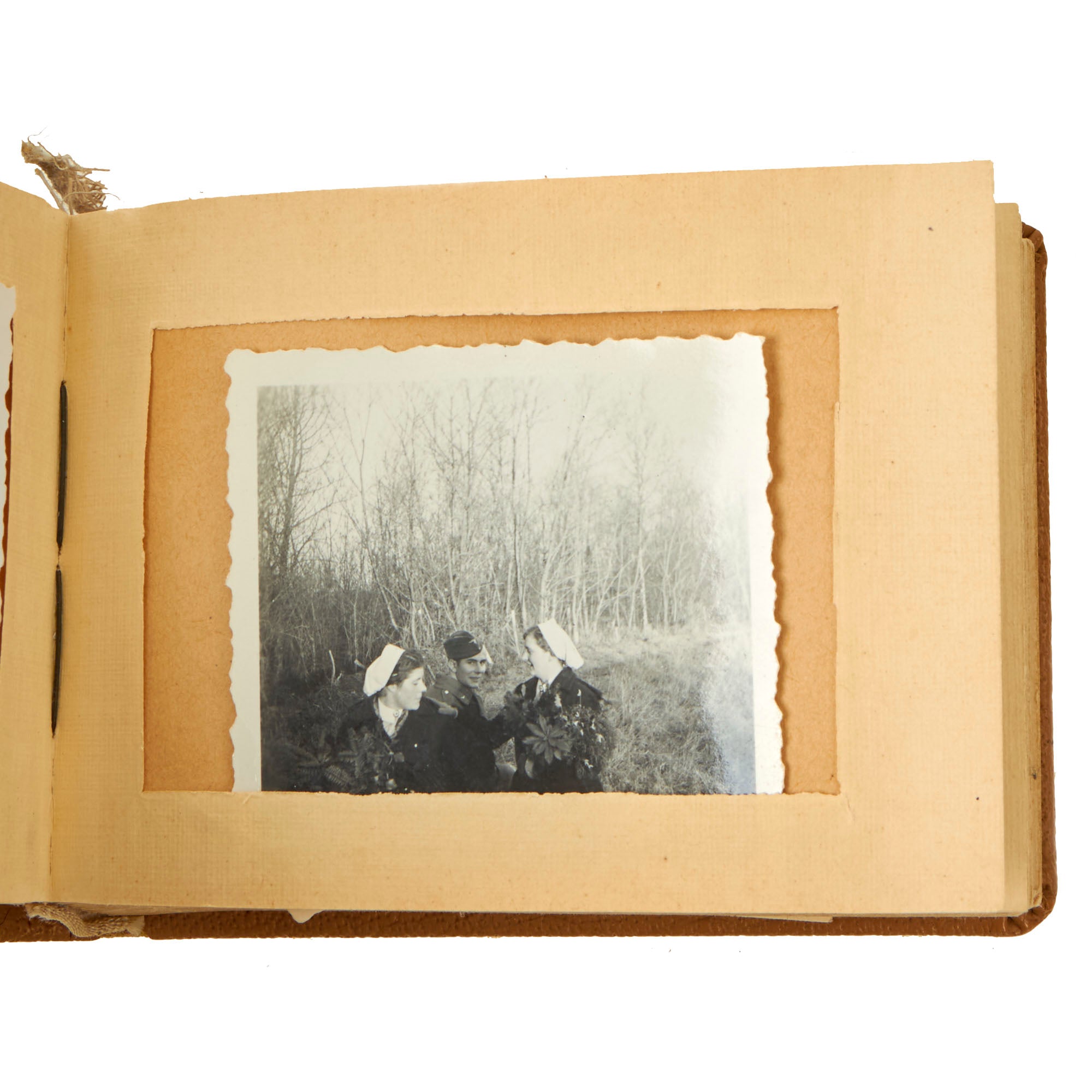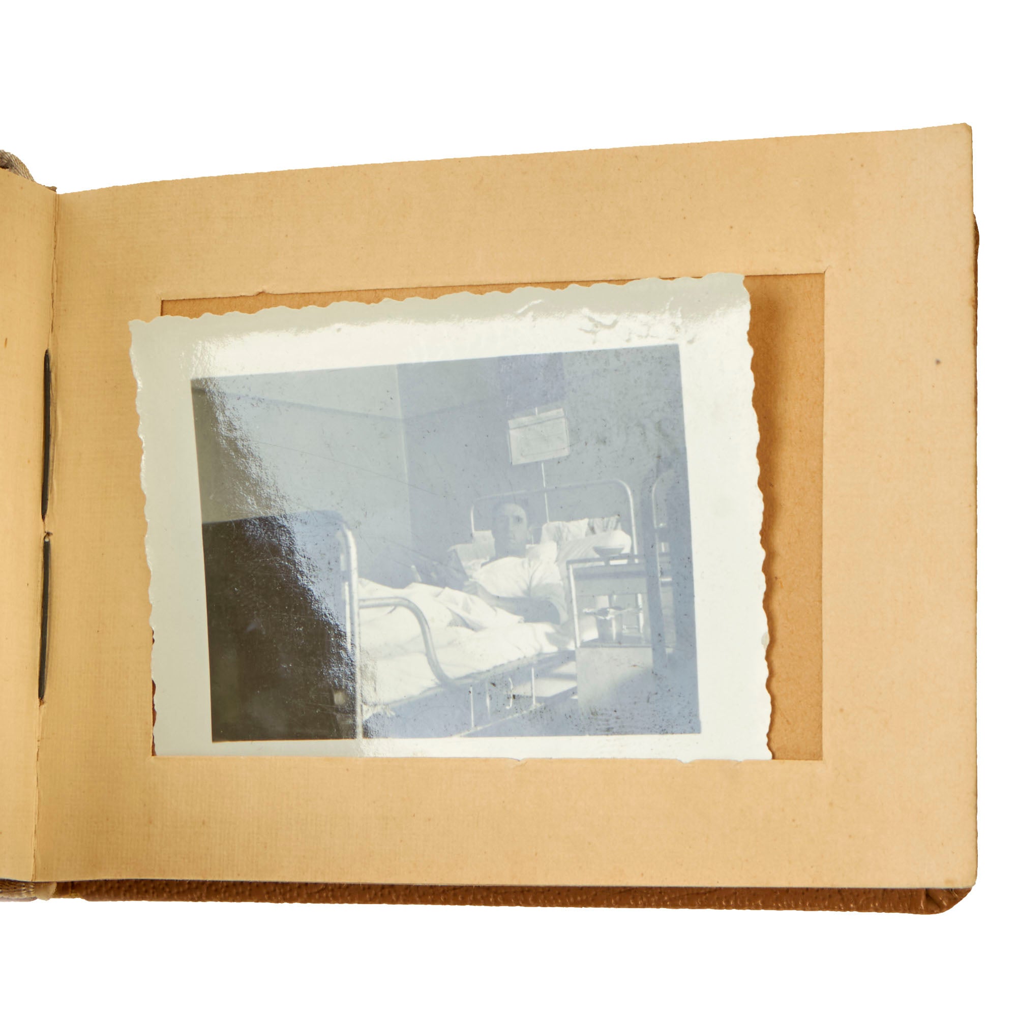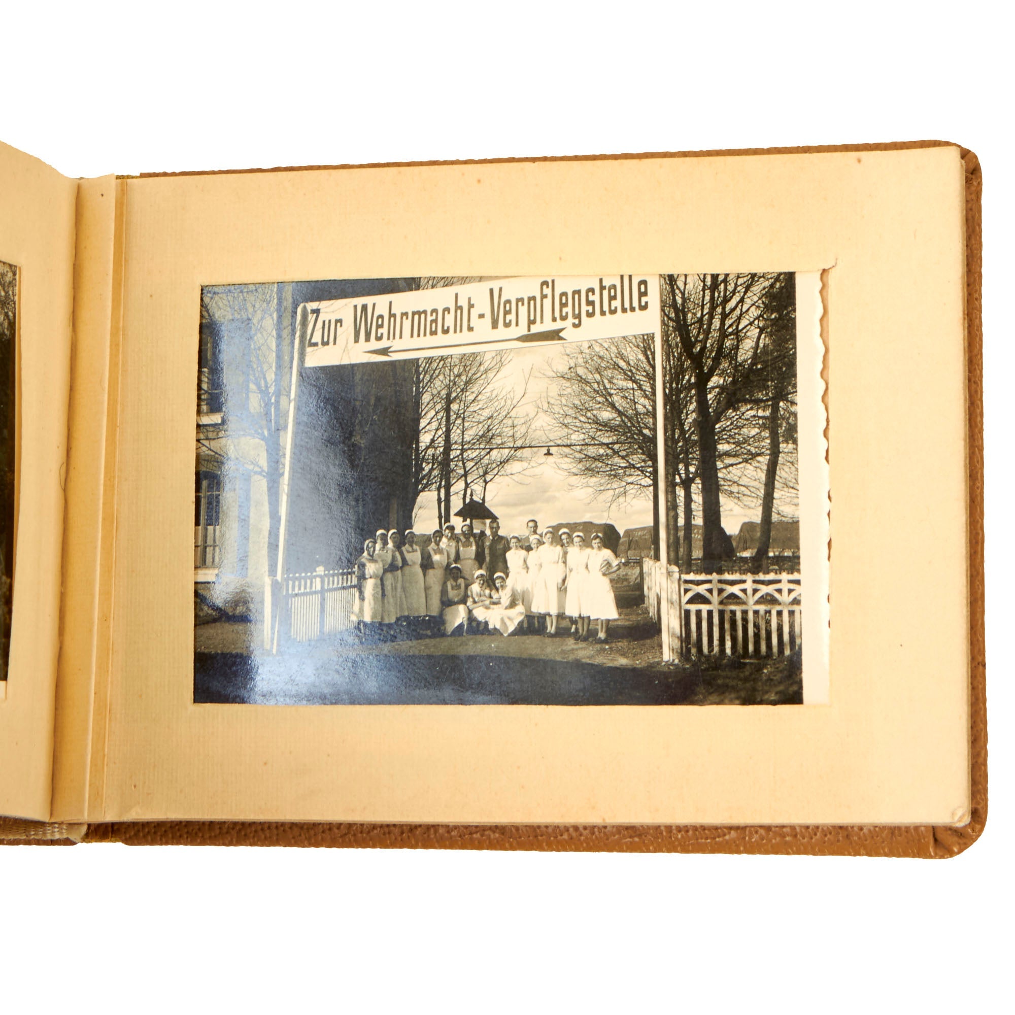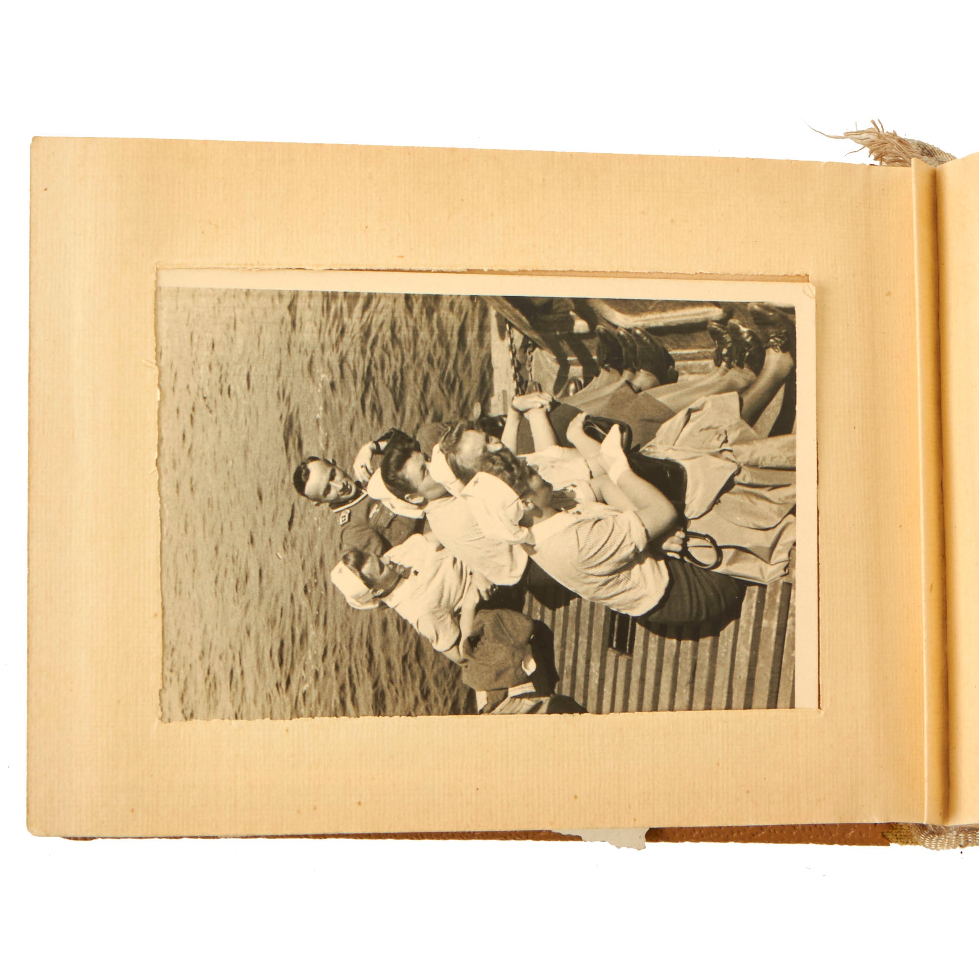 This is a great German Red Cross Helper’s photo album, with an attached DRK Helper Pin maker-marked on the back by Ernst L. Müller. The photo album measures 3½ x 4½ x 1¼”. It is signed on the interior cover, and dated 1940. There are many photos of nurses, soldiers with nurses, and in some photos the nurses have blood-covered smocks. Some photos of wounded soldiers, some in a snowy environment and some near the water. A great assortment, but the photos aren’t pasted in and are just held in the small page slots. A small but full album with some great photos. There’s also a donkey in one photo.