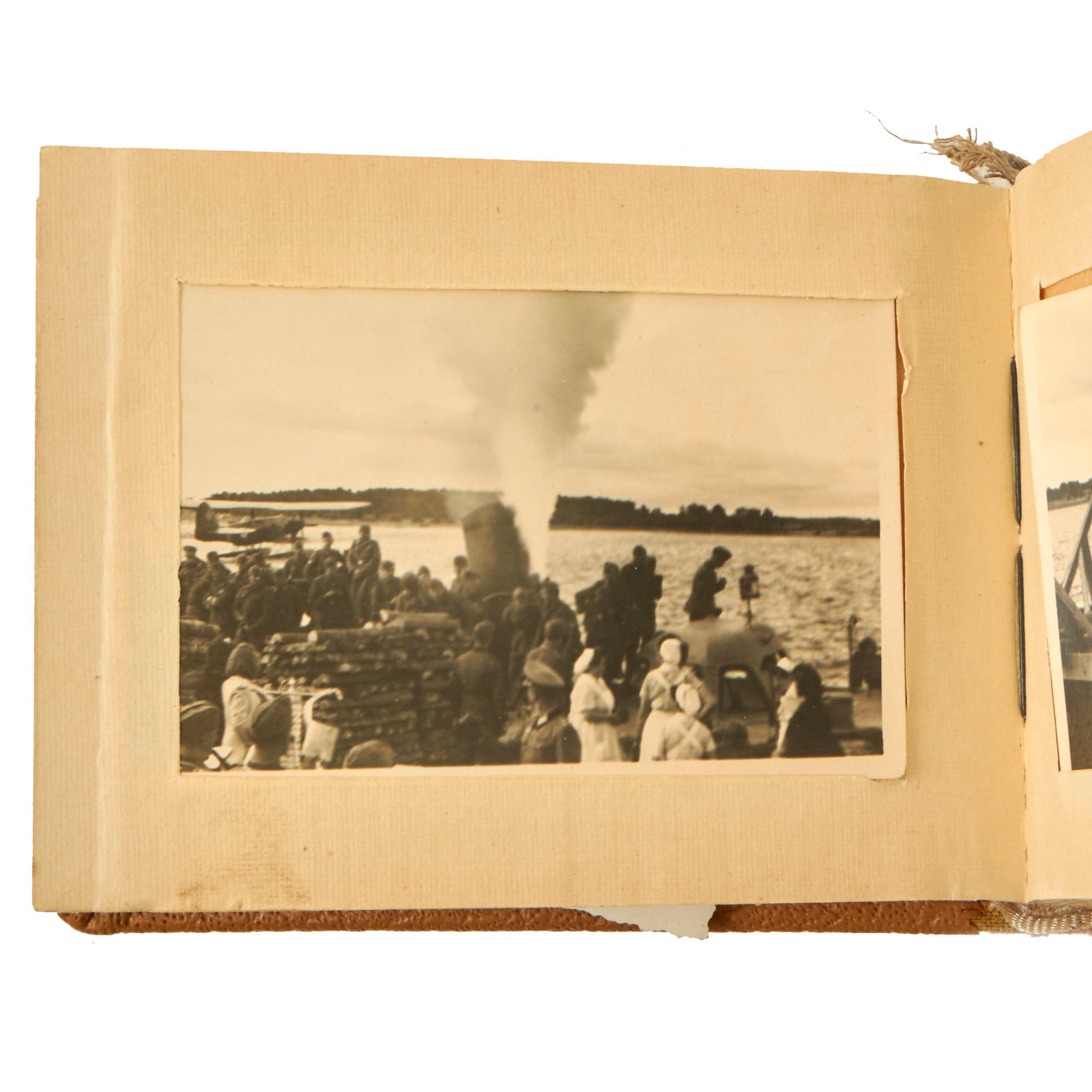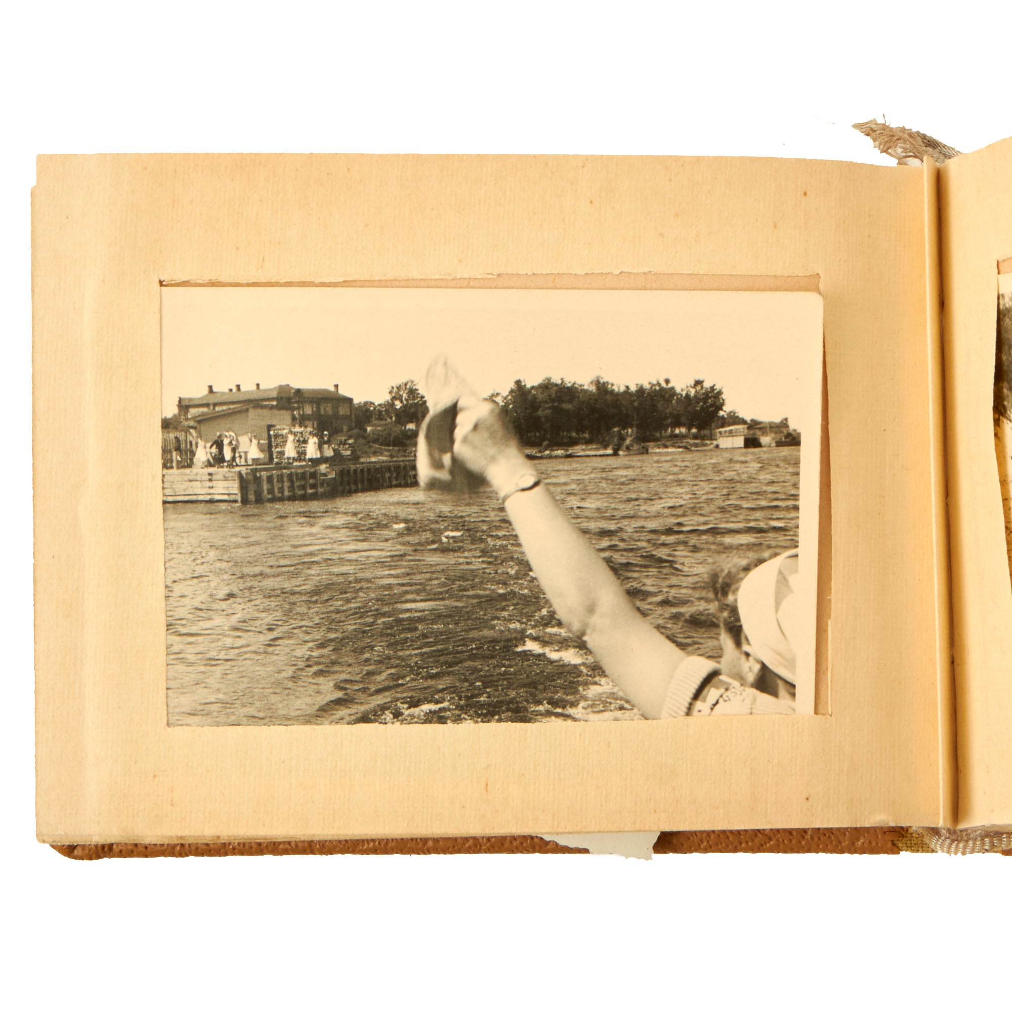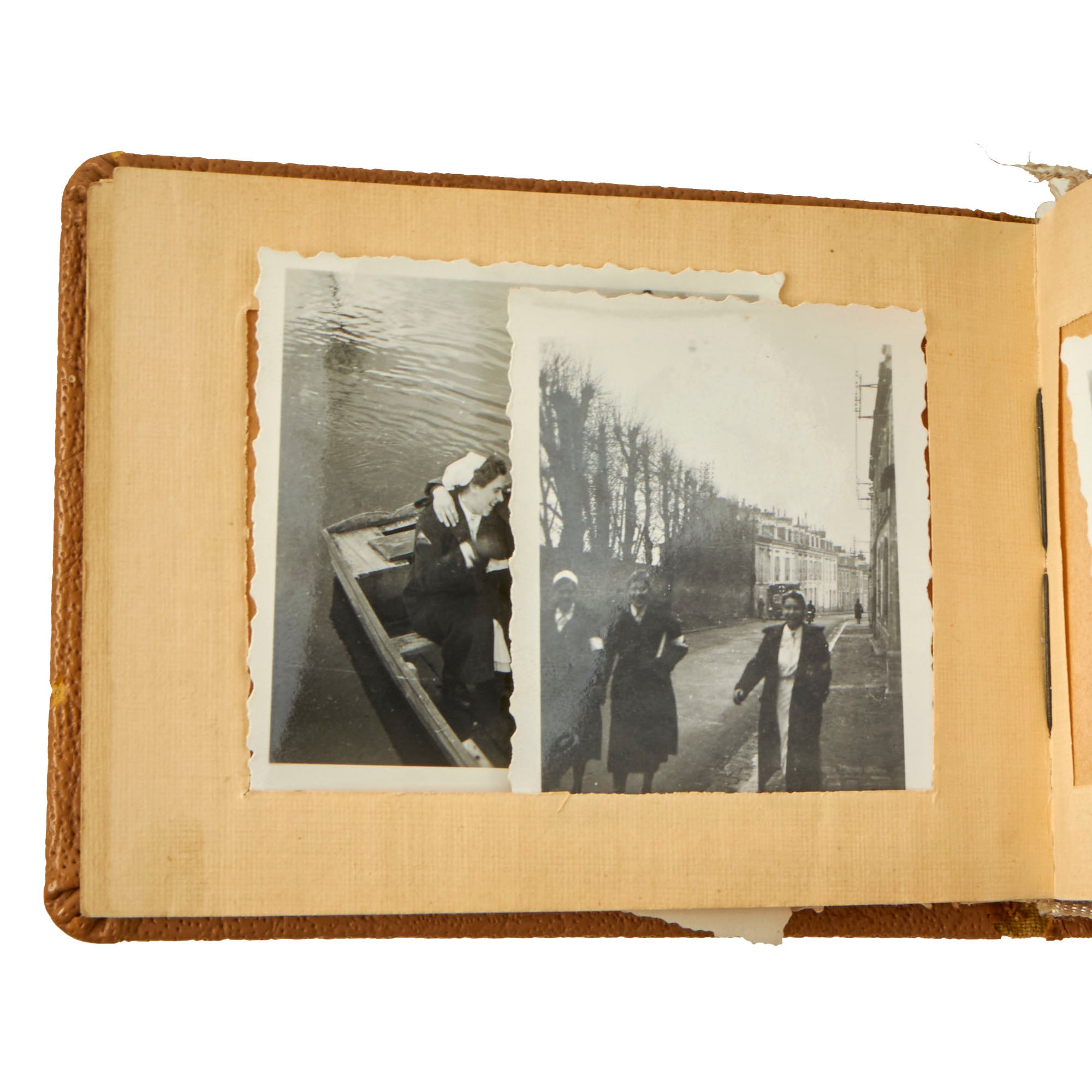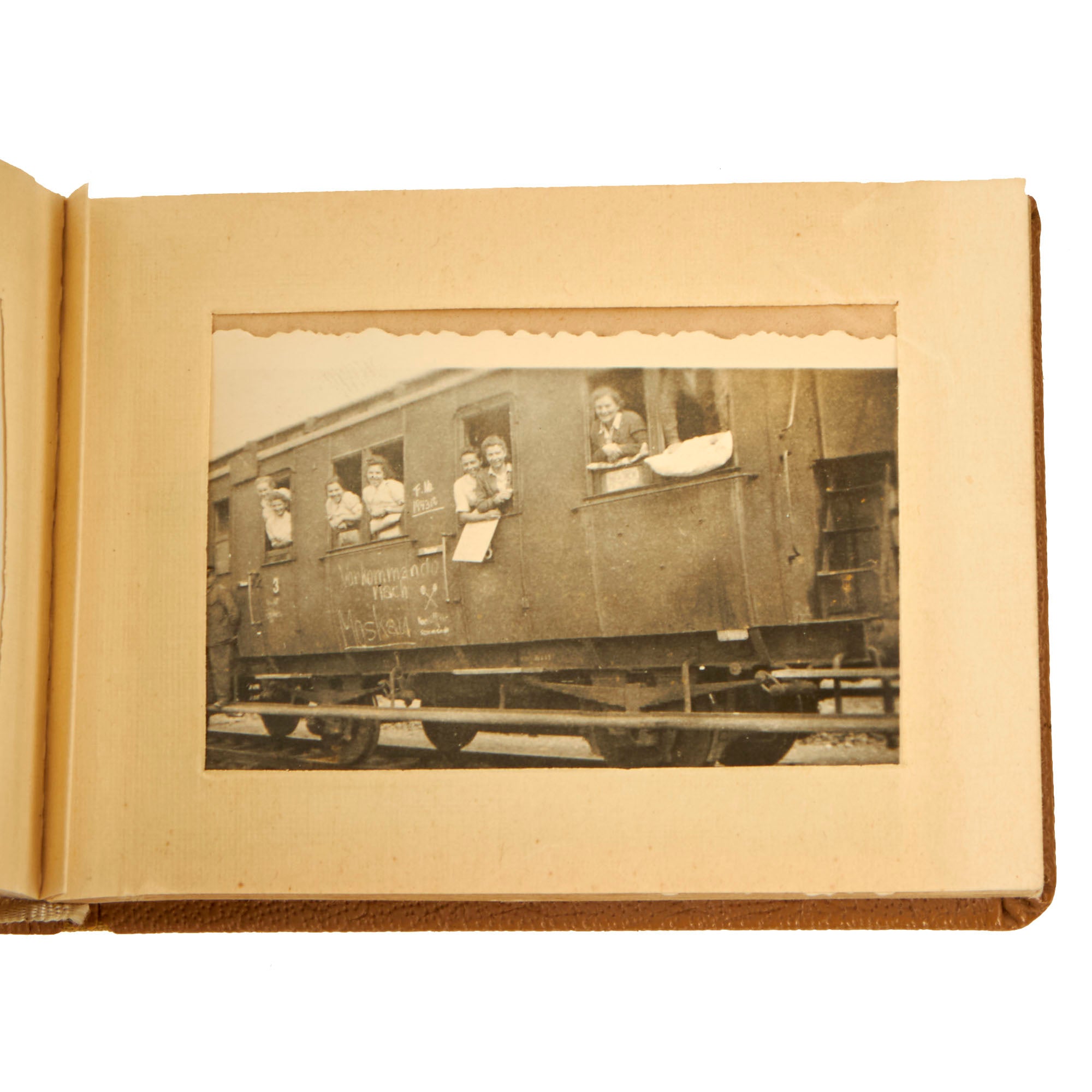 This is a great German Red Cross Helper’s photo album, with an attached DRK Helper Pin maker-marked on the back by Ernst L. Müller. The photo album measures 3½ x 4½ x 1¼”. It is signed on the interior cover, and dated 1940. There are many photos of nurses, soldiers with nurses, and in some photos the nurses have blood-covered smocks. Some photos of wounded soldiers, some in a snowy environment and some near the water. A great assortment, but the photos aren’t pasted in and are just held in the small page slots. A small but full album with some great photos. There’s also a donkey in one photo.