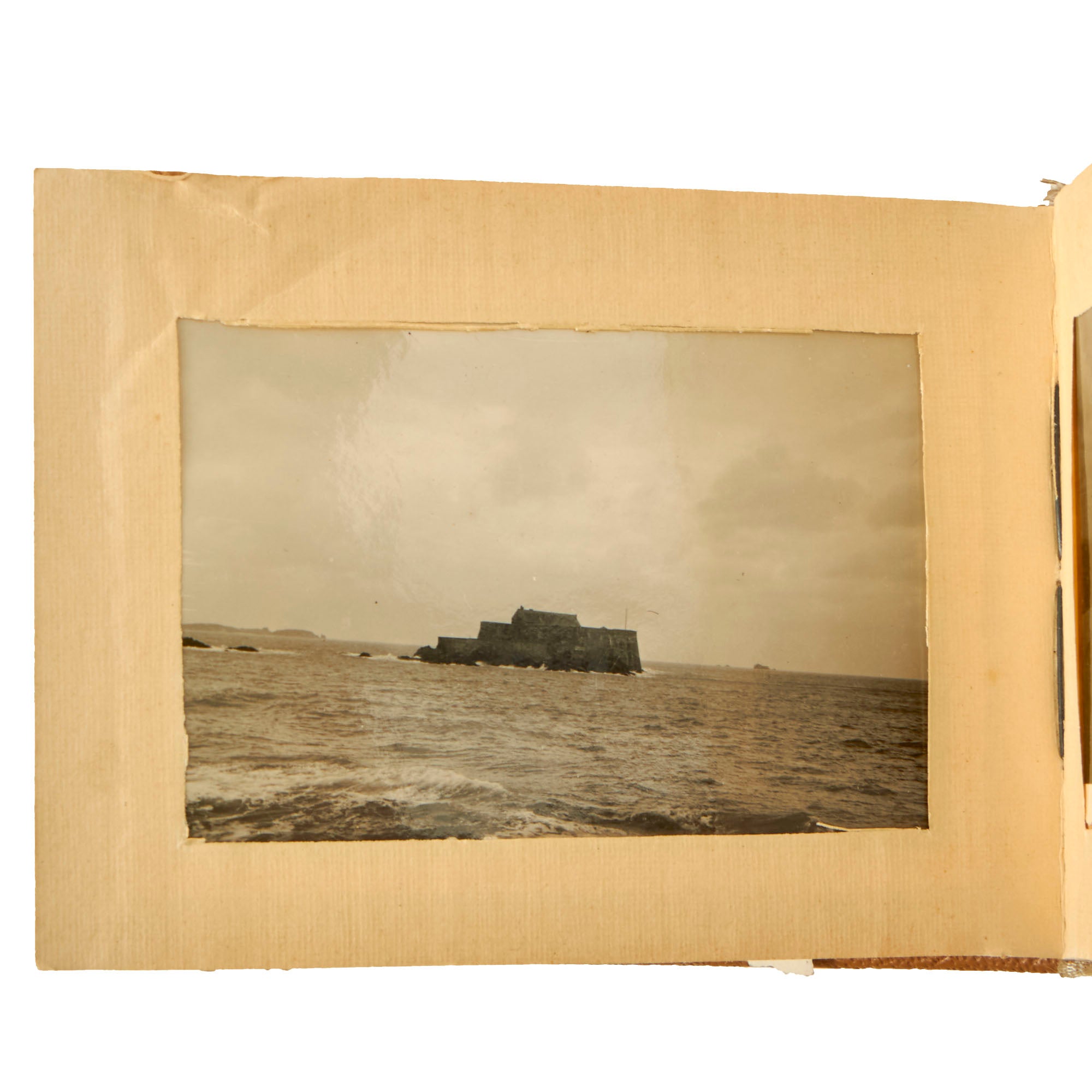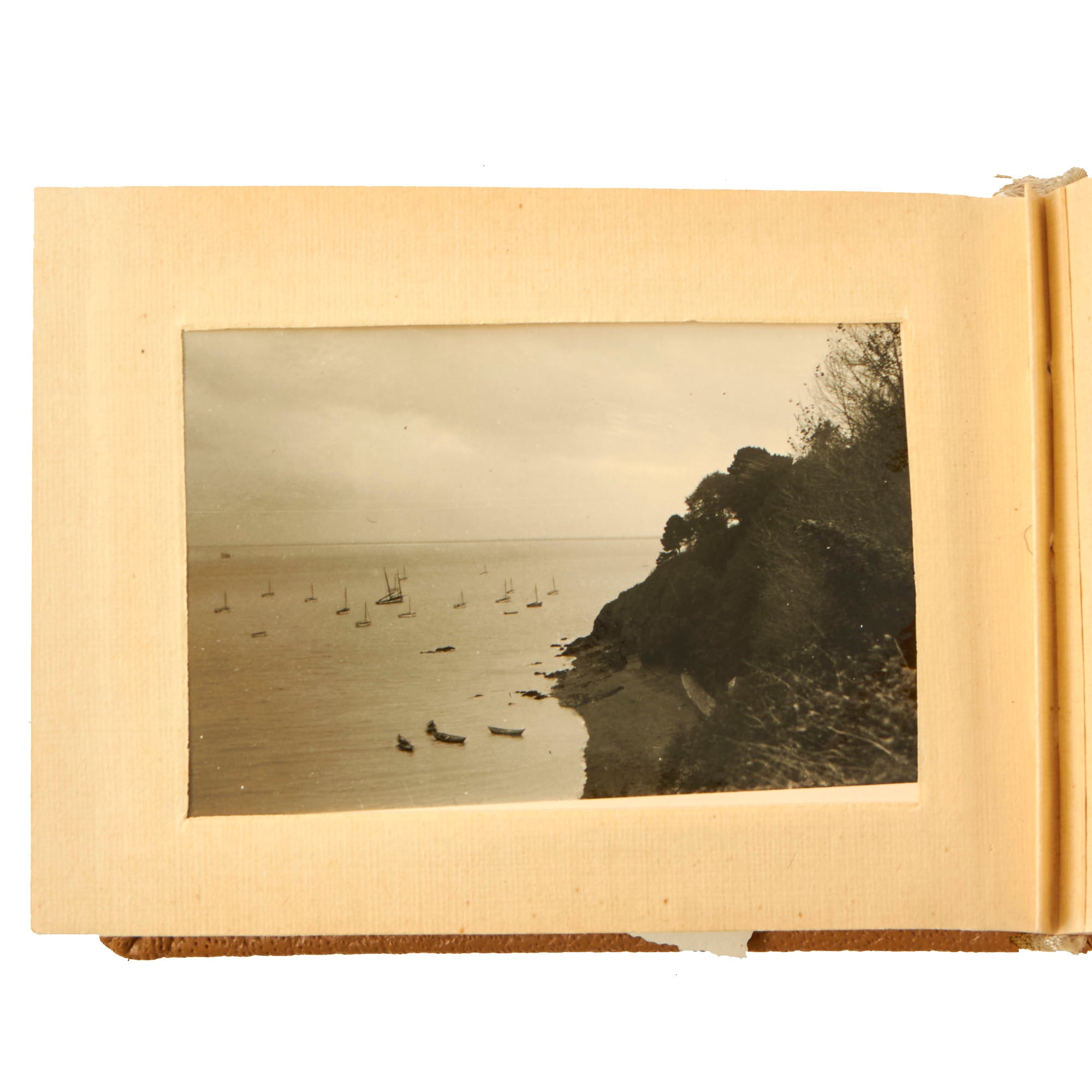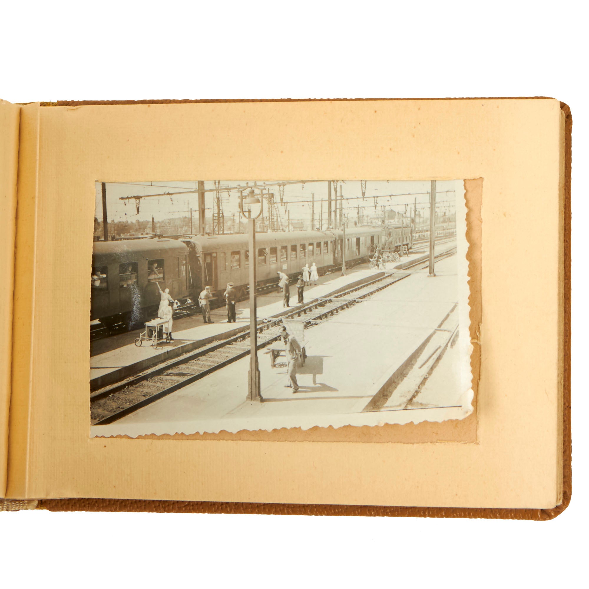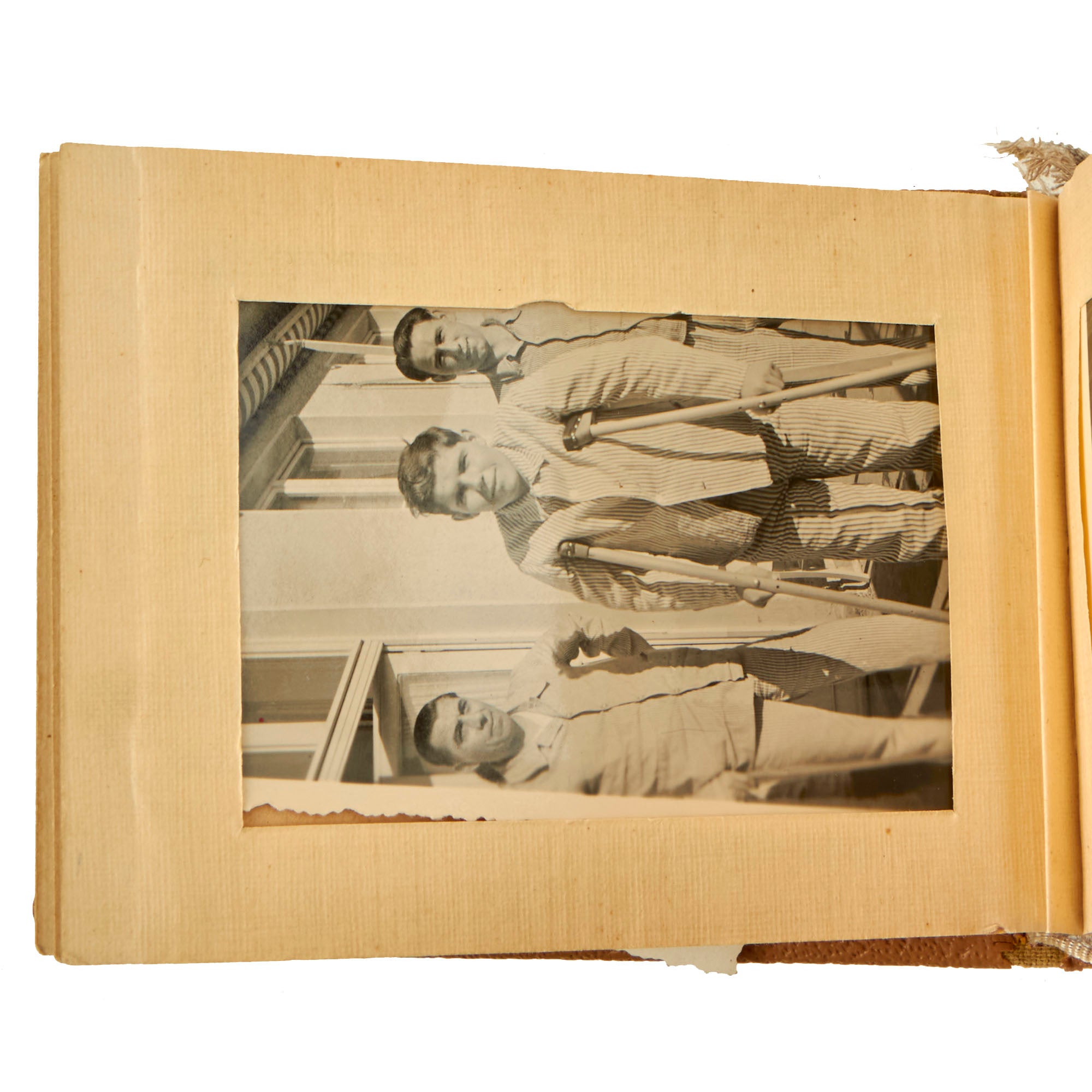 This is a great German Red Cross Helper’s photo album, with an attached DRK Helper Pin maker-marked on the back by Ernst L. Müller. The photo album measures 3½ x 4½ x 1¼”. It is signed on the interior cover, and dated 1940. There are many photos of nurses, soldiers with nurses, and in some photos the nurses have blood-covered smocks. Some photos of wounded soldiers, some in a snowy environment and some near the water. A great assortment, but the photos aren’t pasted in and are just held in the small page slots. A small but full album with some great photos. There’s also a donkey in one photo.