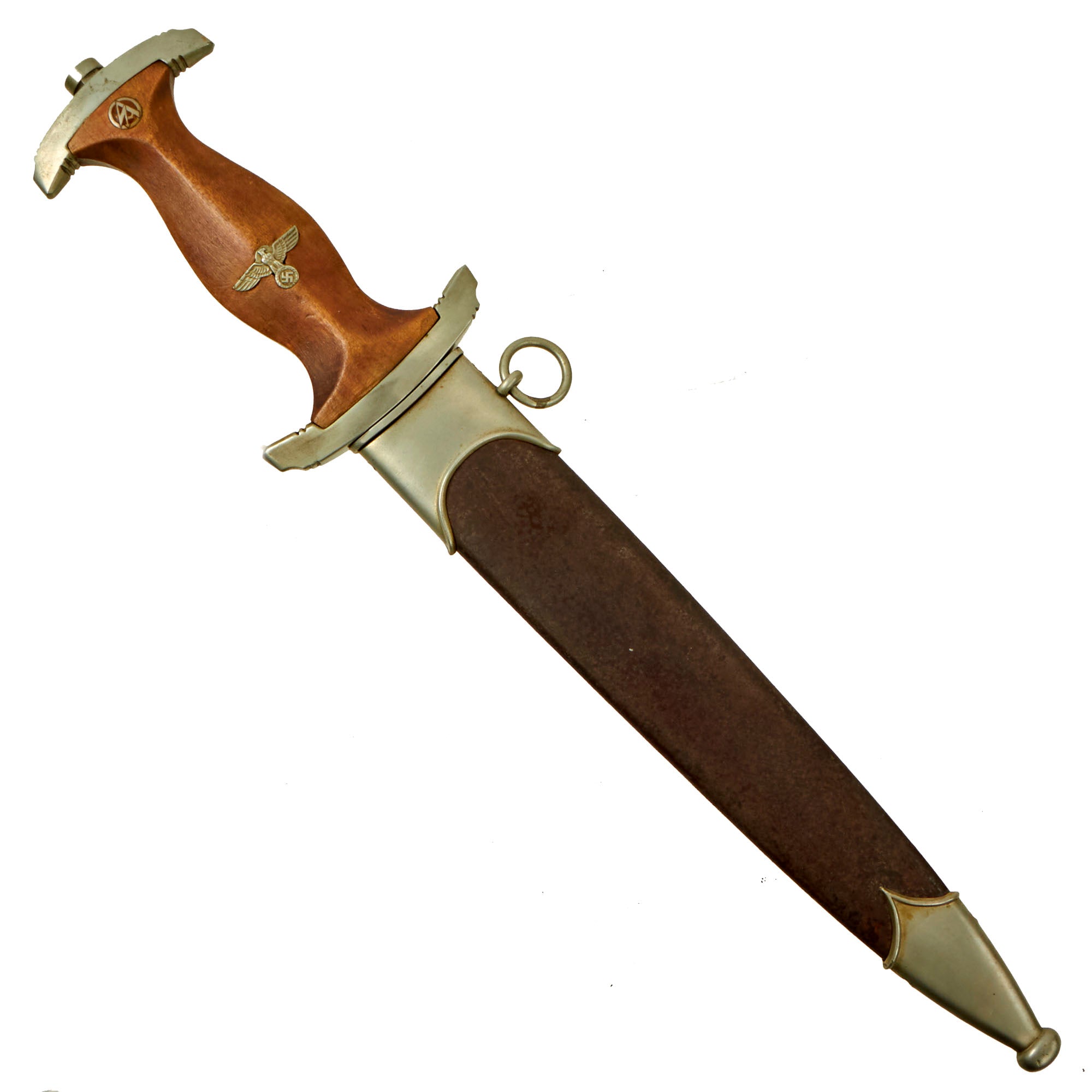 The SA or Brown Shirts, were a private political formation which Adolf AH and the NSDAP used to maintain order at organized Party meetings and demonstrations. The group was formed in 1921, and grew to a huge force of nearly 3,000,000 men by the later 1930's. To instill esprit de corps, as well as create employment for the Blade City of Solingen, it was decided each SA man would carry a dagger with his Brown Shirt uniform. Huge quantities needed to be produced to accommodate the demand. The dagger initially was produced of hand-fitted nickel mounts with attractive finished wood grip and brown anodized (a bluing process) finished scabbard.