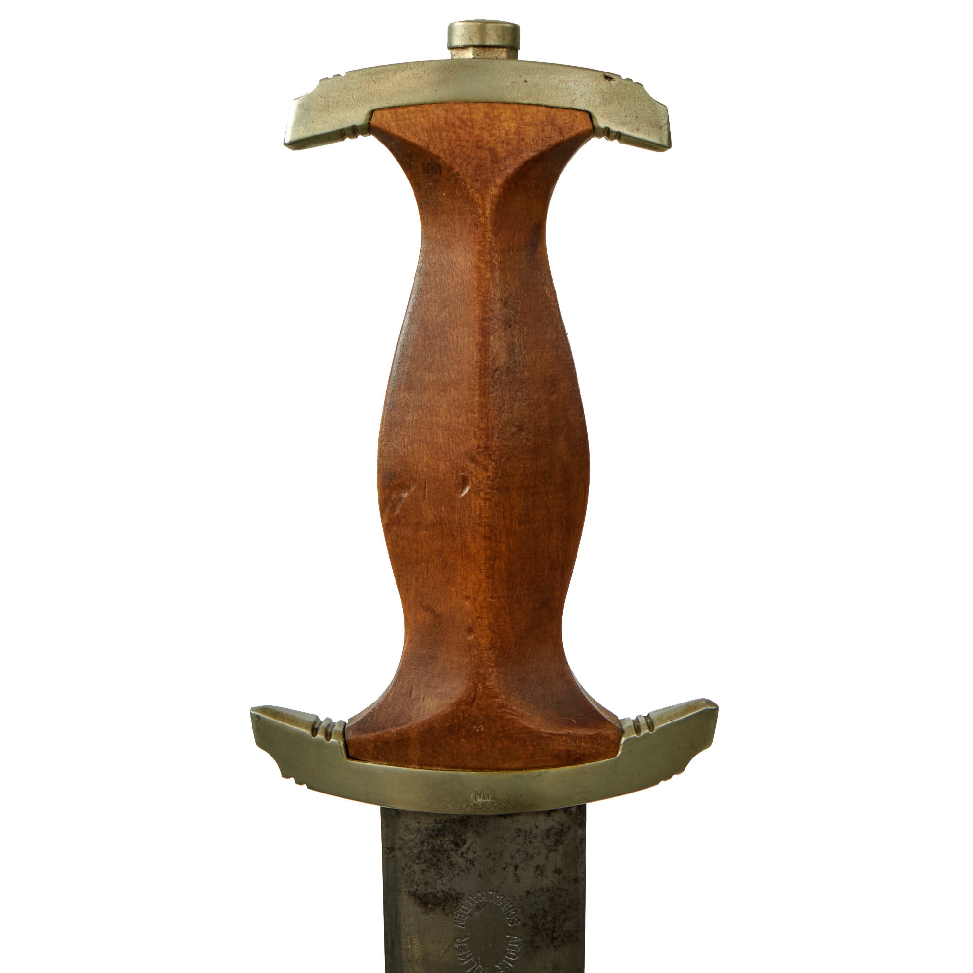 The blade was etched with the SA motto, Alles für Deutschland. Examples produced prior to 1935 were stamped with the German sector of the SA group on reverse lower crossguard. Later examples underwent standardization through the RZM ministry. These pieces were produced of cheaper plated zinc-base fittings and scabbards were simply painted brown.