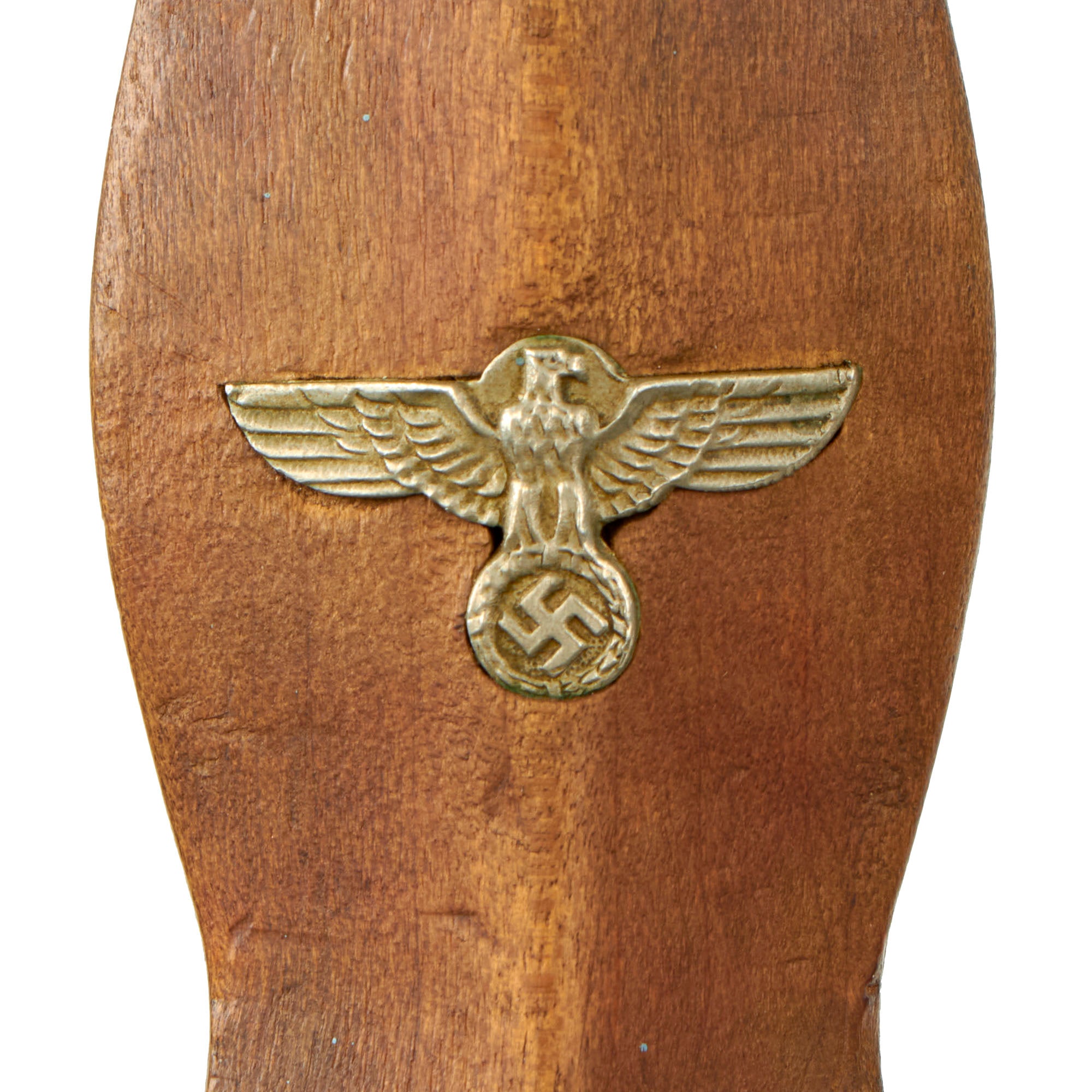 The grip is a fine product having a lovely honey brown color, with medium center ridge construction, showing only light wear and a few small dents. The wood is still in very good condition, with some great color variation, and fits the crossguards nicely, with no chips or cracking we can see. The pommel nut does not show any turning on the outside, and the grip has just a bit of wiggle on the tang. The SA symbol button is still set in the grip, with mostly complete enamel and plating. It shows a bit of wear and oxidation, with some verdigris on the perimeter. The grip eagle is a fine example being the style with beak that points straight. It has just a bit of verdigris on it, showing that it is solid nickel alloy, and it has patinated nicely. The details are still there to the eagle to include the beak, breast feathering, wing feathering, talons, wreath and mobile swas (hook cross).