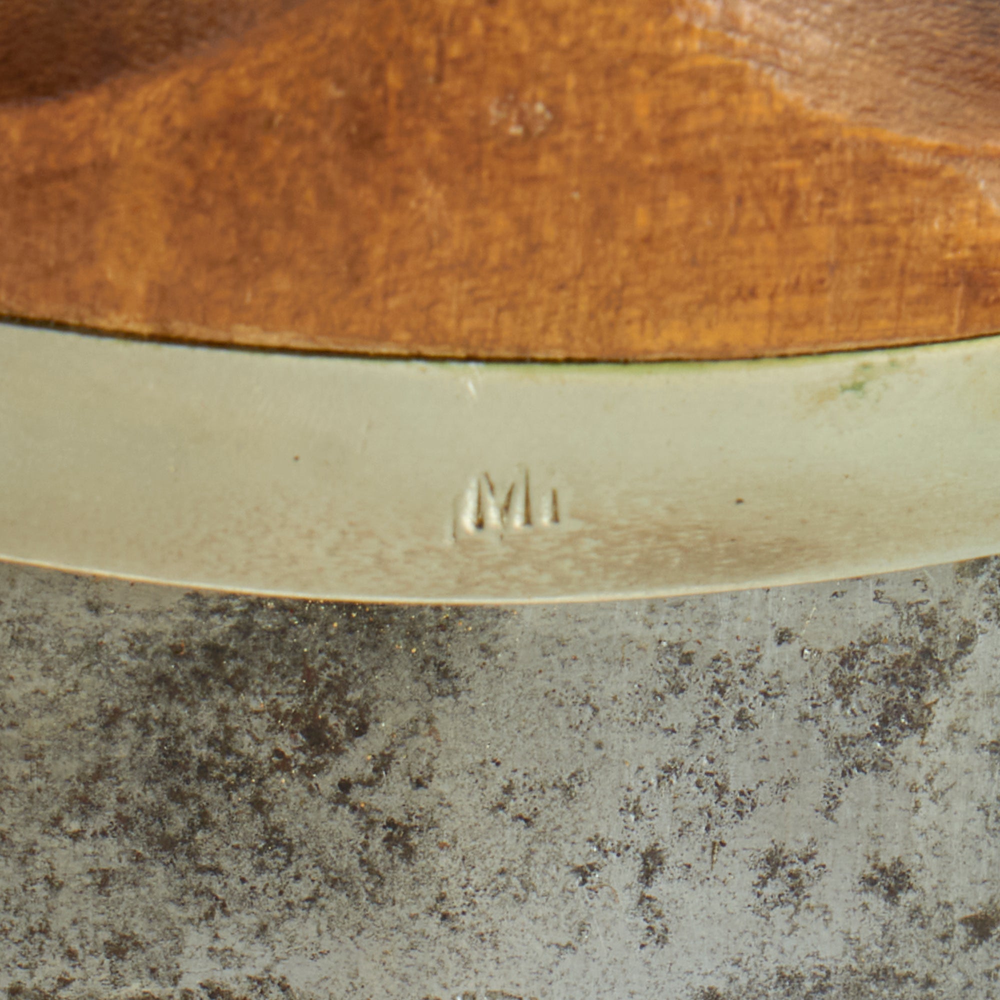 The dagger has solid nickel silver fittings throughout, and the crossguards and tang nut are in very good condition throughout, with all fittings having a nice lightly worn oxidized patina. There is just a bit of age and denting to these mounts but there is no lifting anywhere, showing that they are solid and not plated. The lower reverse guard is Gruppe/Gau marked Mi, for Mitte (Center), an SA Administrative region to the West of Berlin, with Magdeburg as the main city. This feature was only seen on daggers produced 1935 and prior.