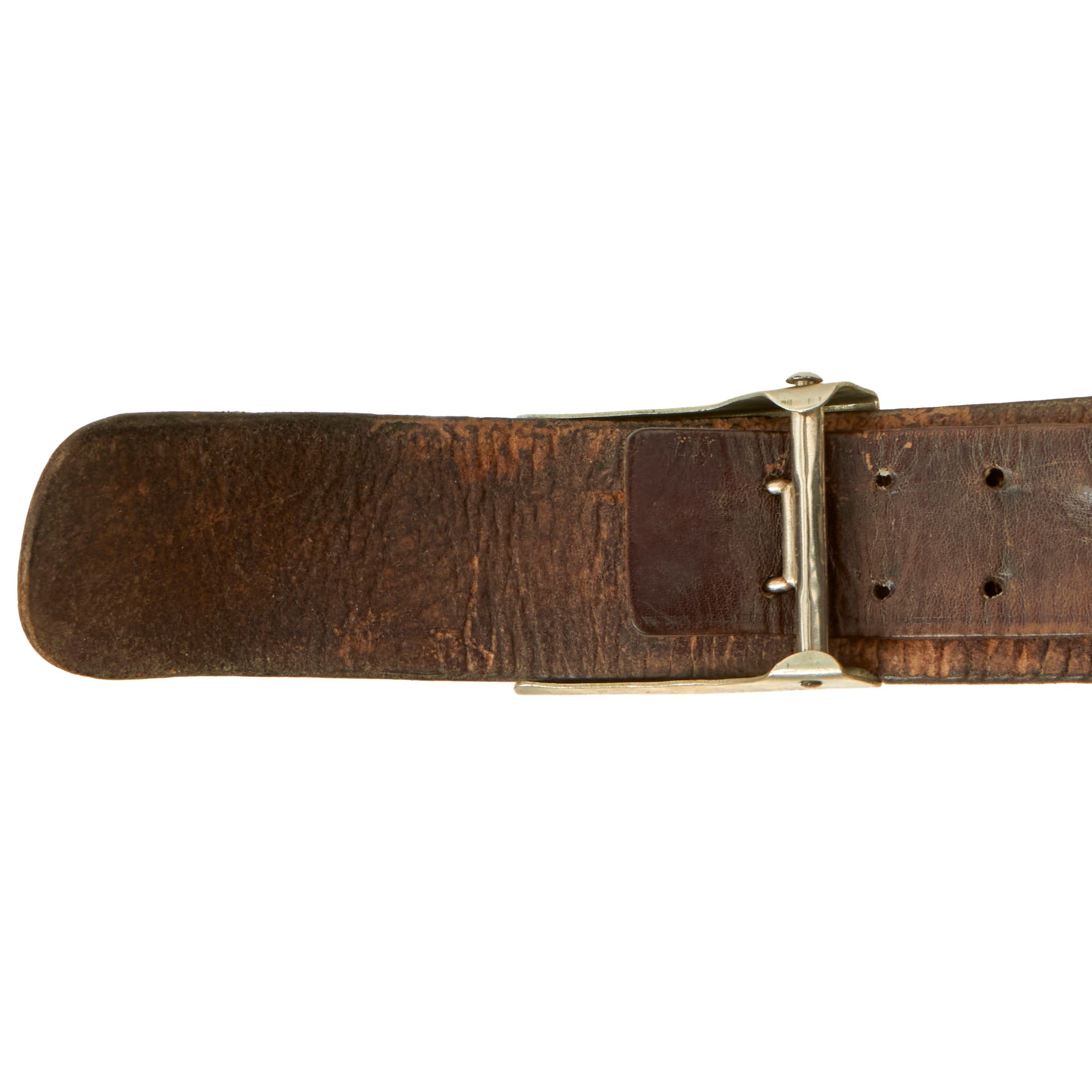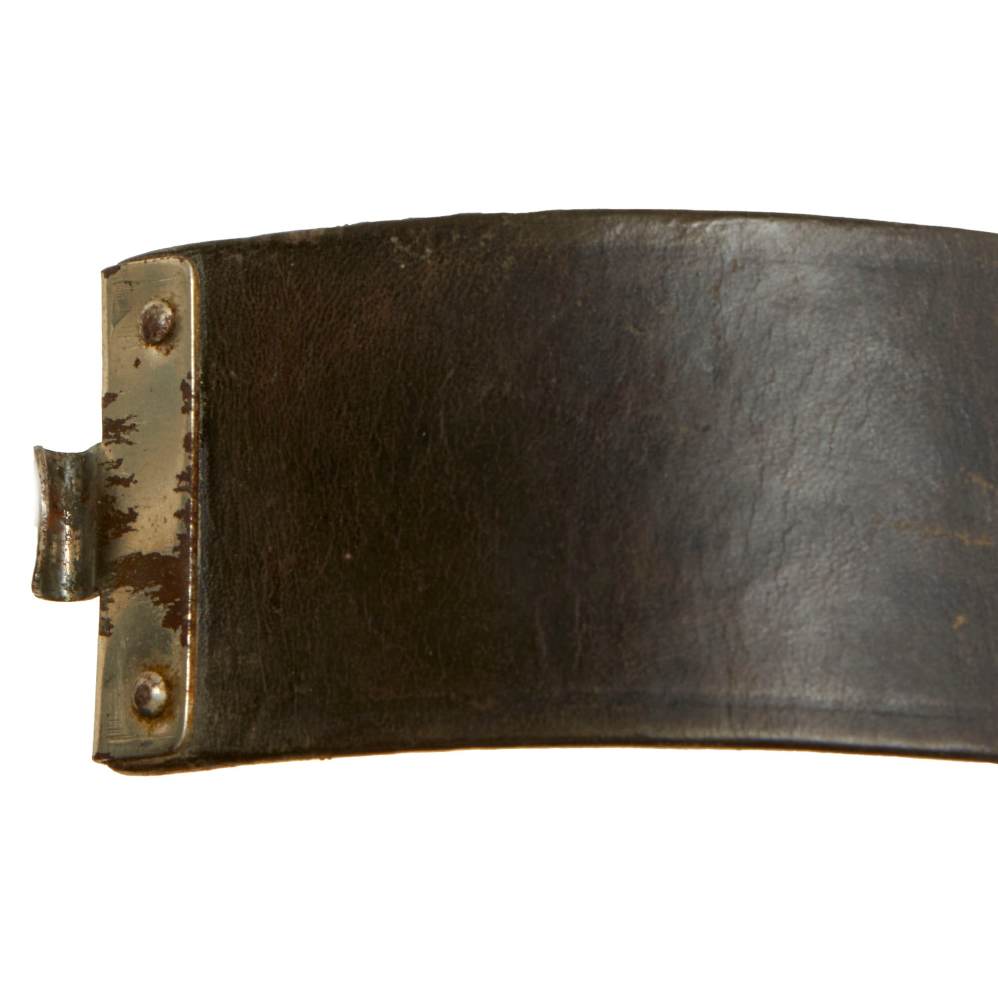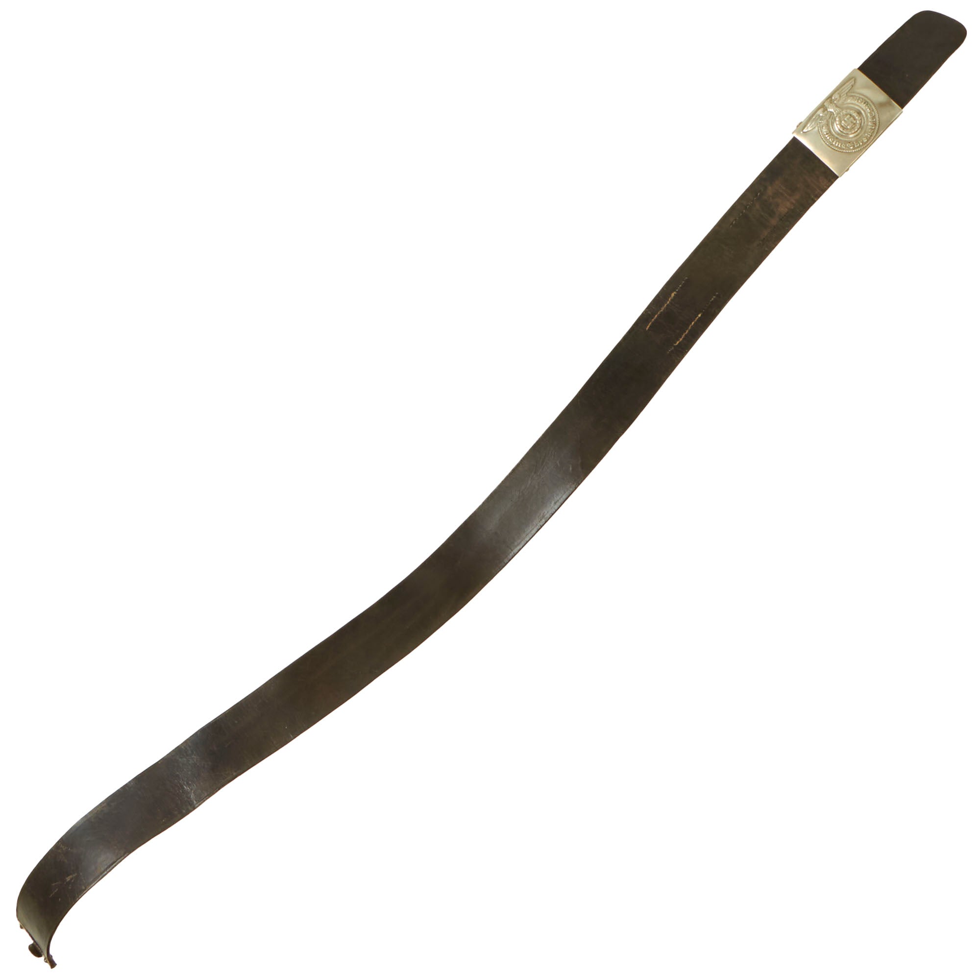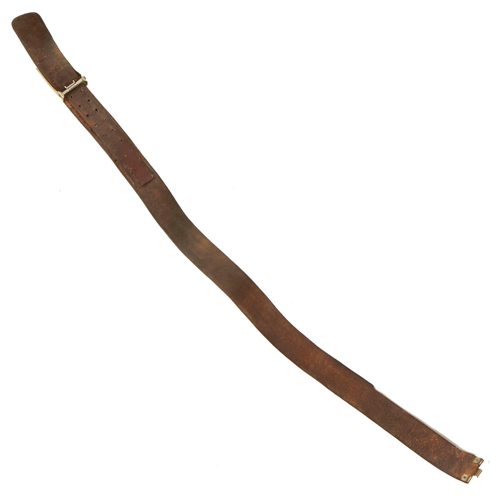 The black leather belt itself measures 38" when fully extended, and is marked faintly with what we believe to be an RZM code marking on the leather tab, but it is too faint to read. It retains the original leather adjustment tab with double rows of 7 holes for length adjustment. It shows only light wear, and does not appear to have been issued for any significant amount of time.
