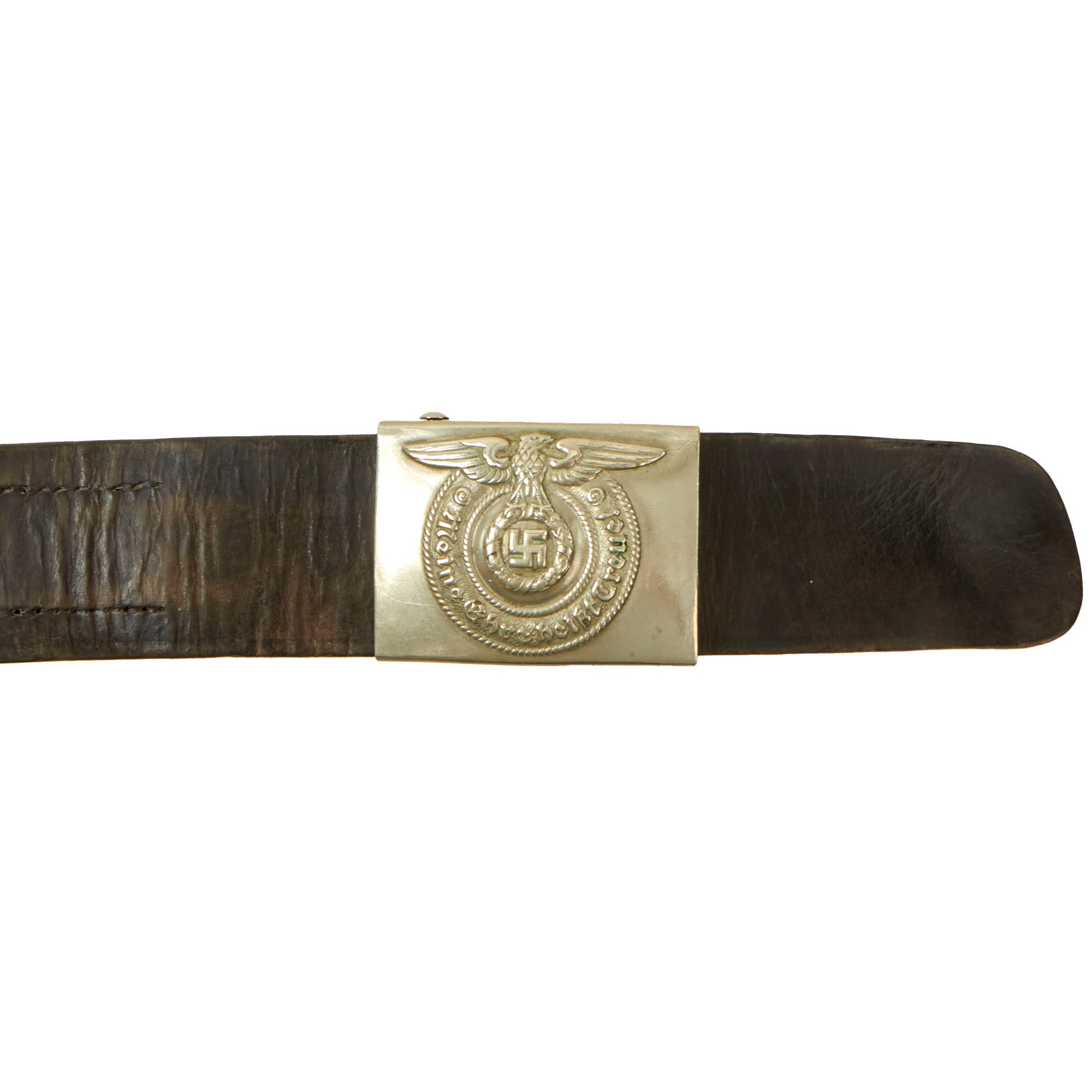 Original Item: Only One Available. This is an excellent condition German WWII Early Pattern (1932-1934) Schutzstaffel (SS) EM/NCO's Nickel Silver Belt Buckle (Koppelschloß), complete with an excellent leather belt! This is the correct set for an SS Allegemeine EM/NCO!
