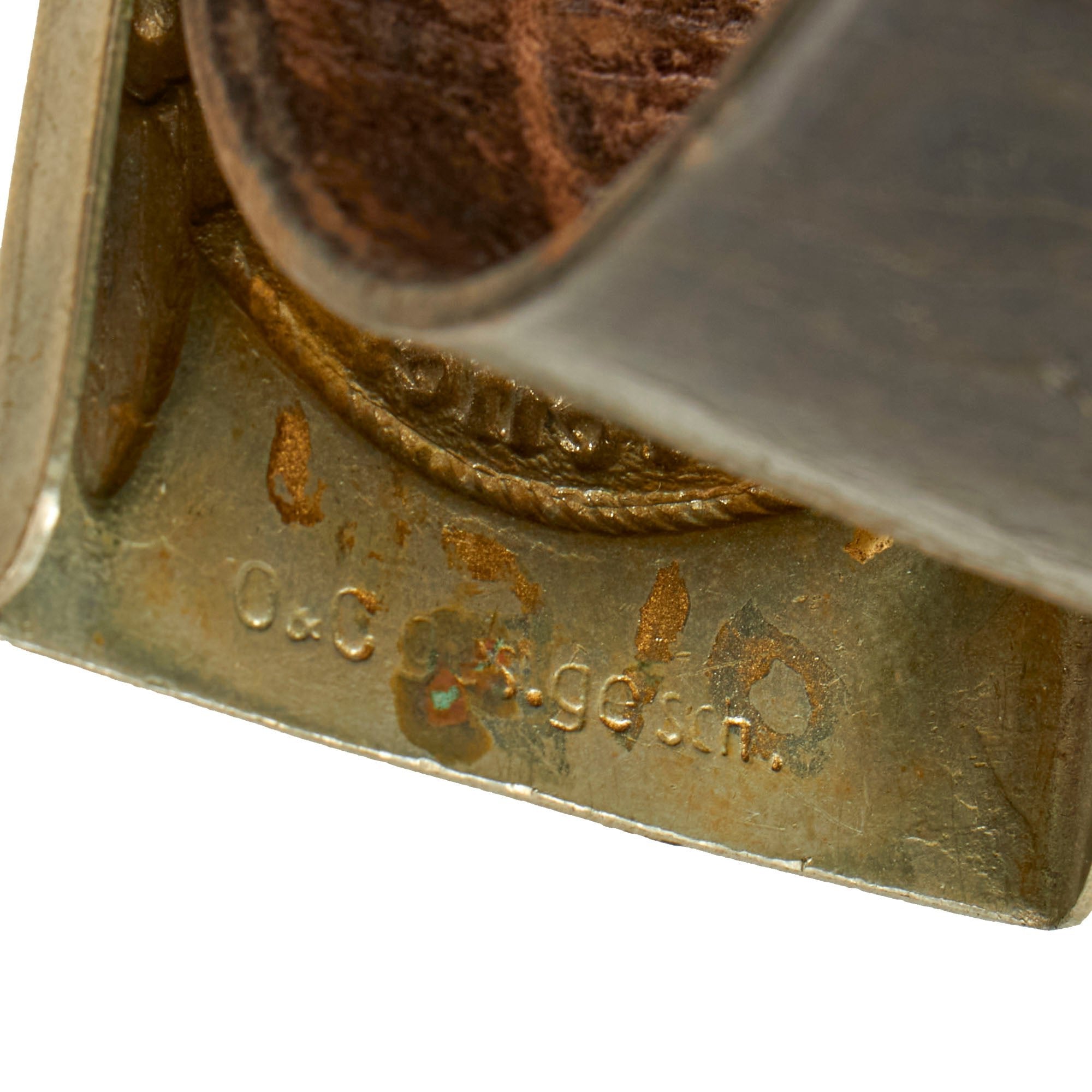 This is the marking for Overhoff & Cie. of Lüdenscheid, who was the designer of all the SS buckles, and at the beginning their exclusive authorized manufacturer. The abbreviation at the end is short Gesetzlich Geschützt (By-law Protected), indicating it was a protected design. The Nickel Alloy "German Silver" construction of the body indicates original production before 1936, when these buckles began to be made of aluminum alloy. By 1940 the material was changed to steel.