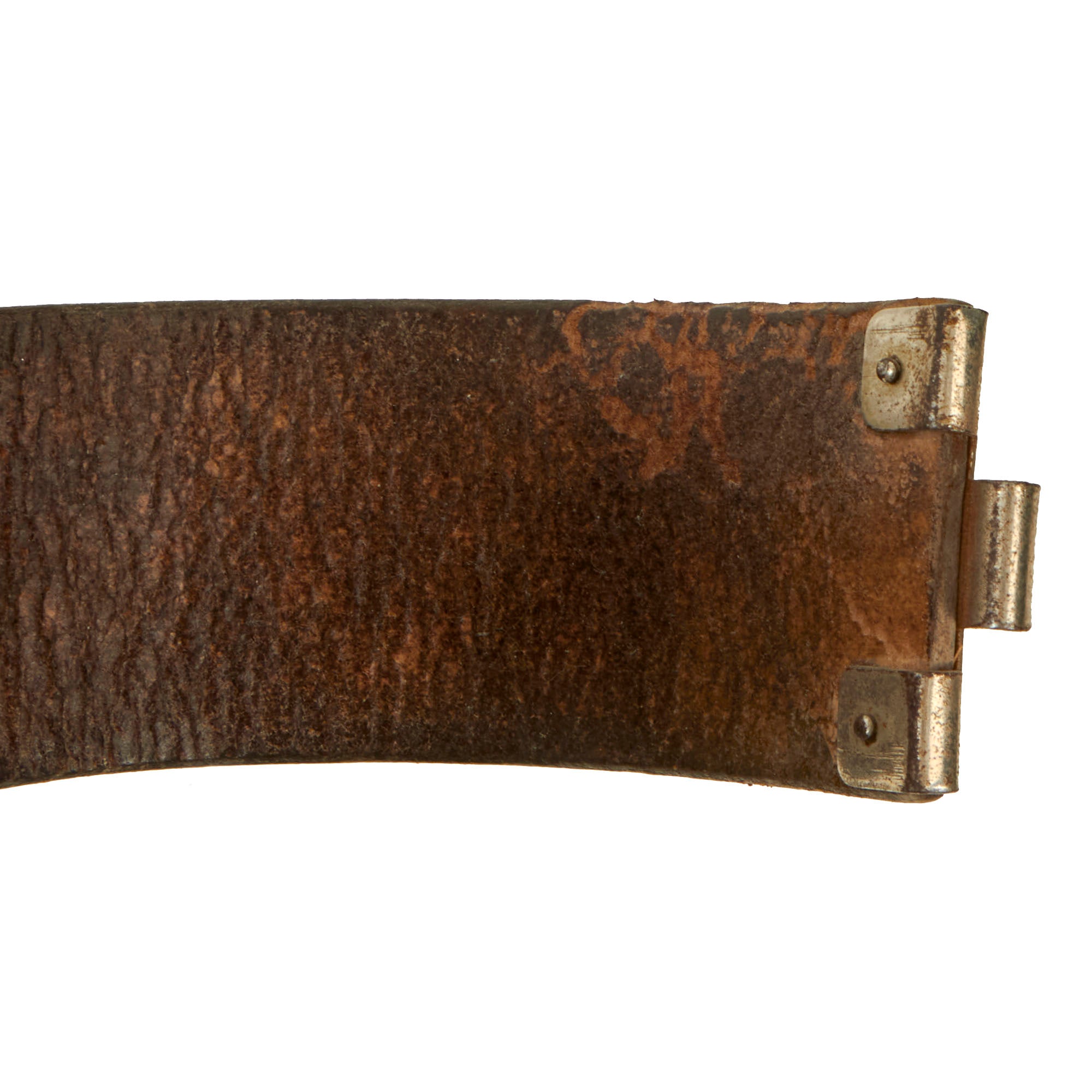 The buckle is embossed with a high relief, embossed, central motif pattern consisting of an SS style national eagle with out-stretched wings, clutching a wreath, encompassing a static swas (hook cross). The swas and wreath are in turn encompassed by a circular, simulated, twisted rope border with the Gothic script motto, Meine Ehre heißt Treue!, (My Honor is Loyalty!). There is just a bit of oxidation on the exterior of the buckle, with very little wear or deterioration of the exterior. The steel buckle claw still retains almost all of the plating.
