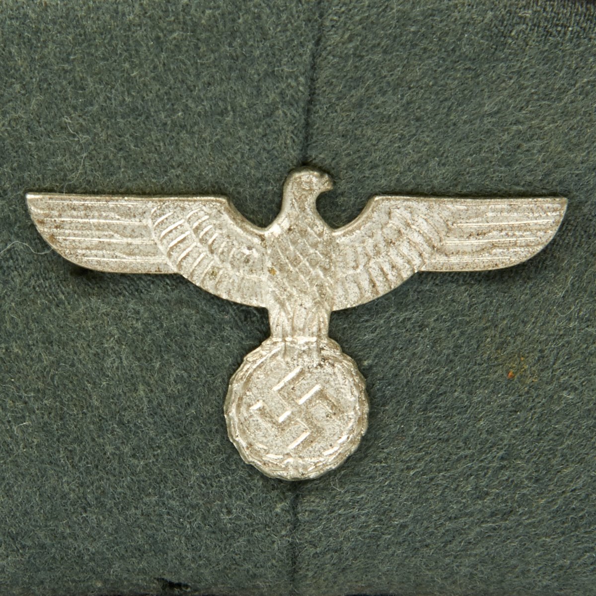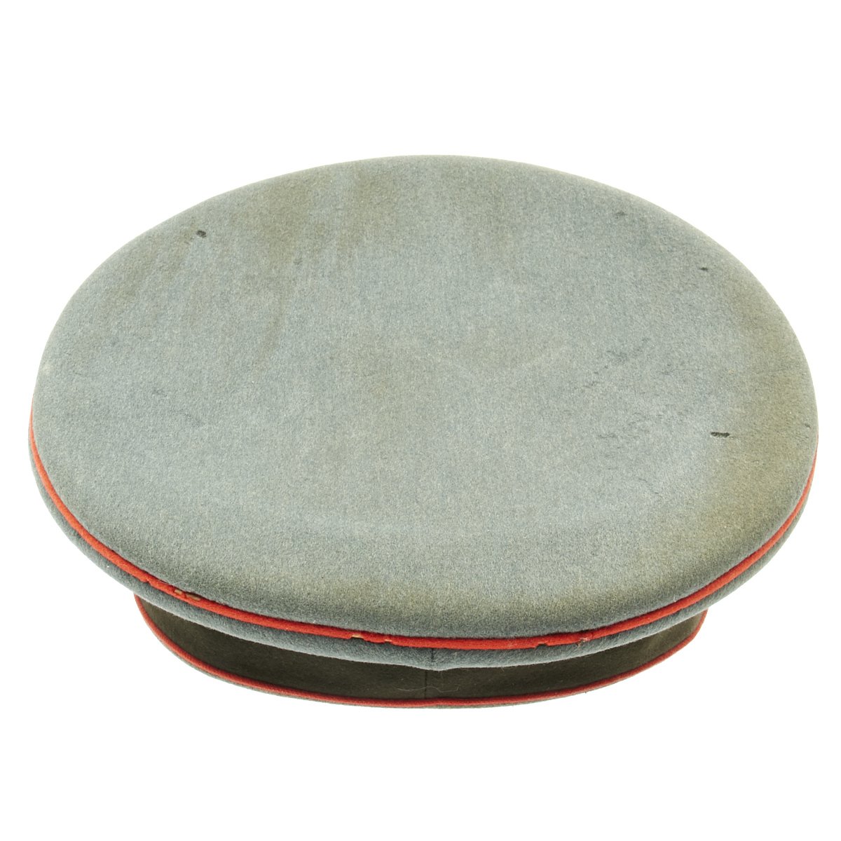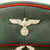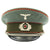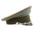 Body exterior is constructed of correct grey green smooth wool with red wool piping around top and around the dark green wool cap band. Eagle is made of stamped silver grey metal, wreath is stamped metal with an early war metal cockade. Chinstrap is the standard type made of silver aluminum wire, the visor brim is thin fiber type with black gloss finish.