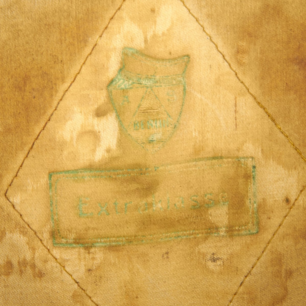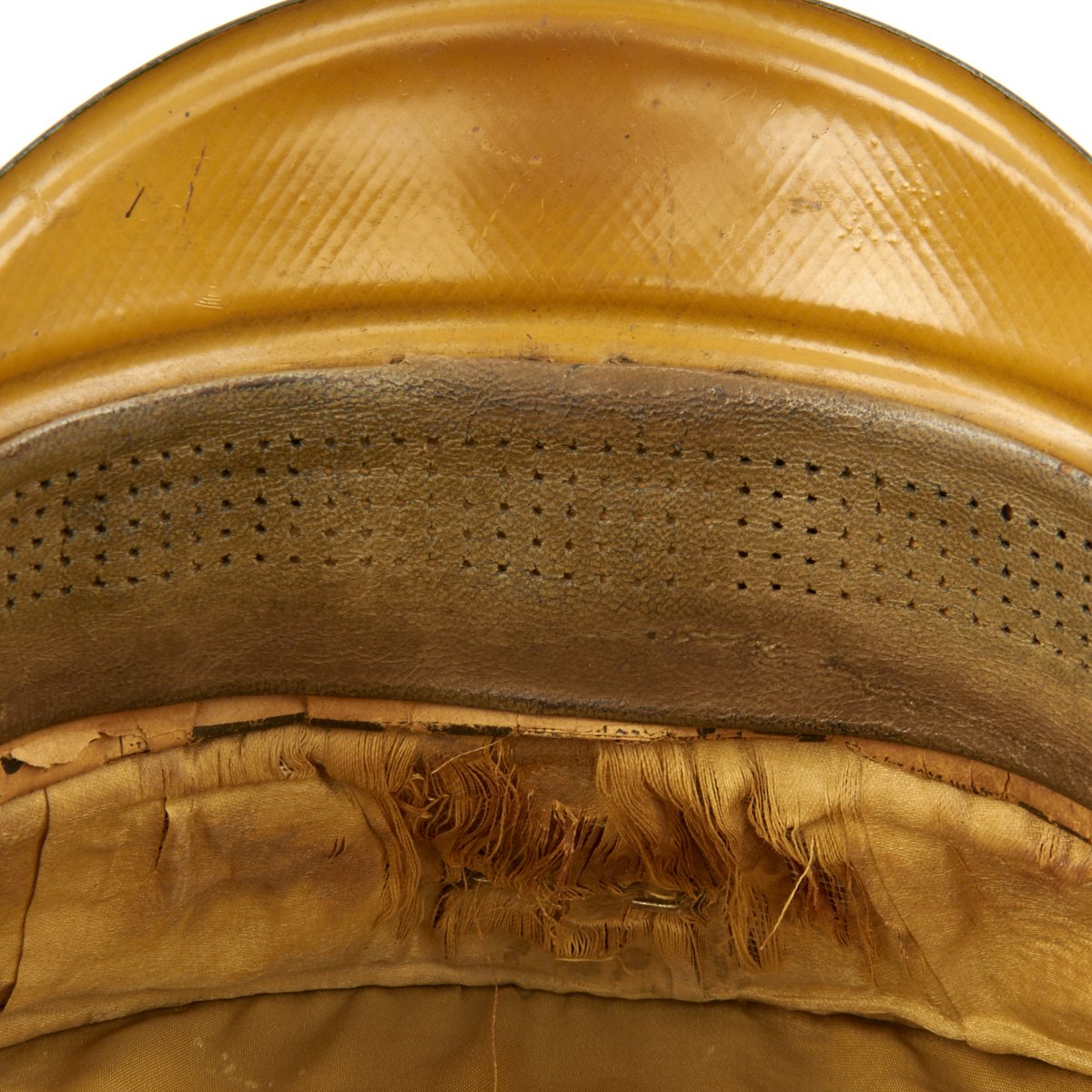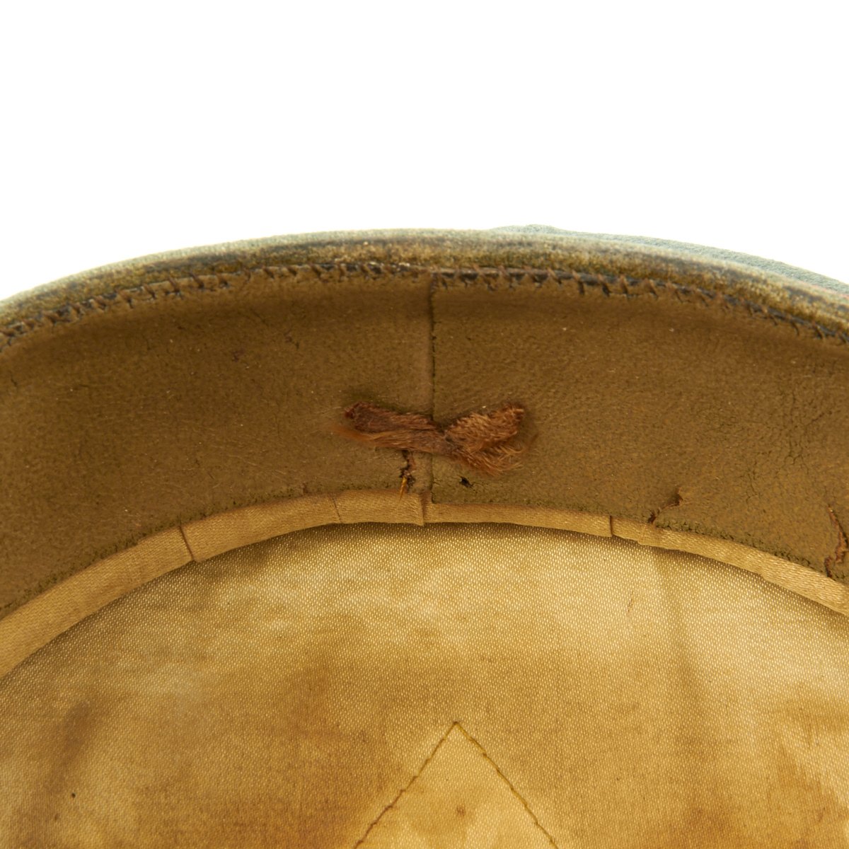 The interior condition is very nice with minor wear to the lining. The cap’s exterior is near excellent with light field wear and some minor moth nips. This is a genuine officer service cap that was worn and used in the field of combat.