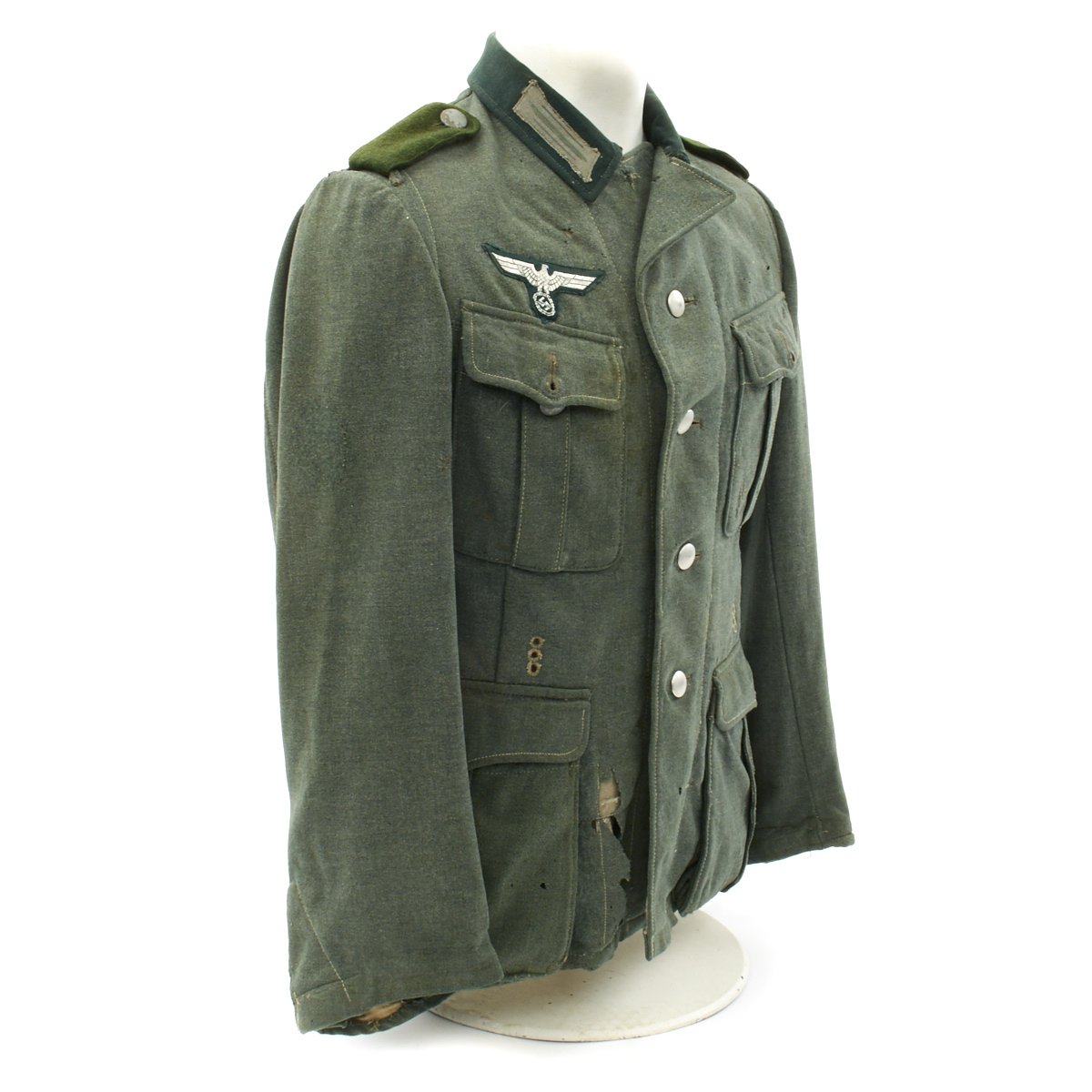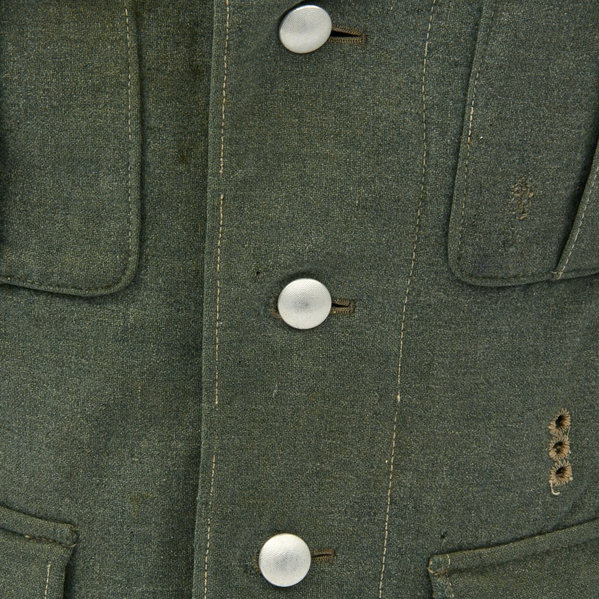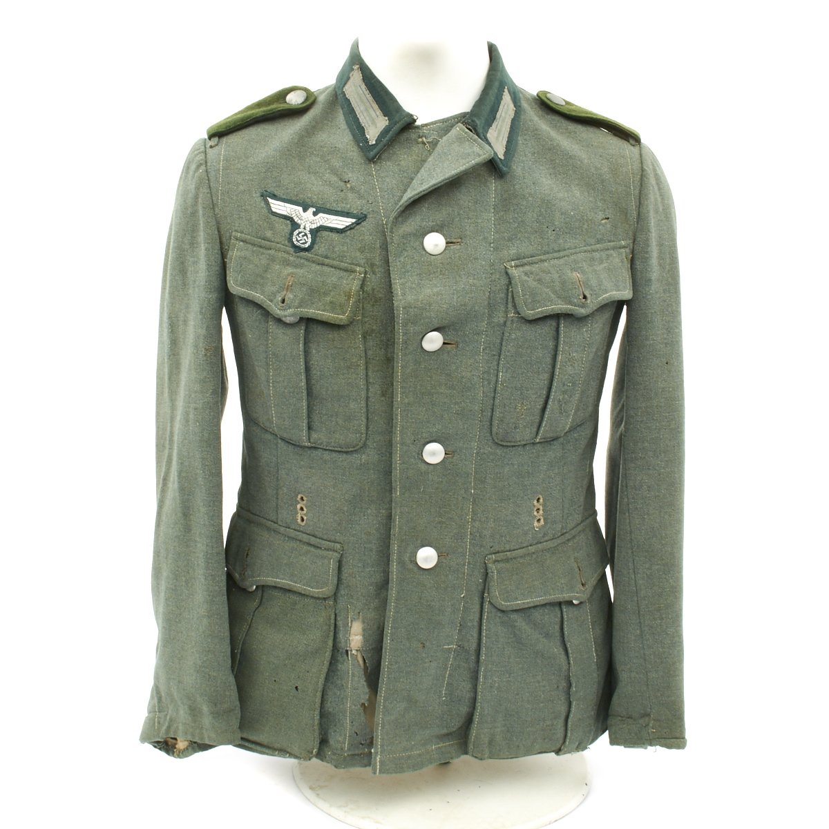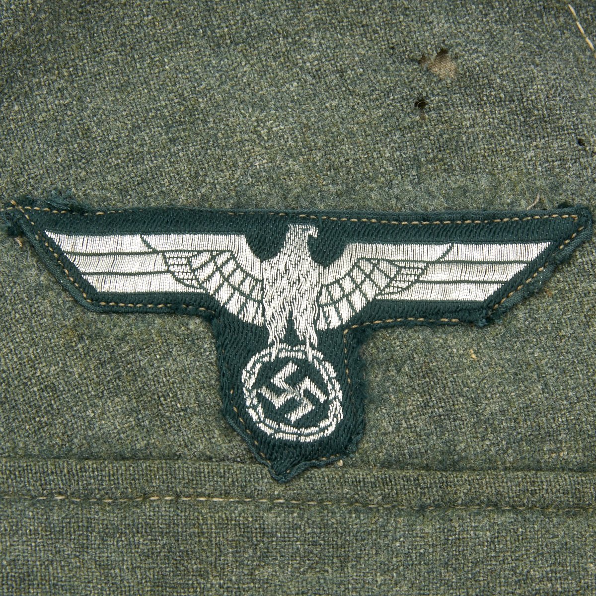 - Original Item: Only One Available. This is a well worn, early war, most likely combat used, Model 1936 wool German WWII Army tunic for an enlisted man. The tunic features four pockets with scalloped flaps and pebbled aluminum buttons. Interestingly it is post war marked "Bavaria-filmkunst" which was a film studio in German after the war manning this tunic was used as a costume piece. However, there is no doubt that it is an original WWII issue tunic, but it does appear that the BeVo style eagle was reapplied. Overall condition is good with multiple repairs and signs of use. Size is approximately a US 38.