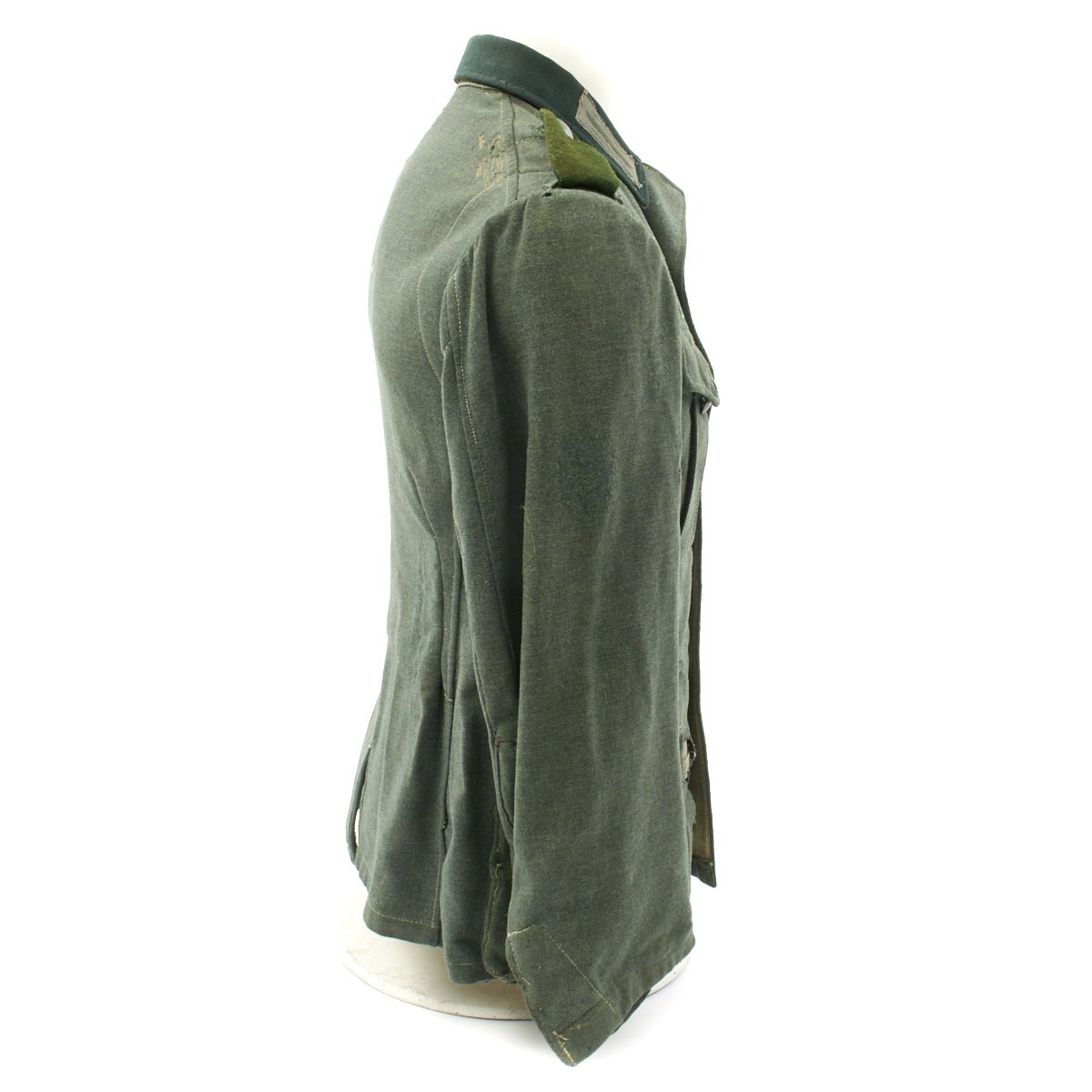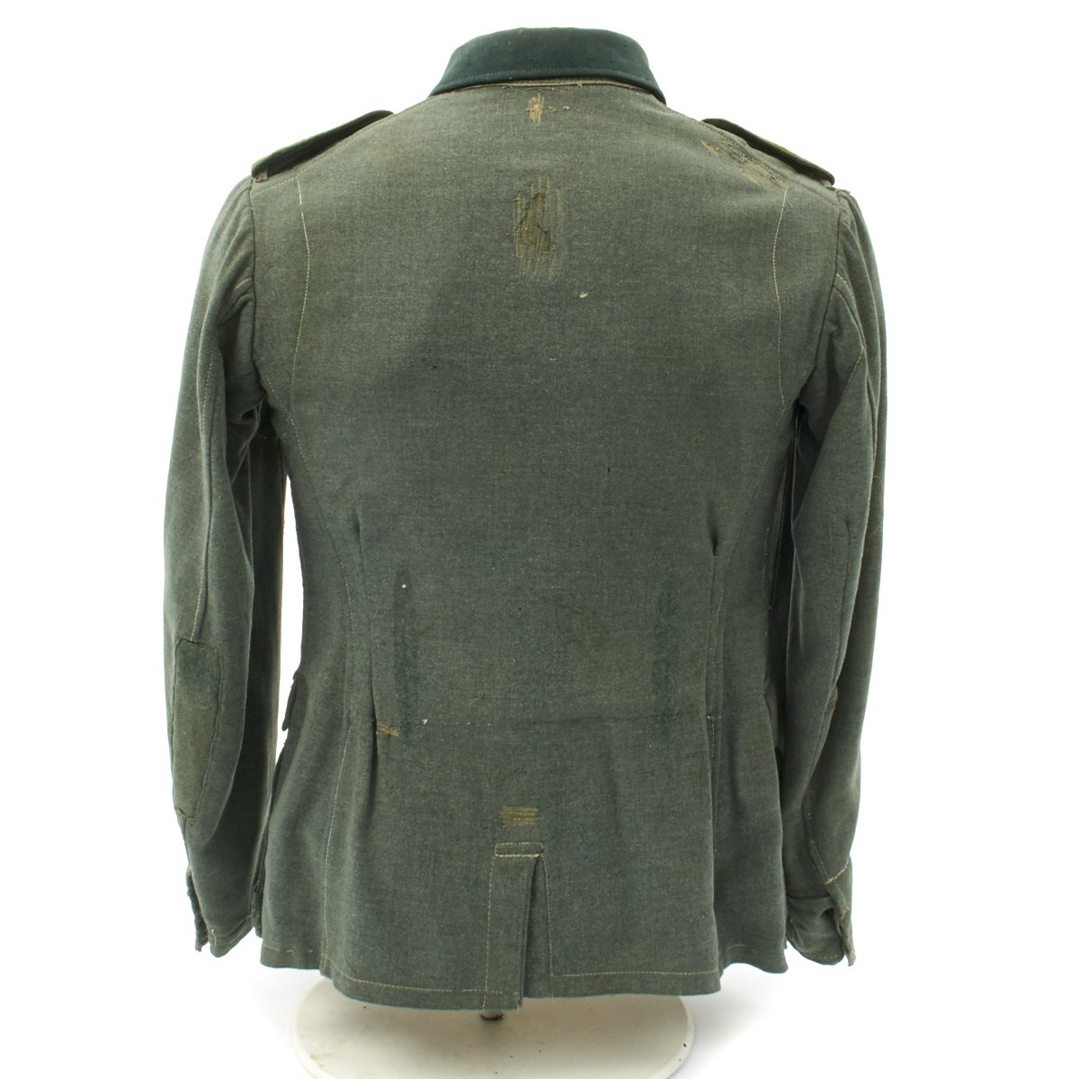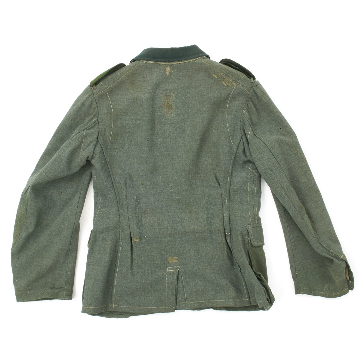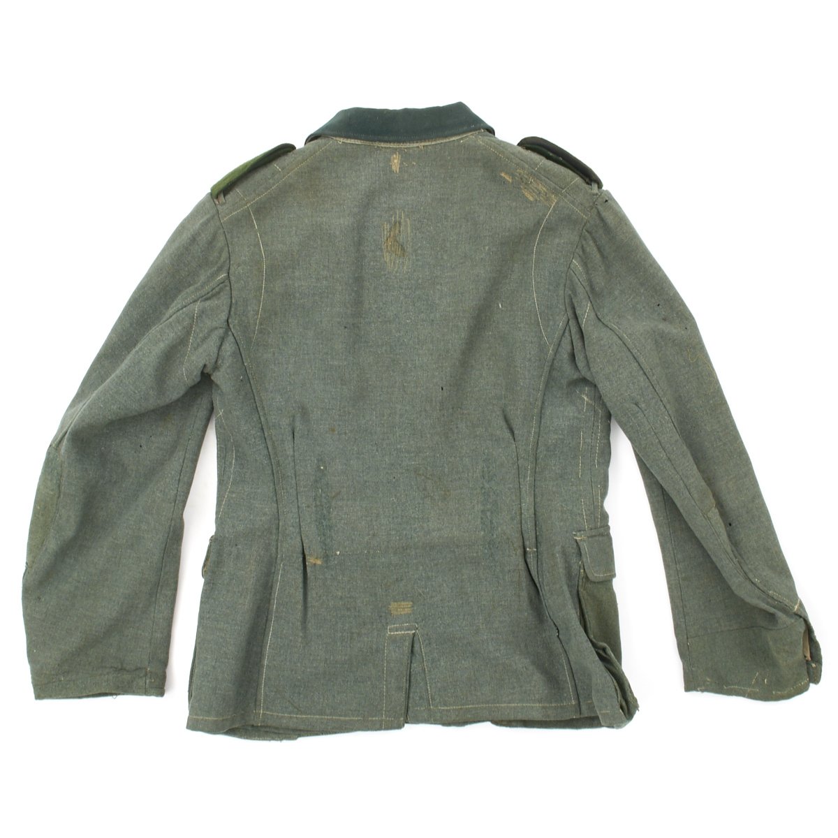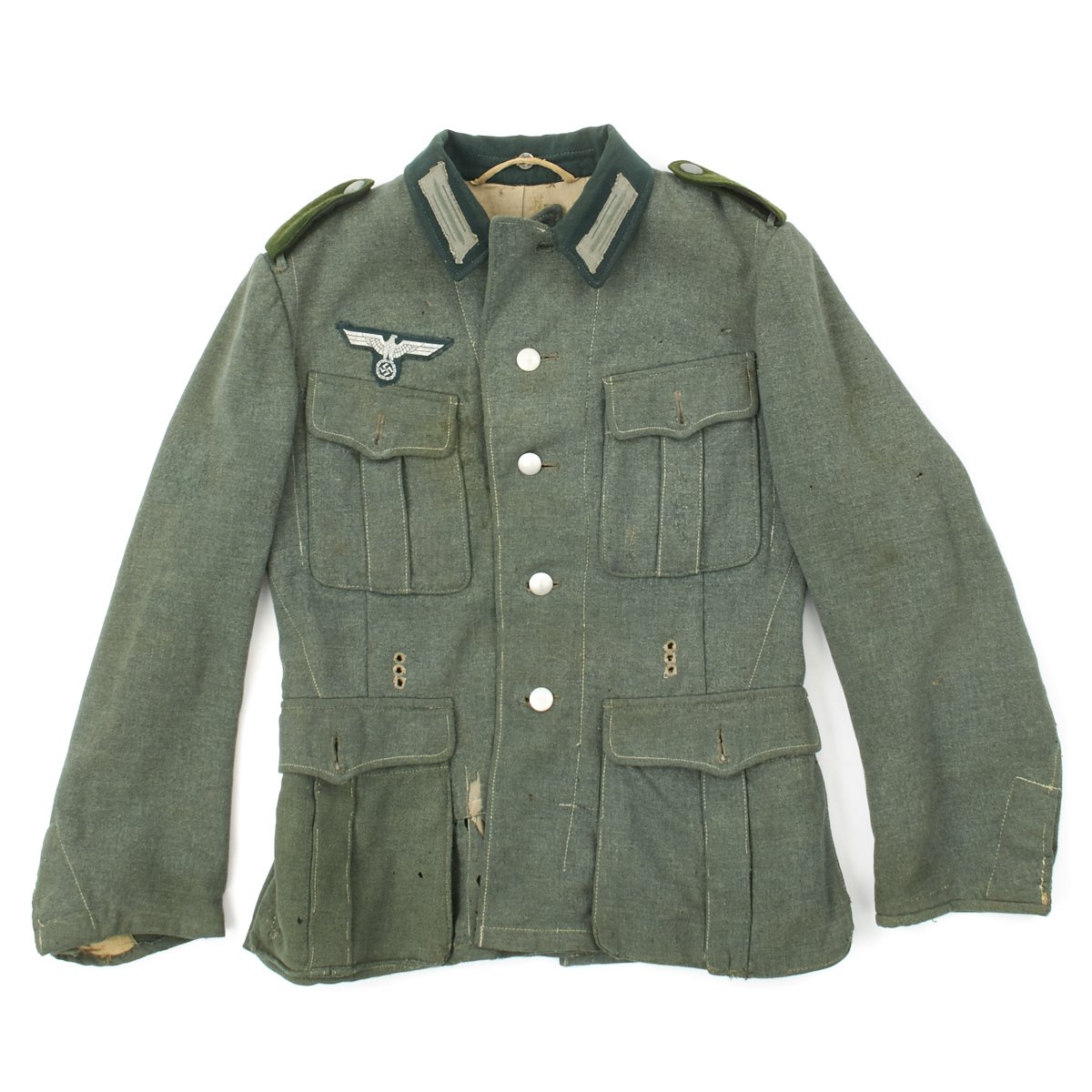 - Original Item: Only One Available. This is a well worn, early war, most likely combat used, Model 1936 wool German WWII Army tunic for an enlisted man. The tunic features four pockets with scalloped flaps and pebbled aluminum buttons. Interestingly it is post war marked "Bavaria-filmkunst" which was a film studio in German after the war manning this tunic was used as a costume piece. However, there is no doubt that it is an original WWII issue tunic, but it does appear that the BeVo style eagle was reapplied. Overall condition is good with multiple repairs and signs of use. Size is approximately a US 38.