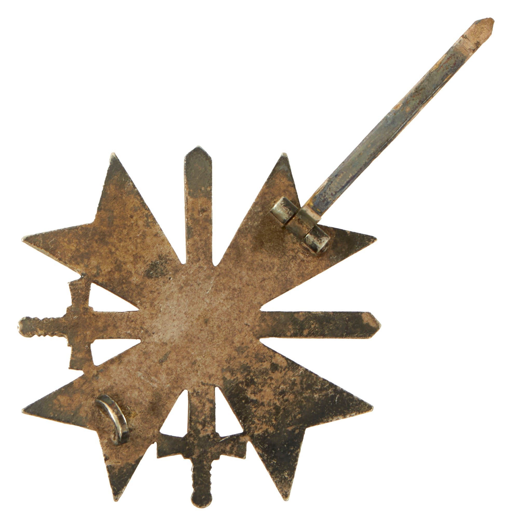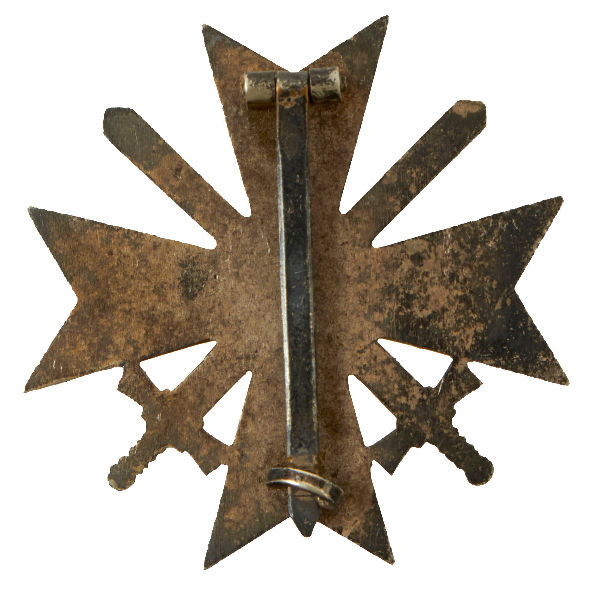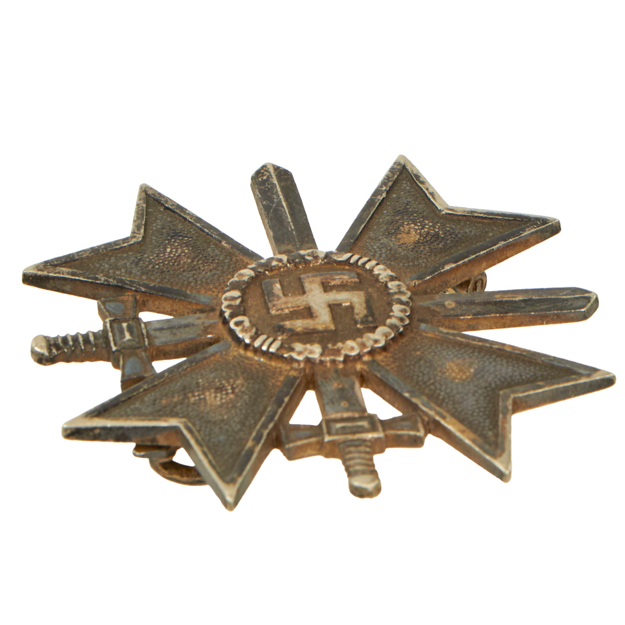 Original Item: Only One Available. This is a very nice early example of a War Merit Cross KvK 1st Class in Silver with Swords (Kriegsverdienstkreuz I. Klasse mit Schwertern), issued for meritorious action related to combat during the NSDAP Period. There is no maker mark on this badge, but that is not uncommon, and in fact the majority of badges produced were unmarked. Sometimes specific aspects of the design can indicate a manufacturer. This early war example in silvered Tombak still retains much of the silver plating on both sides, with some lovely tarnishing on much of the badge, showing that it is plated with real silver. It retains sharp details to contours and pebbles to internal cross arms, with no bent areas or other deformation of the design.