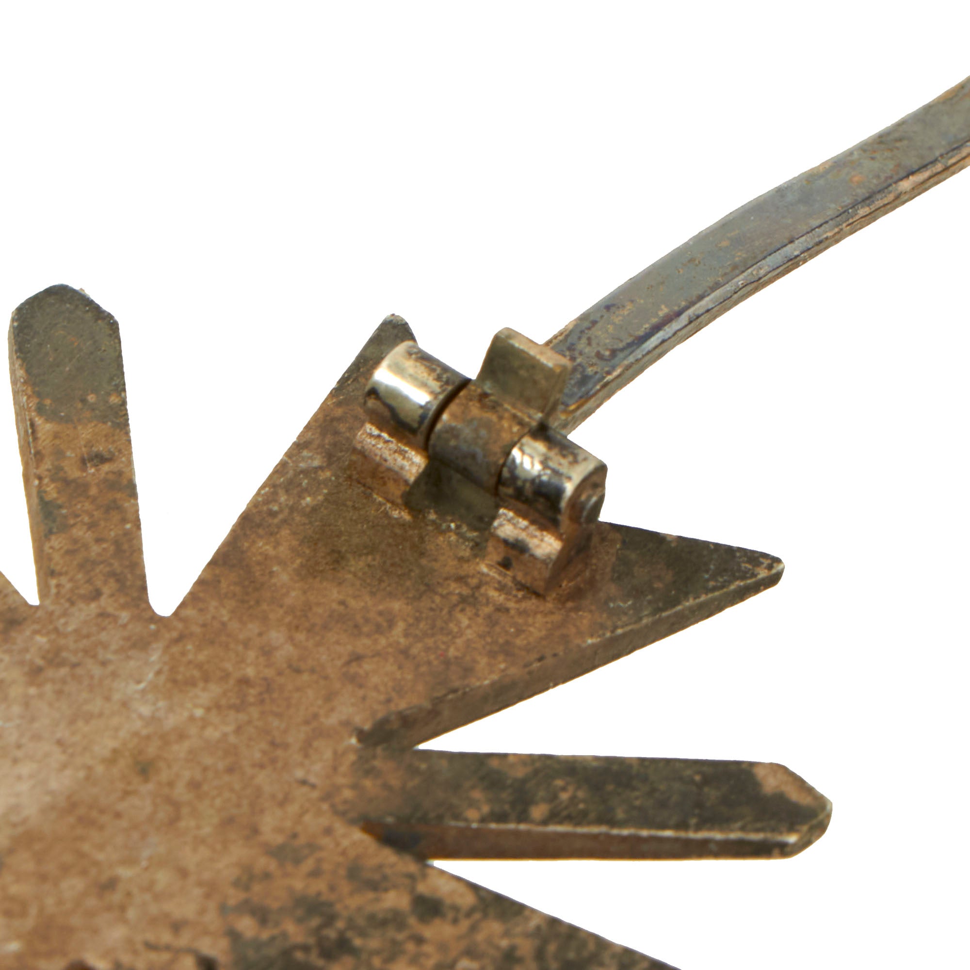 The badge is totally non magnetic, with a straight alloy pin attached to a barrel hinge, which is secured on the other end by a bent flat wire catch attached to the back of the badge. The pin is a bit bent, as is the catch, but both are still fully functional.