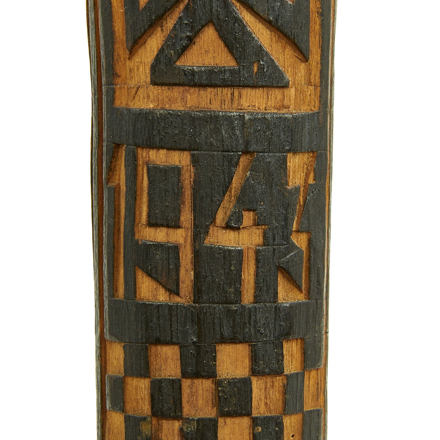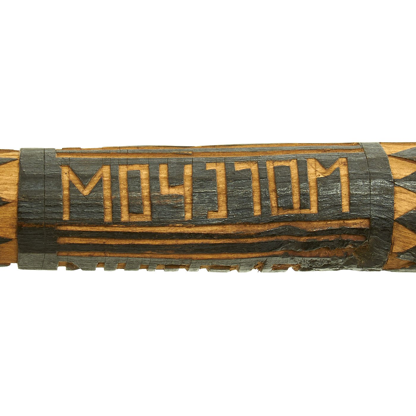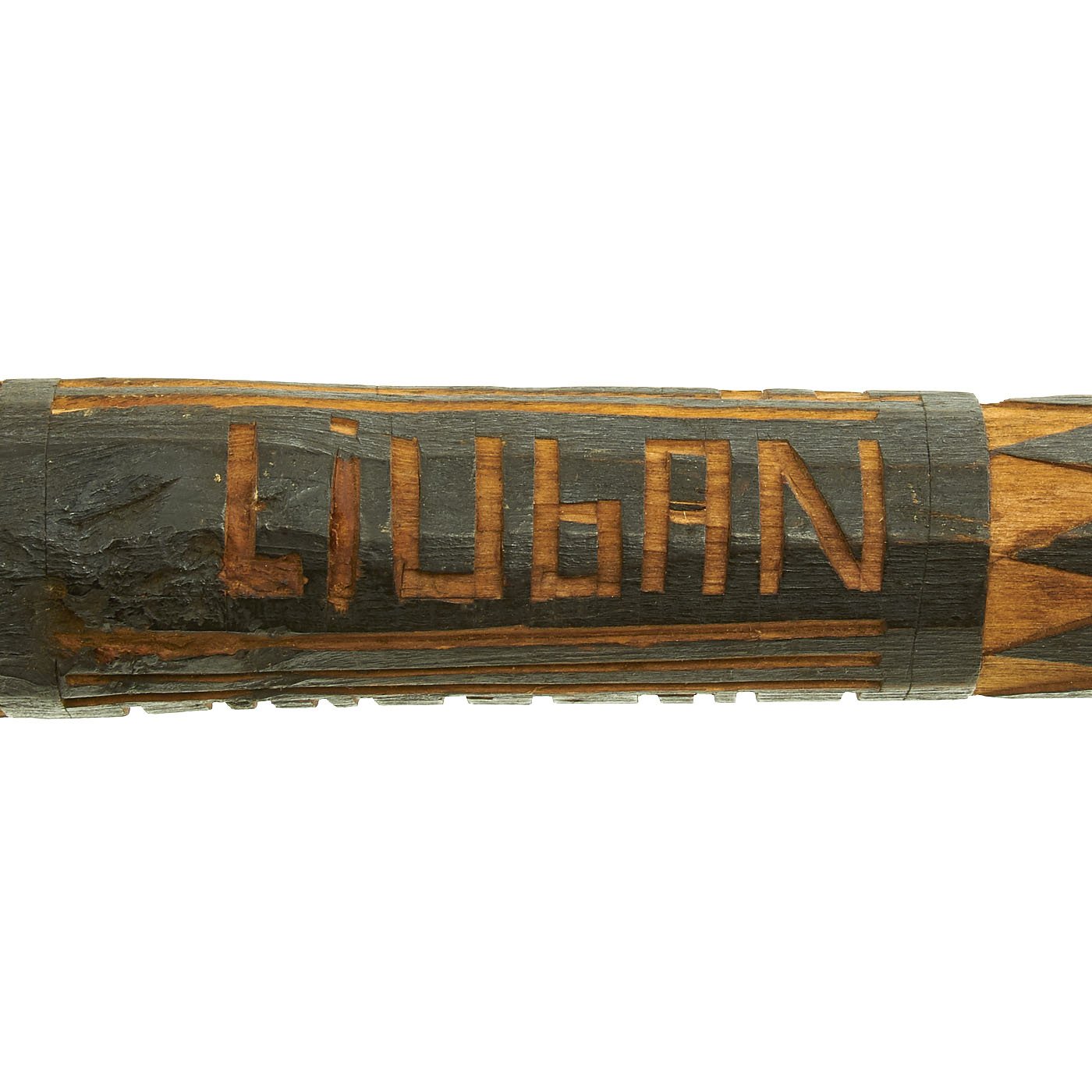 There are two city names carved into the stick: WOLCHOW and LIUBAN, which are the German names for eastern front areas. The first would be the namesake of these walking sticks, the Russian Volkhov Front area. The second references the Battle of Lyuban, one of the battles on the Volkhov front. There is also the date of 1943 between the two city names, probably the year the stick was made as a memento of their time in Russia.