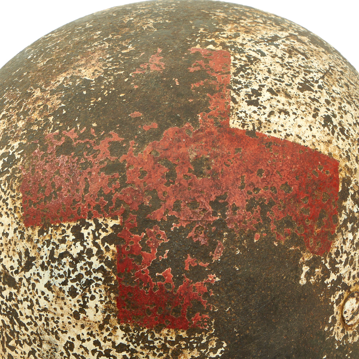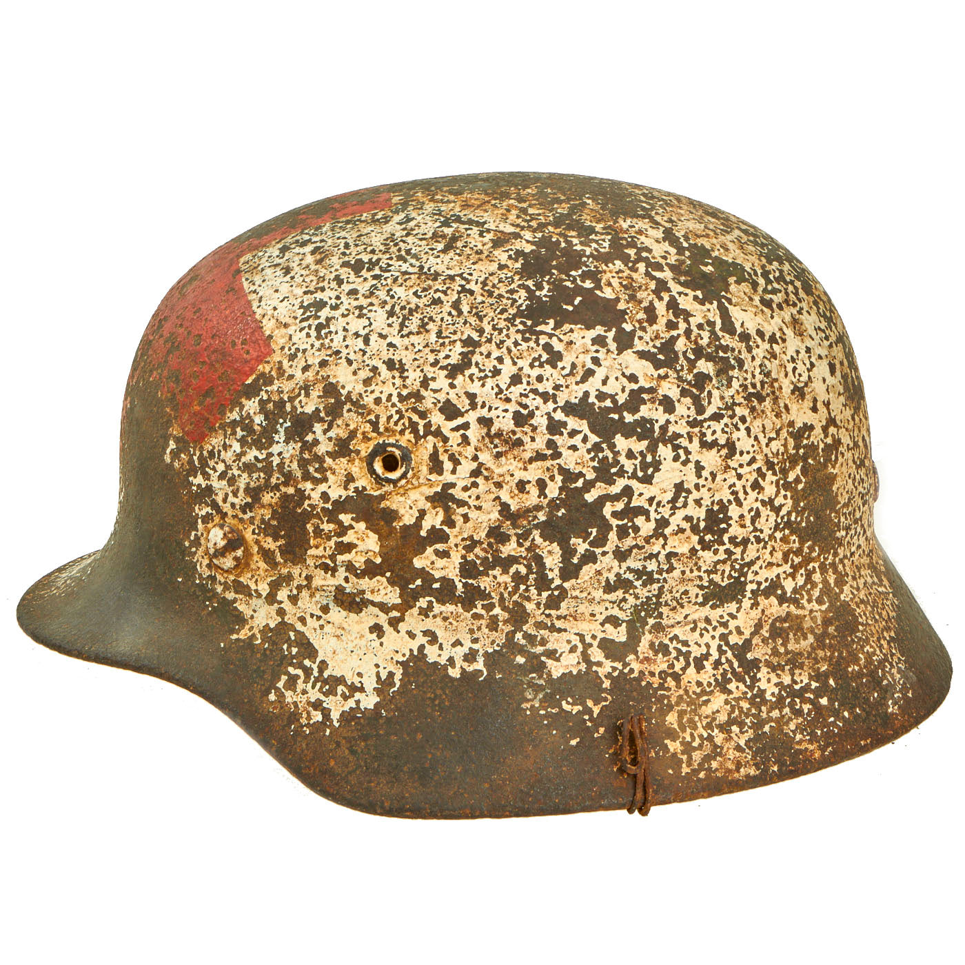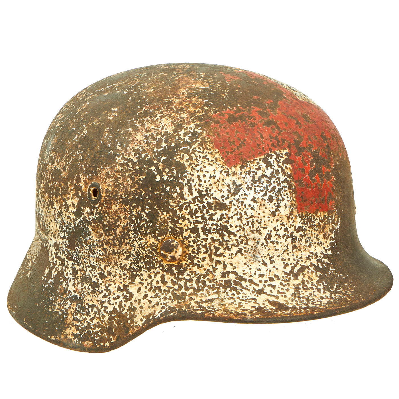 Original Item: One of a Kind. This is a fantastic example of a relic condition German Medic Winter Camouflage M40 helmet. The iconic Red Cross, a vivid symbol of home for the wounded soldier hoping for medical attention, especially in the harsh conditions of the Western Front during WWII.