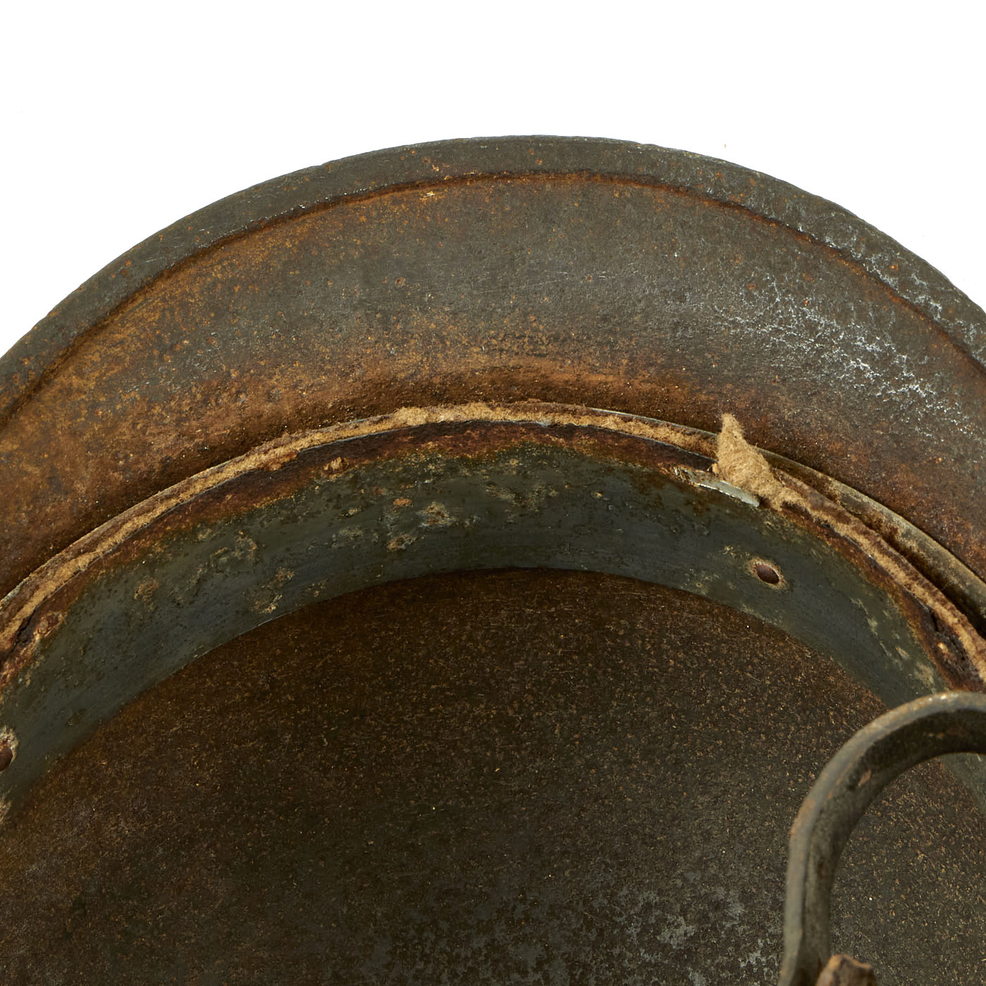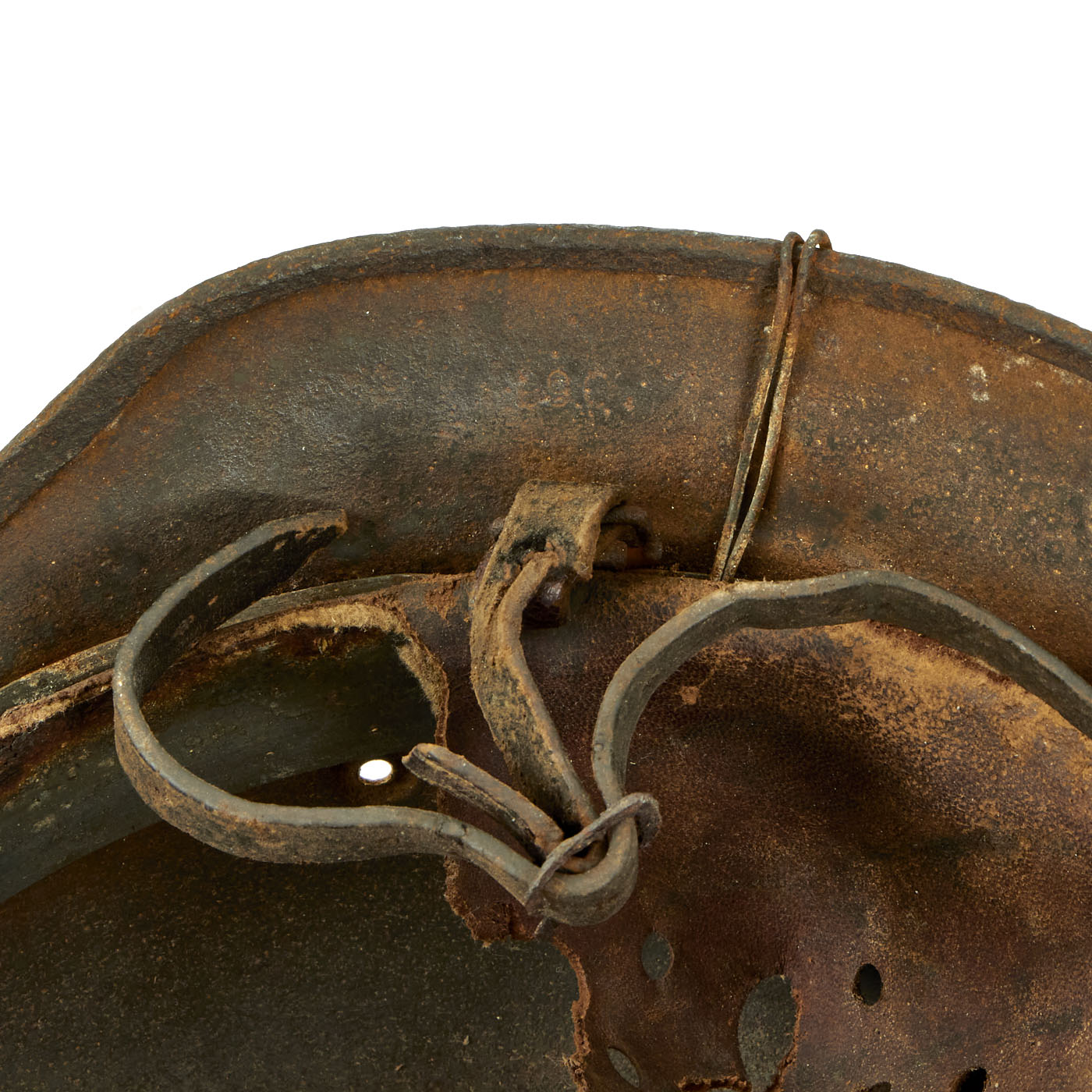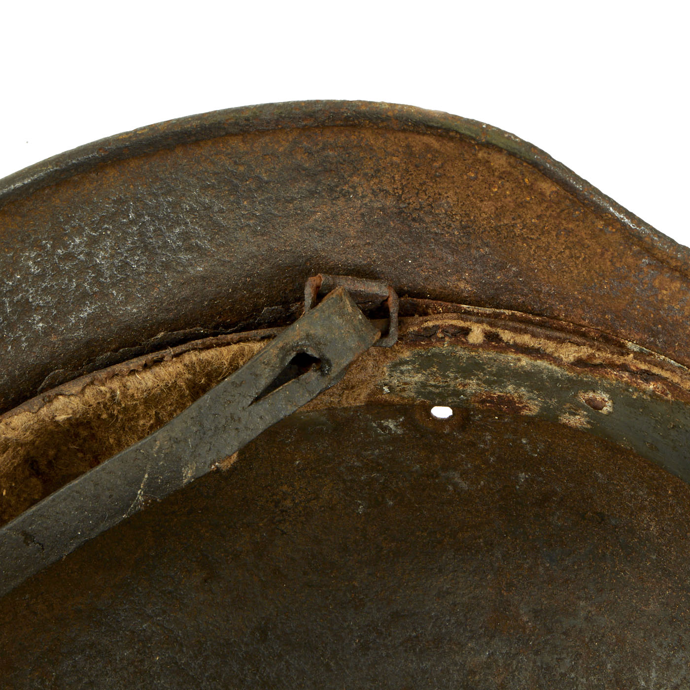 The helmet itself is an M40 (model 1940) and is stamped Q66. Q is the maker code for the Quist in the German city of Esslingen. Size 66 is a nice large size that can accommodate liners from 58cm to 60cm or US 7 1/4 to 7 1/2. Size 66 shells are always hard to find and are therefore more valuable to a collector. Unfortunately, the only thing that remains of the liner is the liner band and just small pieces of the felt and leather. Surprisingly enough the helmet retains an intact chinstrap! The buckle on the chinstrap is degraded and broken but still present.