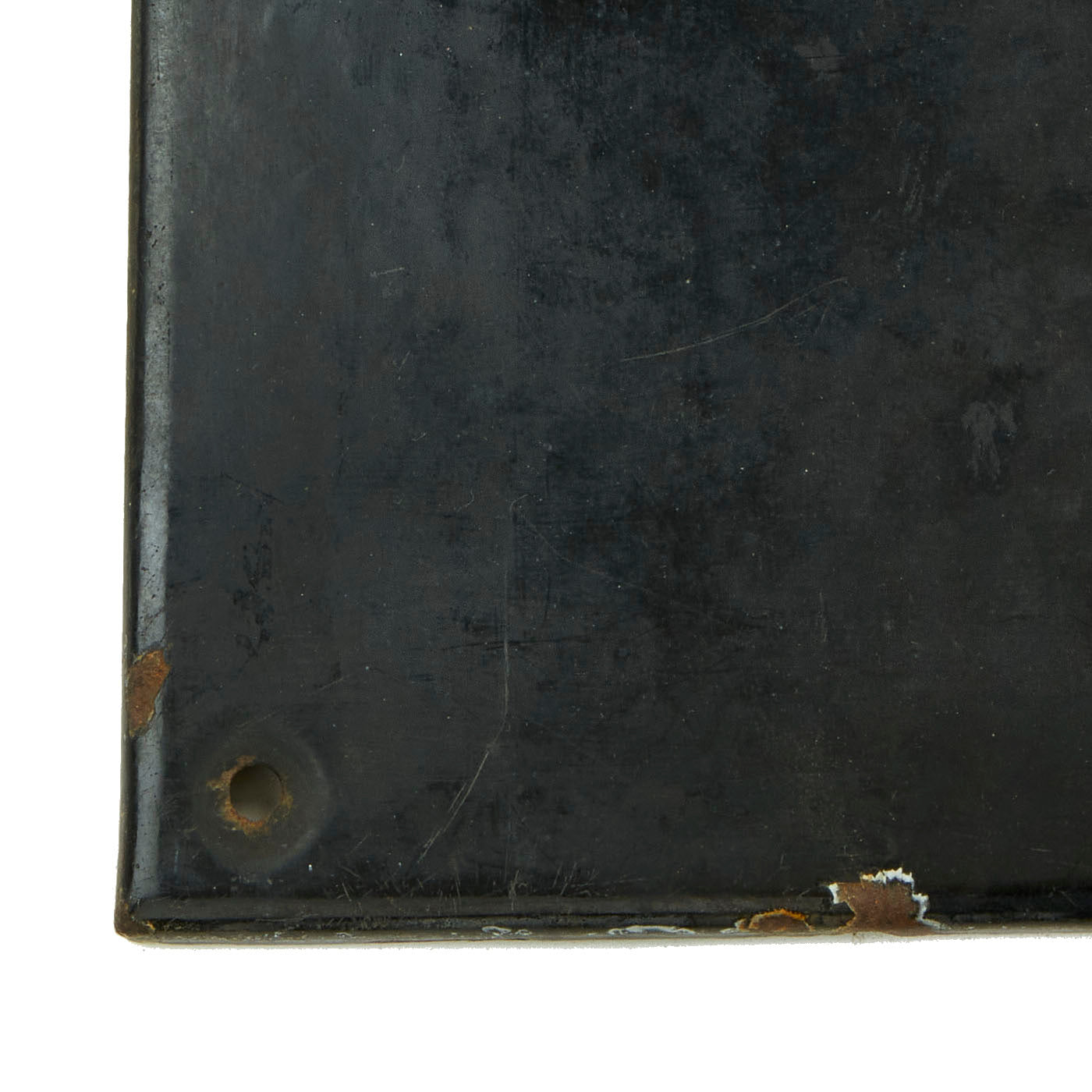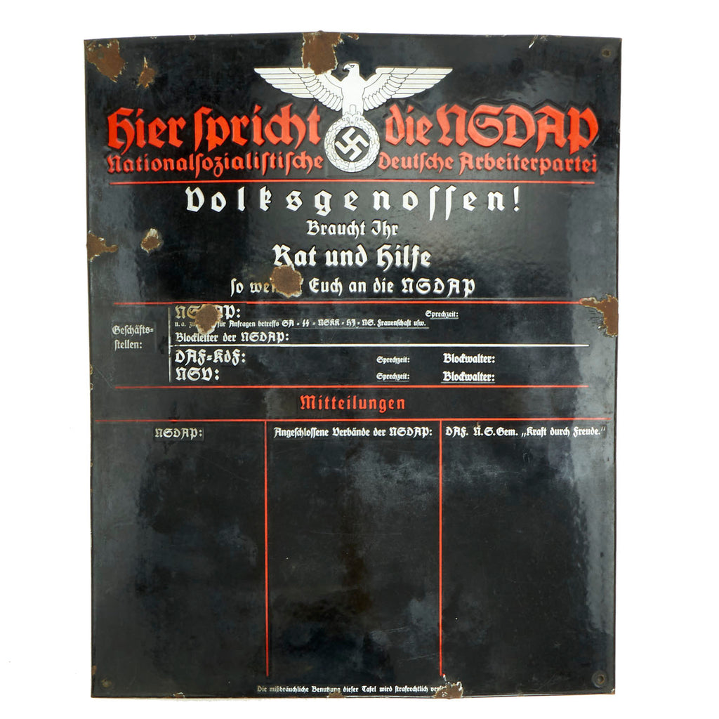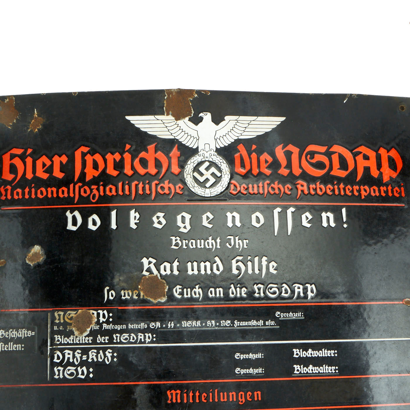 Original Item: Only One Available. This is a wartime heavy steel enameled slightly vaulted NSDAP announcement and schedule sign. This is a very robust well-made sturdy sign, with typical construction details of German government signage. It is black with deep red and white lettering. This totally original mid 1930s manufactured enamel announcement board that lists all the major Third Reich organizations, such as NSDAP, SA, SS, NSKK, HJ, NS-Frauenschaft, DAF / KDF and NSV.