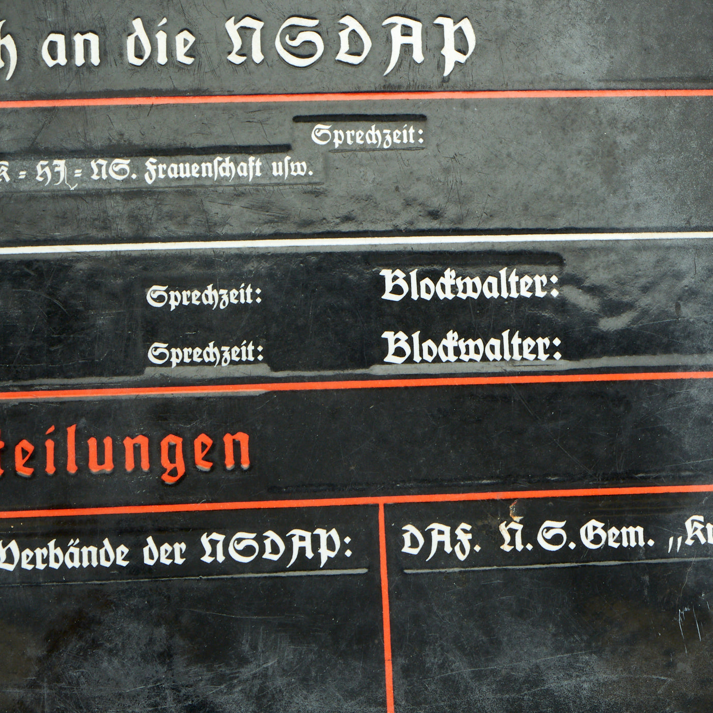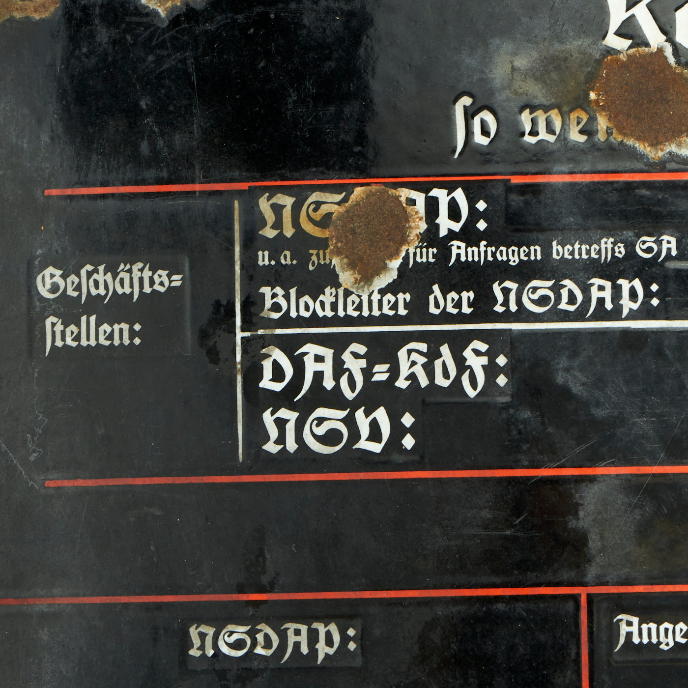 These signs usually were typically mounted in the hallways of official buildings as well as in bigger residential apartment complexes and the "Blockwart", the lowest rank in the NSDAP rank order put the latest news of the different NSDAP organizations on the board so every fellow "Volksgenosse" (a typical Third Reich expression that meant a, preferably Aryan, German in good standing) knew what was going on in the Reich.