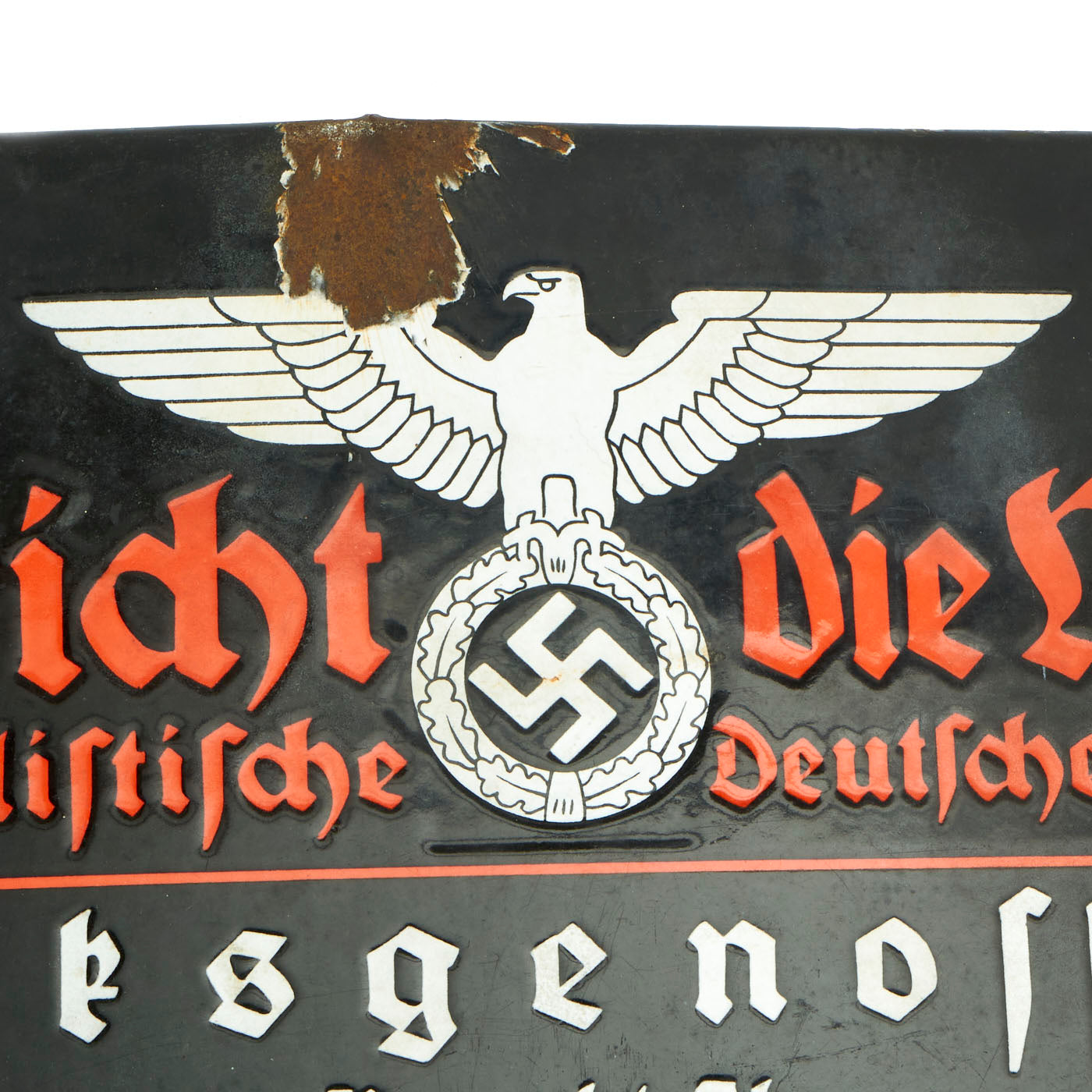 Signs of this nature were quickly destroyed after the fall of Germany in April 1945, ones like this were salvaged by USGIs who wanted to bring home a trophy of war. Therefore, finding authentic (beware many fakes) enamel signs from the Third Reich have become quite difficult in the collector's market.
