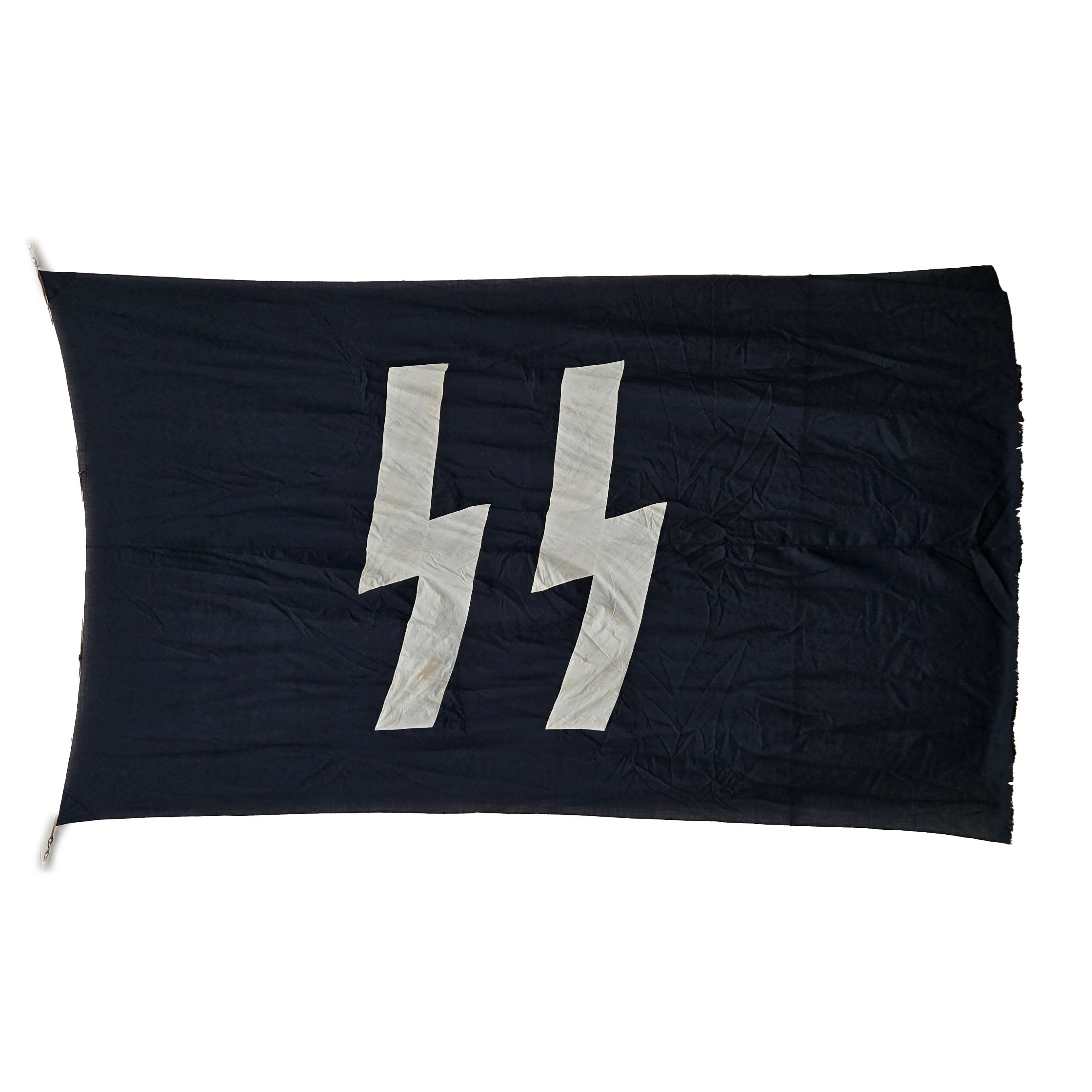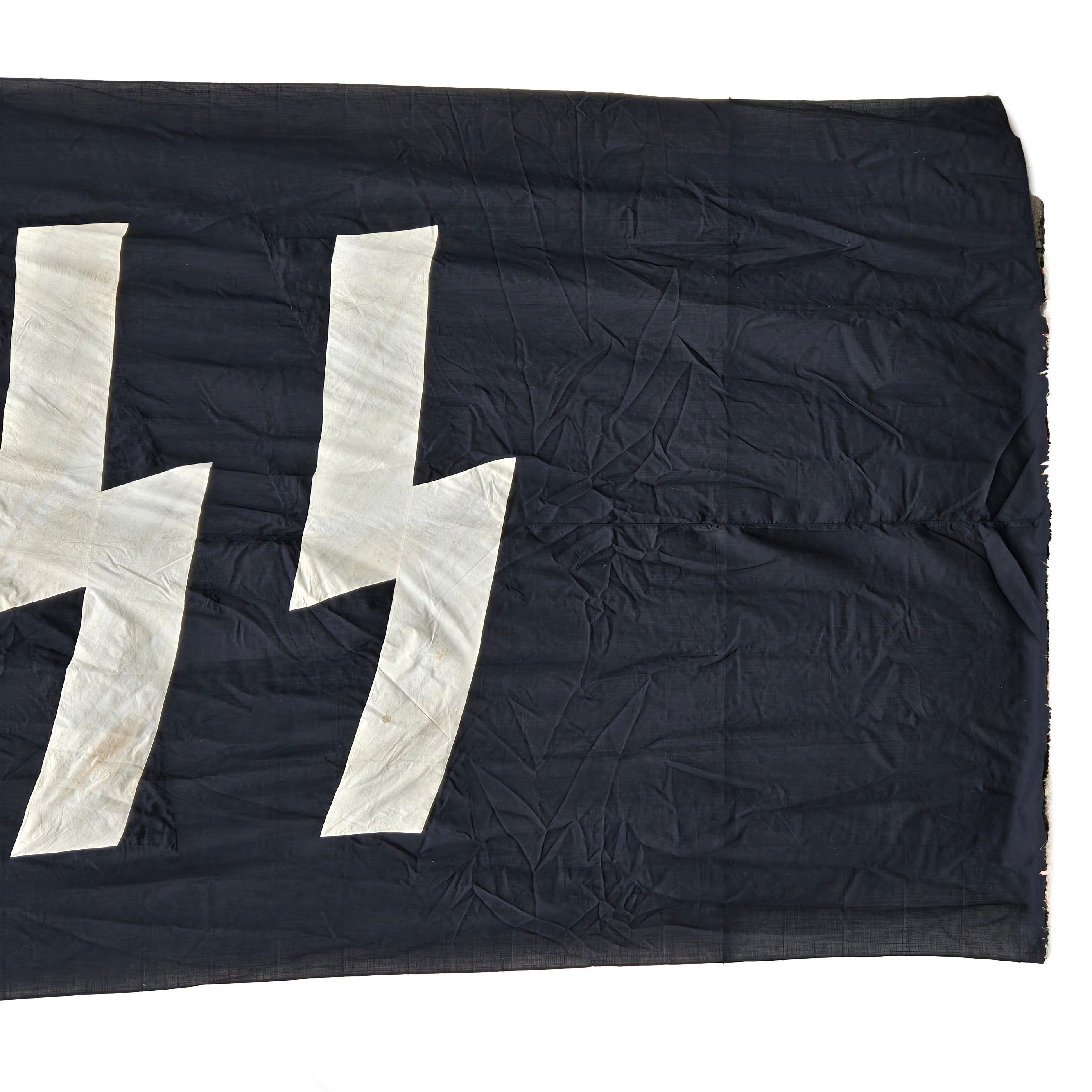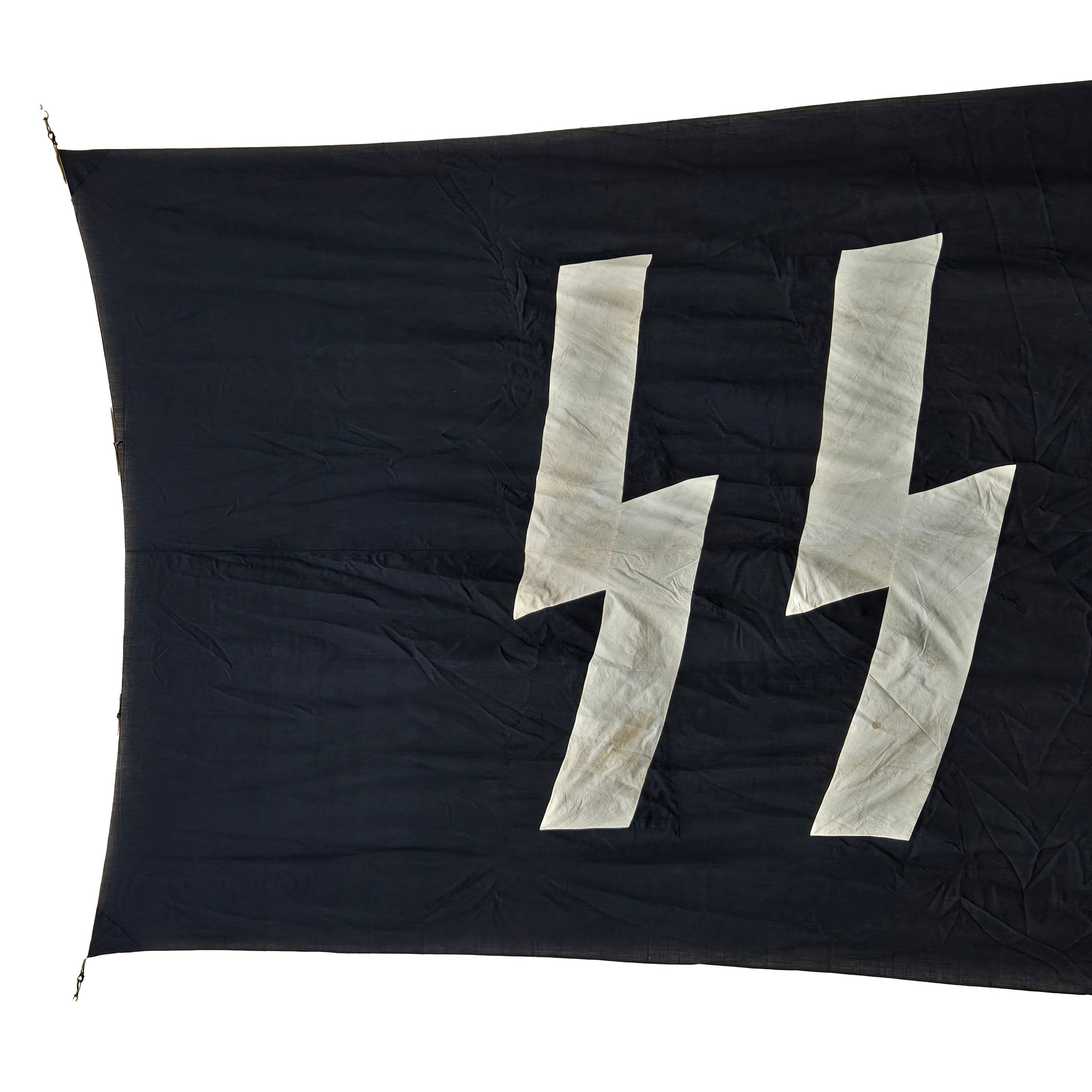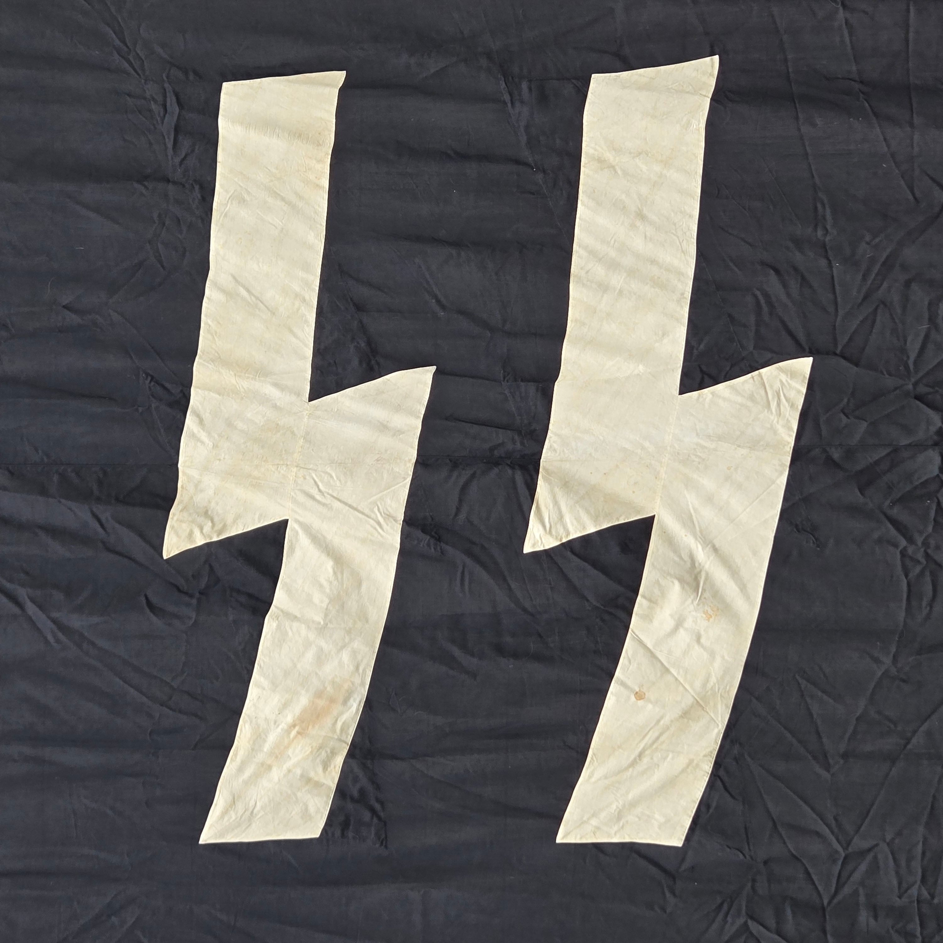 This is a truly phenomenal double-sided flag which depicts the Schutzstaffel ᛋᛋ doppelte Siegrune (Double Sig/Victory Rune) symbols, often called "Lightning Bolts" over a black field. This flag is enormous, and took a long time to properly photograph. The dimensions we were able to take are approximately 114” x 202” (about 9.5ft by 16.8ft), but this is not going to be entirely accurate given how difficult it is to lay this out. The runes are sewn on, not printed, with the stitching still in good shape. They are sewn onto both sides, and are not a “mirror image”.