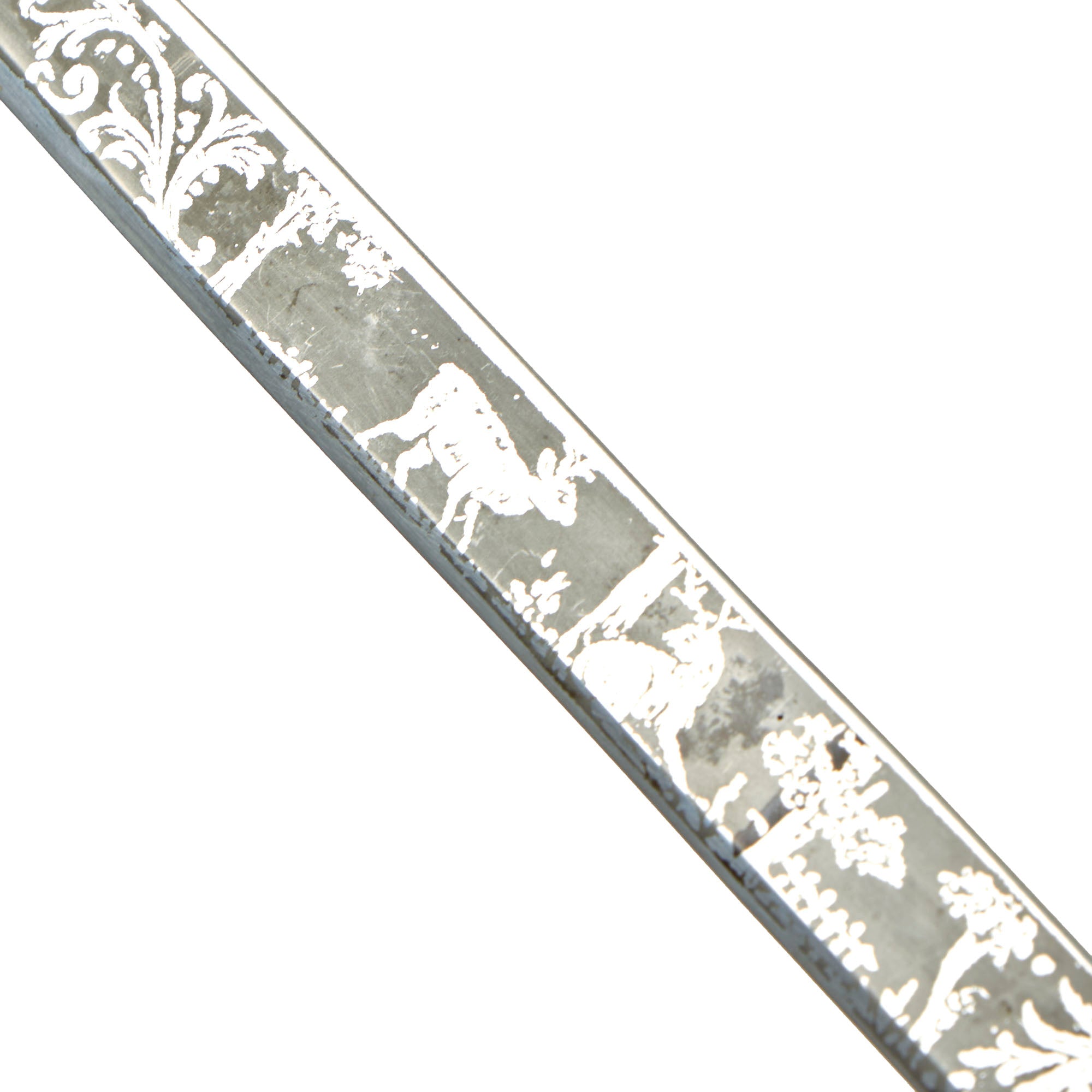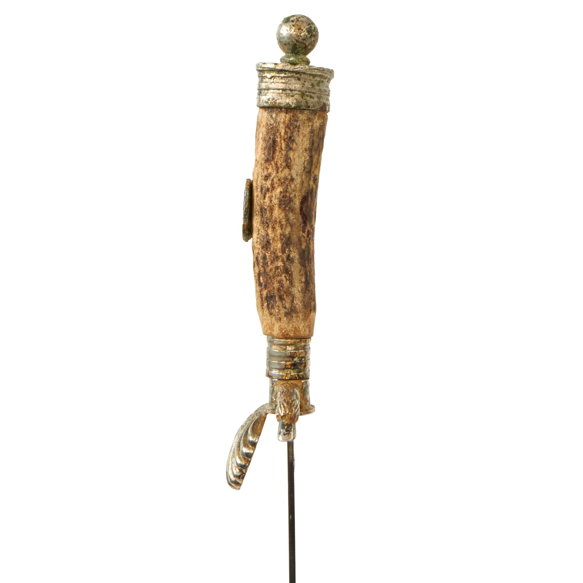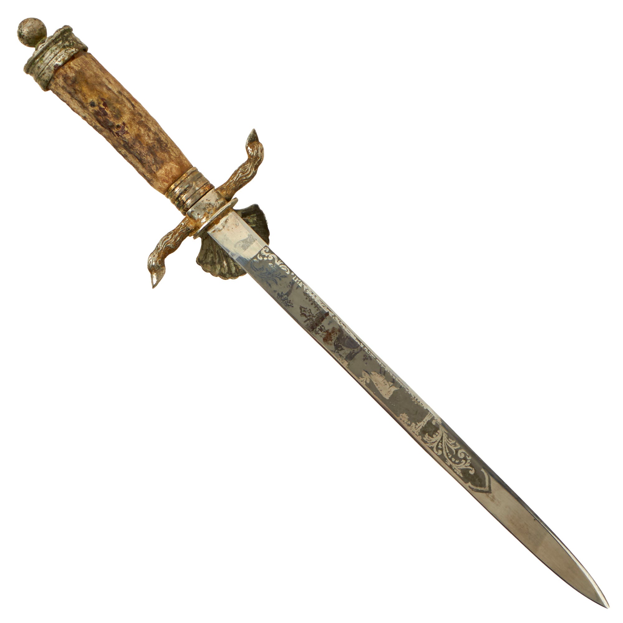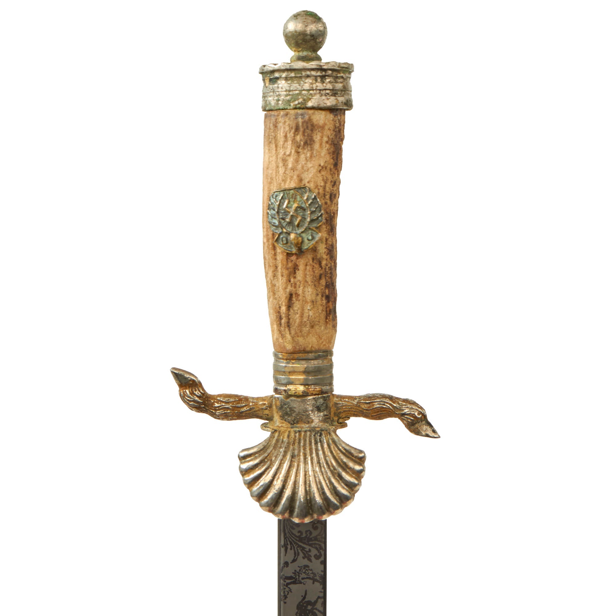 The blade has lovely etched panels on both sides, showing floral engraving as well as animals in the forest. These are very well executed and preserved, with just a bit of oxidation on the plated blade, which is also missing the blade washer, though we do not know if it originally had one. There is no scabbard included.