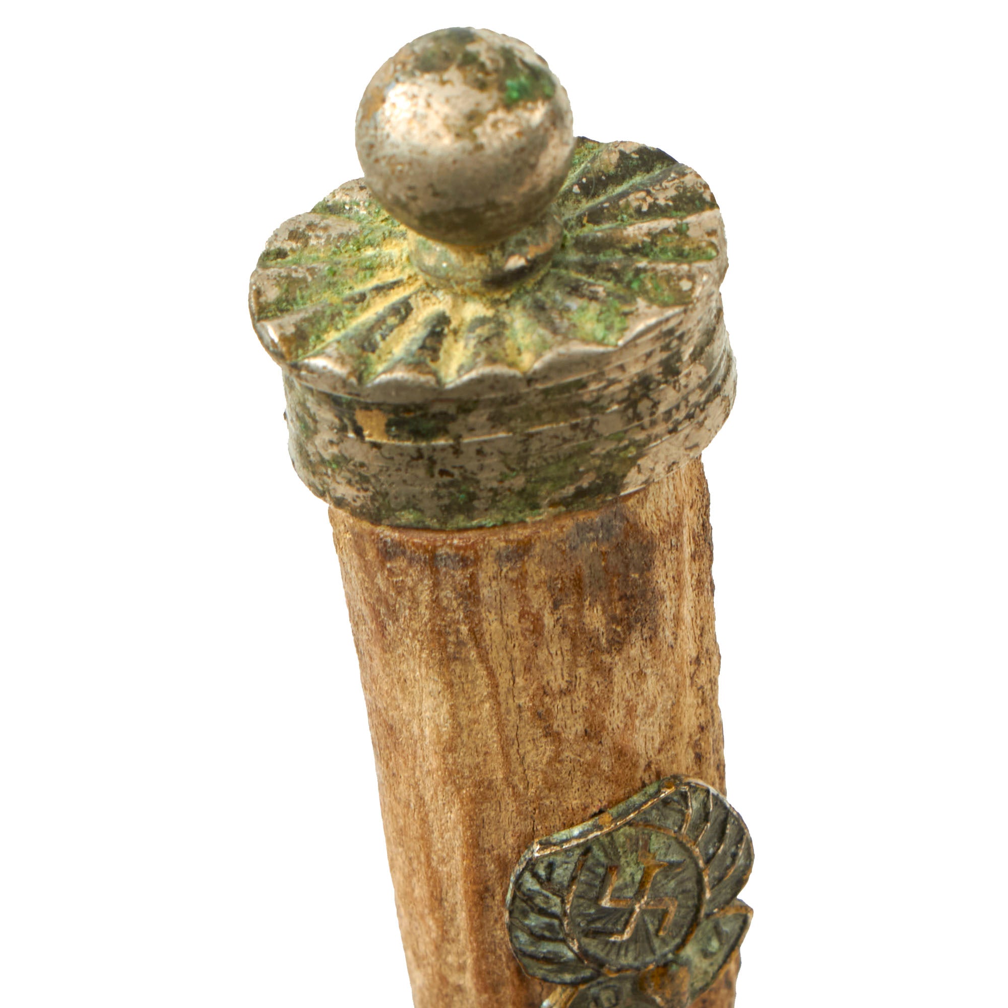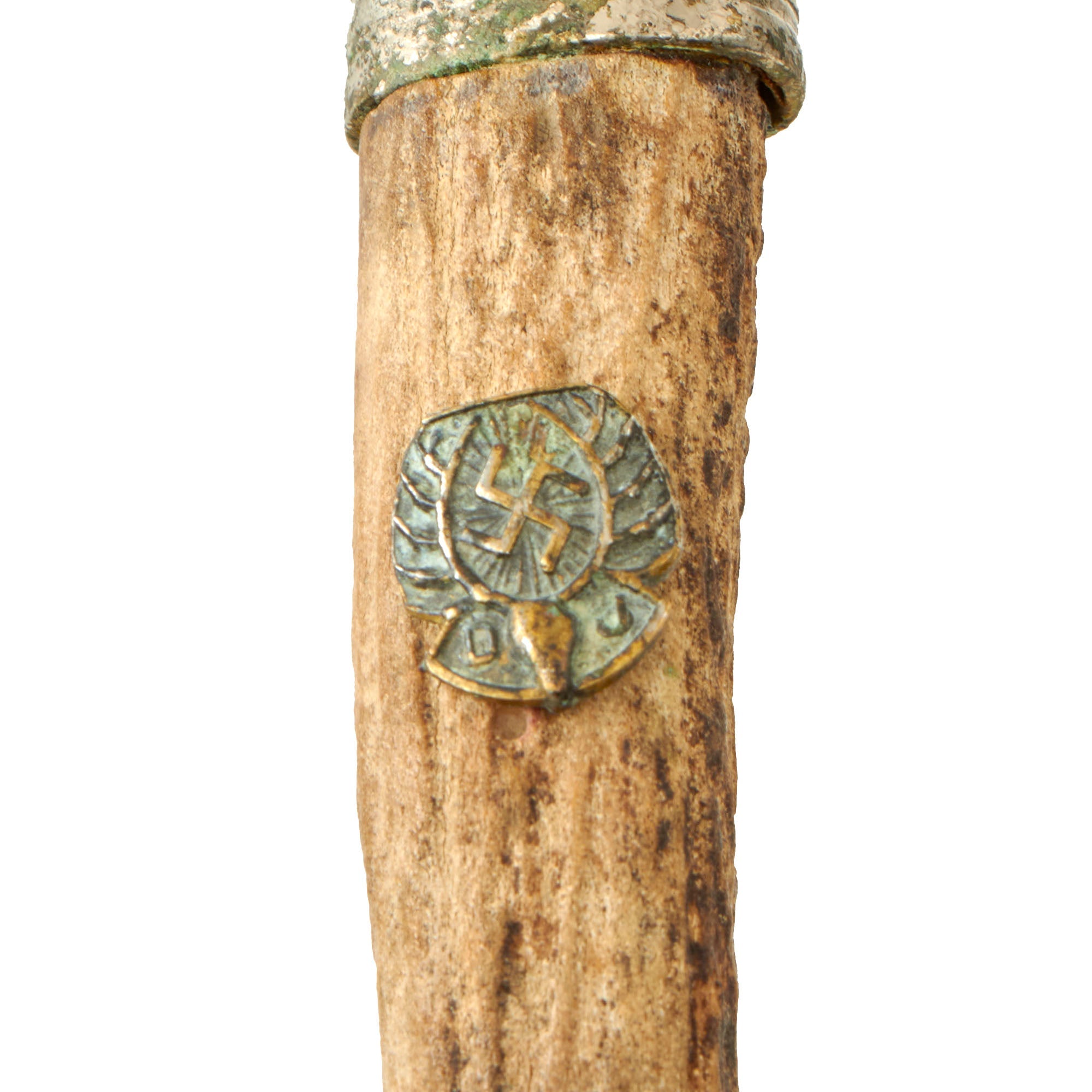 The handle bears an NSDAP Deutsche Jägerschaft (German Hunters) D J insignia on the handle, with a Swas between the antlers of a buck. This is one of the organizations that officially took over for the Forestry associations during the period. It may have been added at some point after 1933.