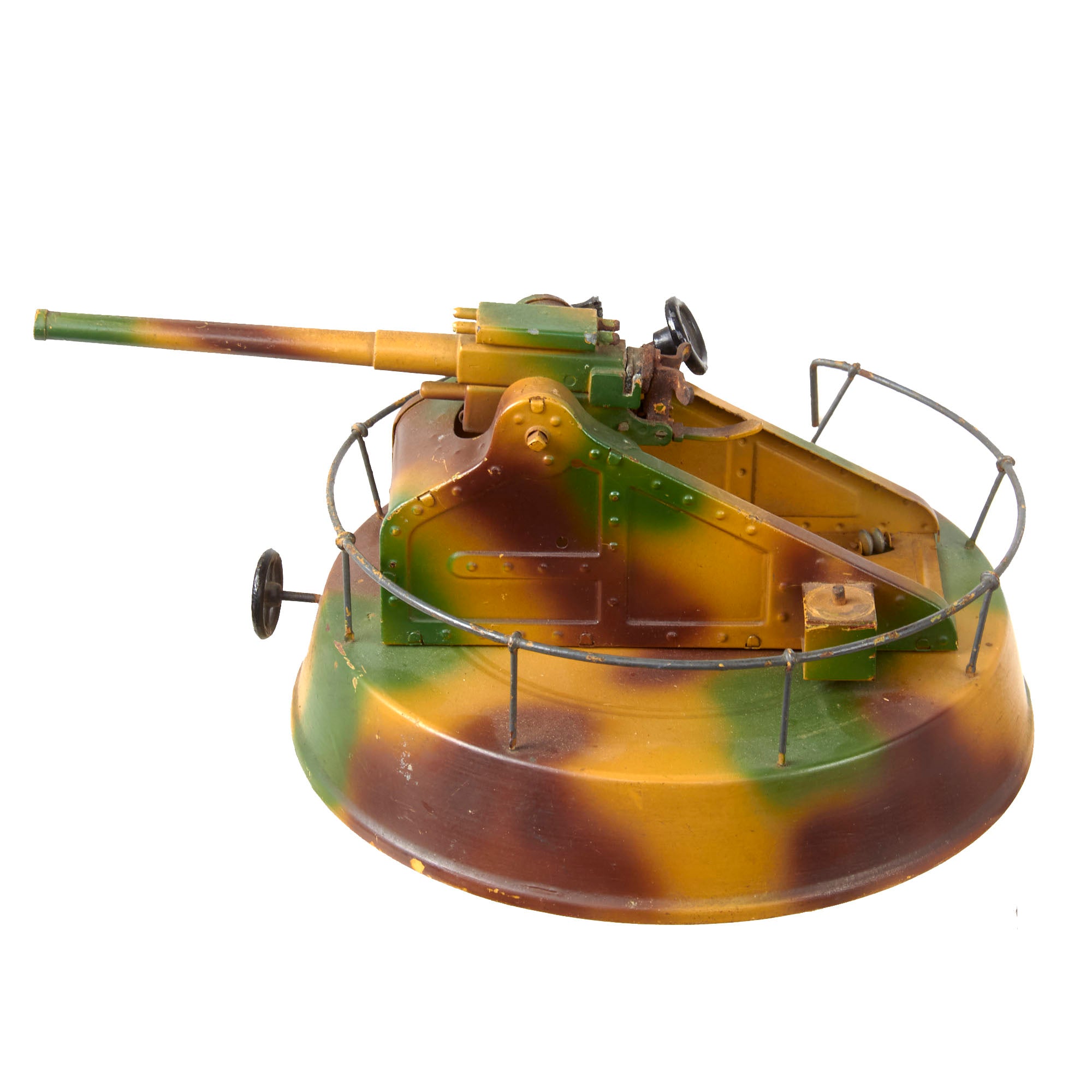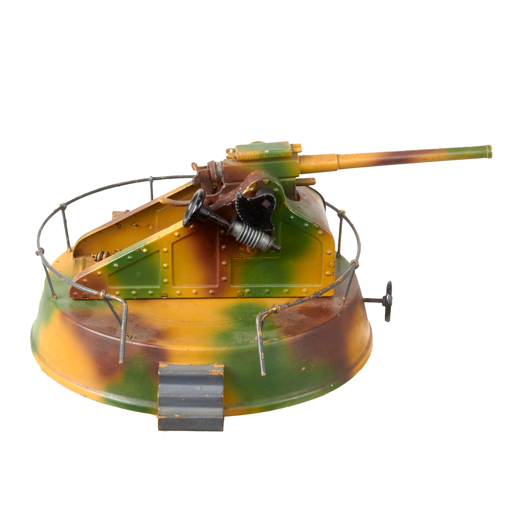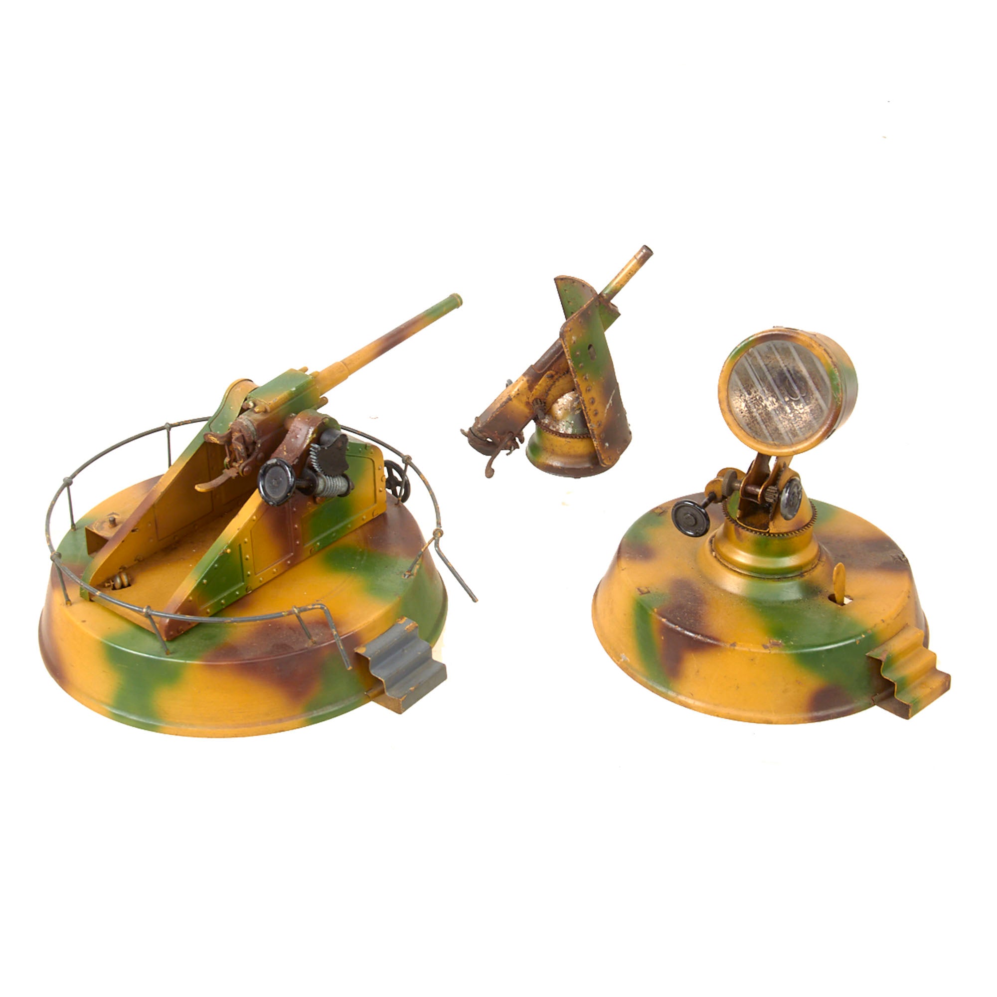 Original Items. Only One Set Available. This is a great set of toy fortress guns and searchlight pieces, which would make a lovely display. They are marked for manufacture by Hausser (O&M Haußer). They made a whole variety of these well made artillery pieces, and these examples have lovely lithograph camouflage paint jobs, which are well-retained.