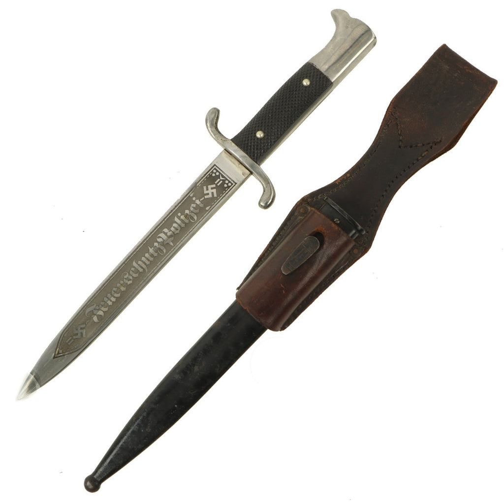 Original Item: Only One Available. The K-98 dress bayonet was a dress version of the combat style, and was worn by enlisted and NCO personnel for dress and parade occasions. This also included civic organizations such as Police and Feuerschutzpolizei (Fire Protection Police) units. The bayonets were finished with a high-quality nickel plating, with often custom grip plates and black enamel painted scabbards. The choice of blade length was left to the purchaser, being nickel-plated short (20cm) or long (25cm) version. There was usually a red or green colored felt insert in the rifle slot and the bayonet was suspended from a black or brown leather frog. Some had a functional bayonet latch, while it was ornamental on some, and others had no latch at all.
