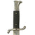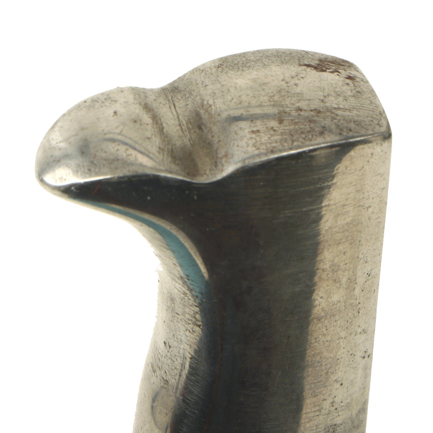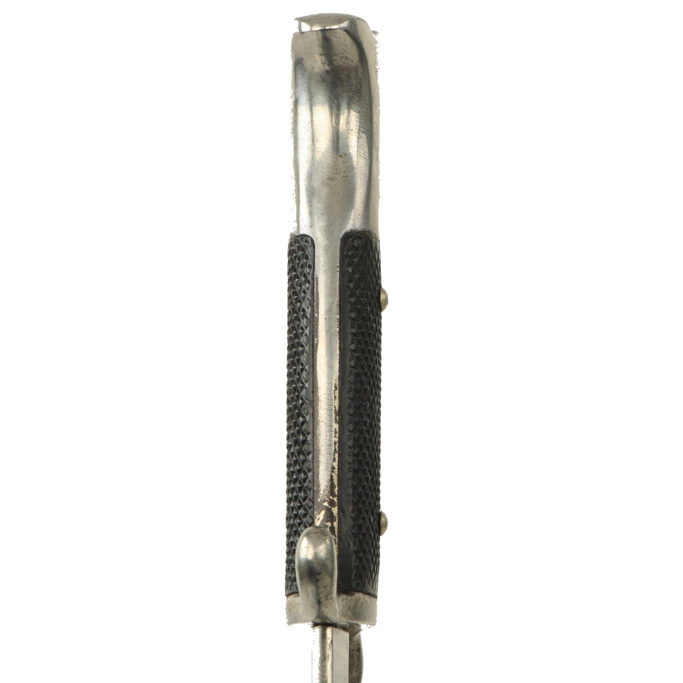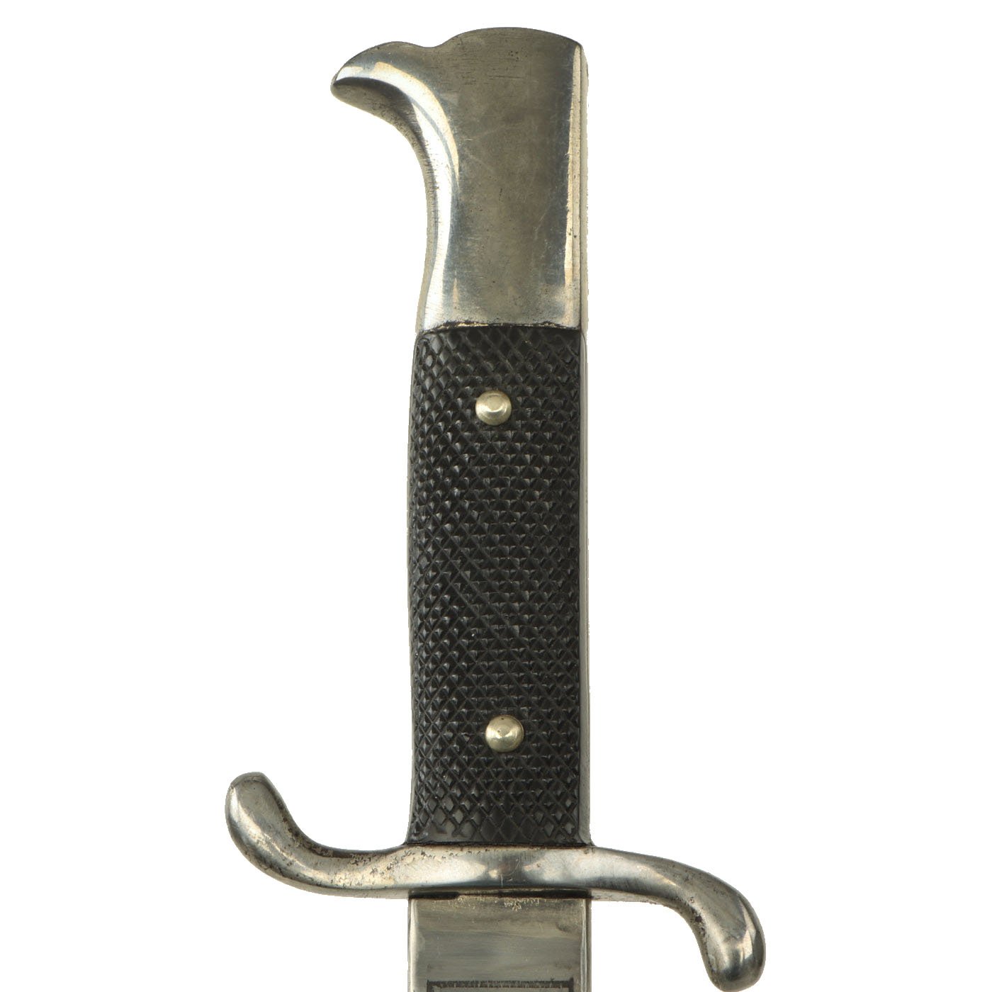 This Fireman's Bayonet is in very good condition throughout, and is the 7 3/4-inch blade "short" version. The nickel hilt plating is bright throughout and remains 90% intact, with just some wear and light oxidation in places. It has the typical "S" shape crossguard used on the Fireman issue bayonet. The grip plates are the checkered black Bakelite type, in excellent condition and retained by nickel rivets with dressed obverse heads.