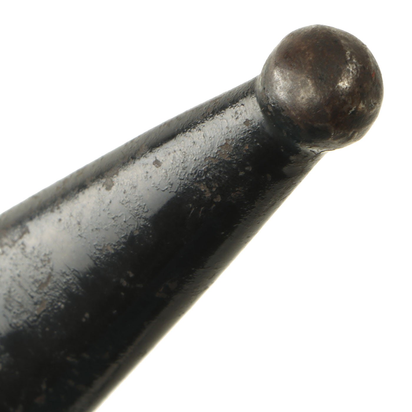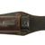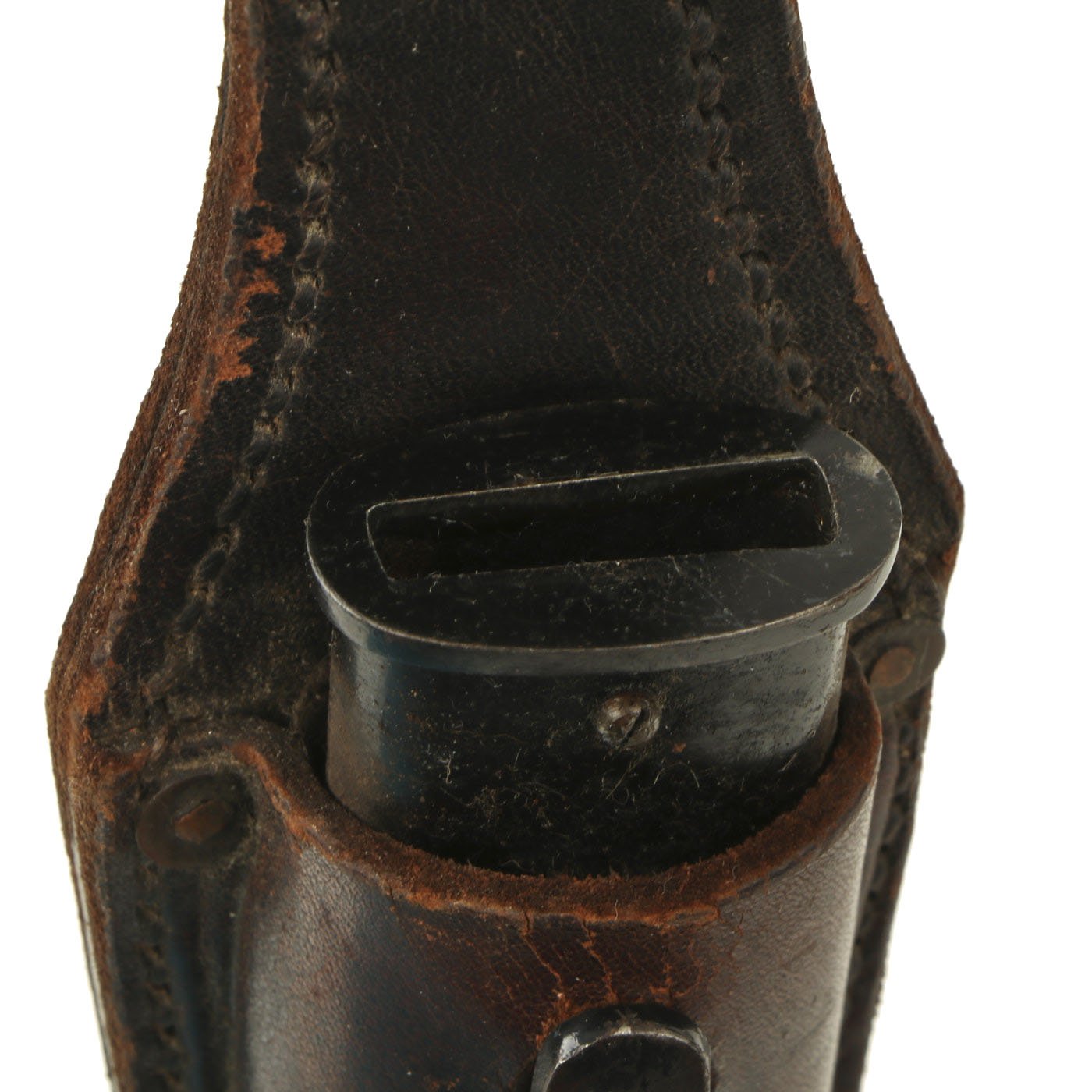 The scabbard is quite nice and still has over 80% of the original black enamel paint, with some checking and crazing between the chipped areas. There are no dents, and just light wear. The body is held by the included black leather frog, which is in very good used condition, with minimal finish cracking. All of the stitching looks to be intact, and it fits the scabbard nicely. It looks to originally have been finished brown, and then refinished in black, which has worn off on the front side.